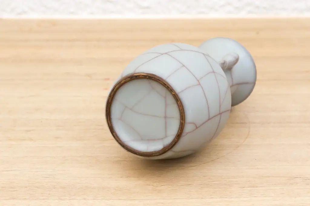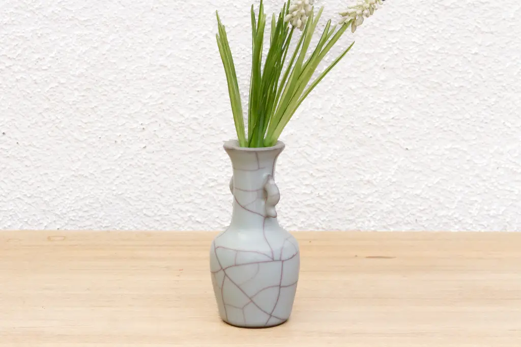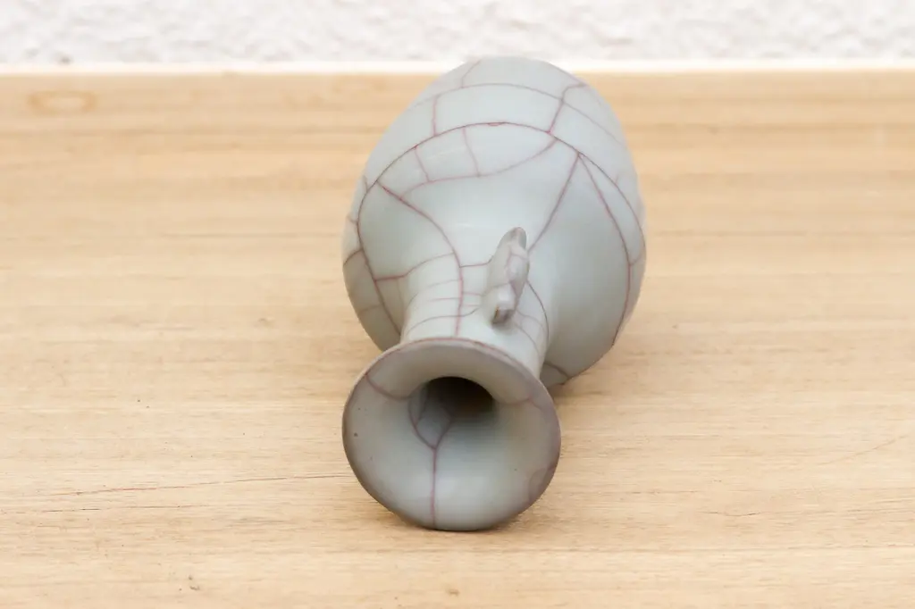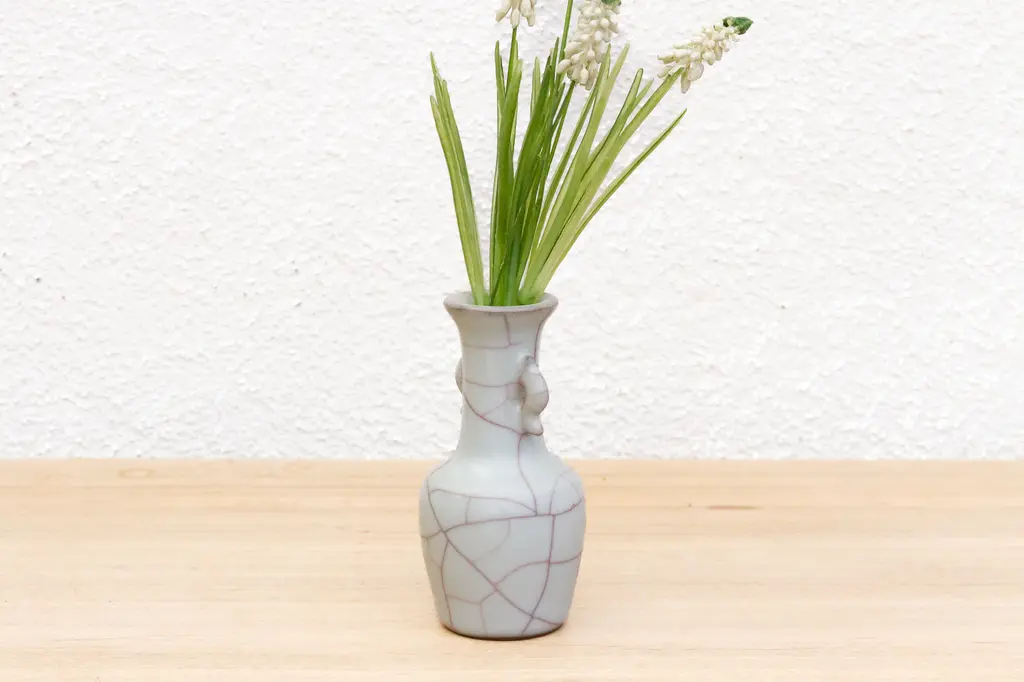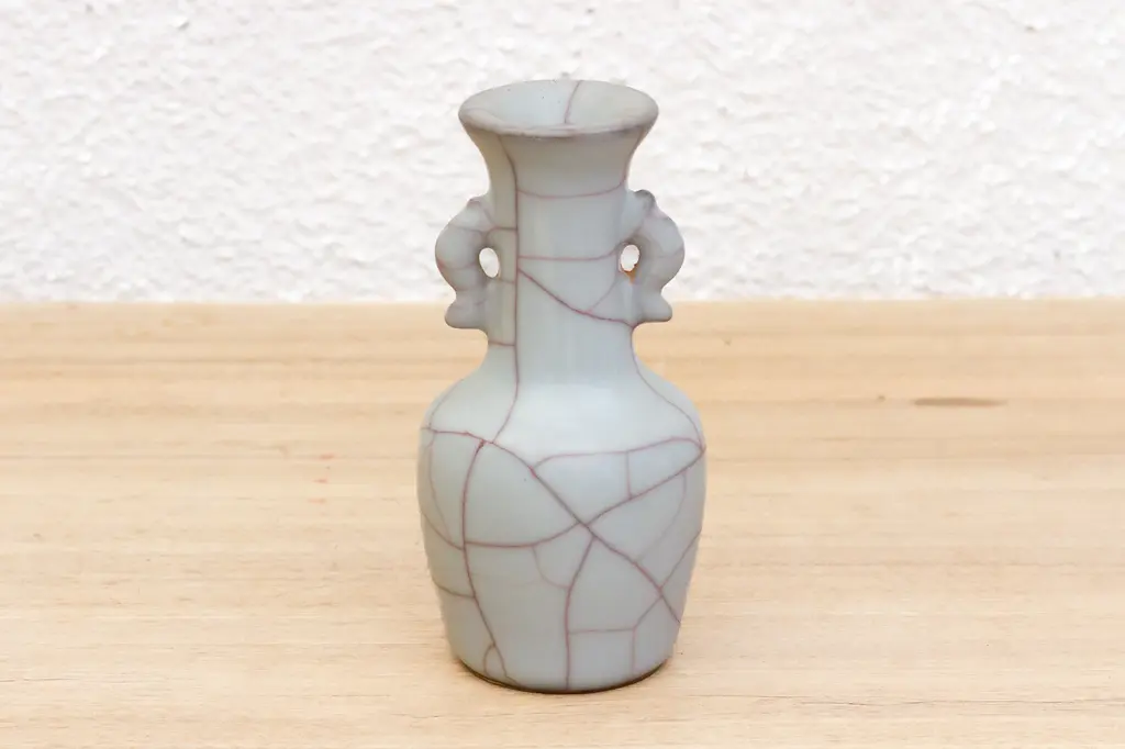 A splendid miniature Ge-type crackle vase. Its soft, pale glaze, adorned with the mesmerizing 'golden thread and iron wire' crackle pattern, evokes a sense of quiet contemplation and timeless elegance. The vase's petite form, rising gently to a slender neck, is flanked by stylized animal-mask handles, adding a touch of antique charm. The intricate crackle, like a delicate map of time, enhances its tactile appeal and visual intrigue.