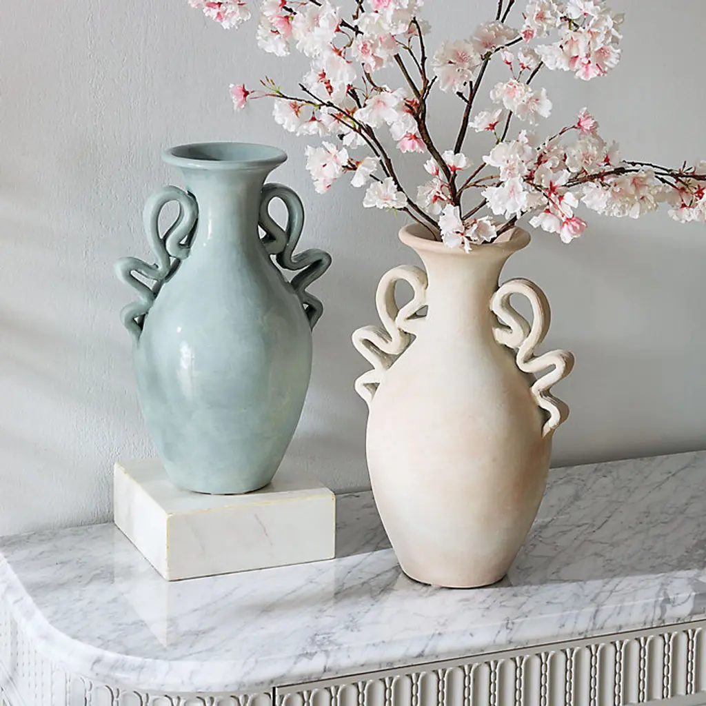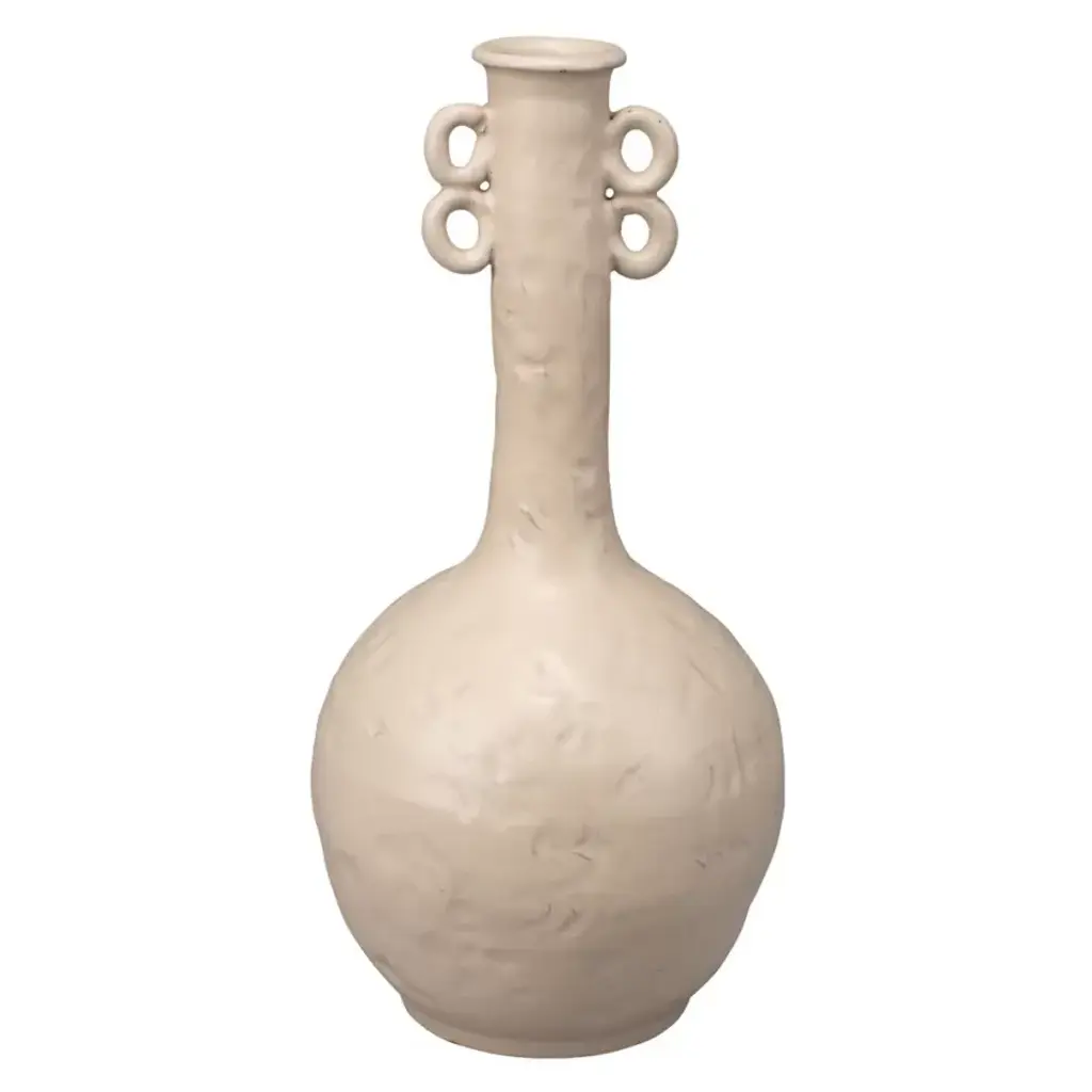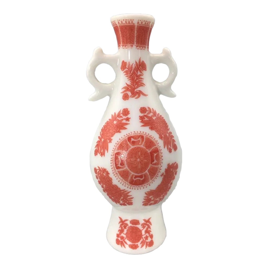 A splendid miniature Ge-type crackle vase. Its soft, pale glaze, adorned with the mesmerizing 'golden thread and iron wire' crackle pattern, evokes a sense of quiet contemplation and timeless elegance. The vase's petite form, rising gently to a slender neck, is flanked by stylized animal-mask handles, adding a touch of antique charm. The intricate crackle, like a delicate map of time, enhances its tactile appeal and visual intrigue.