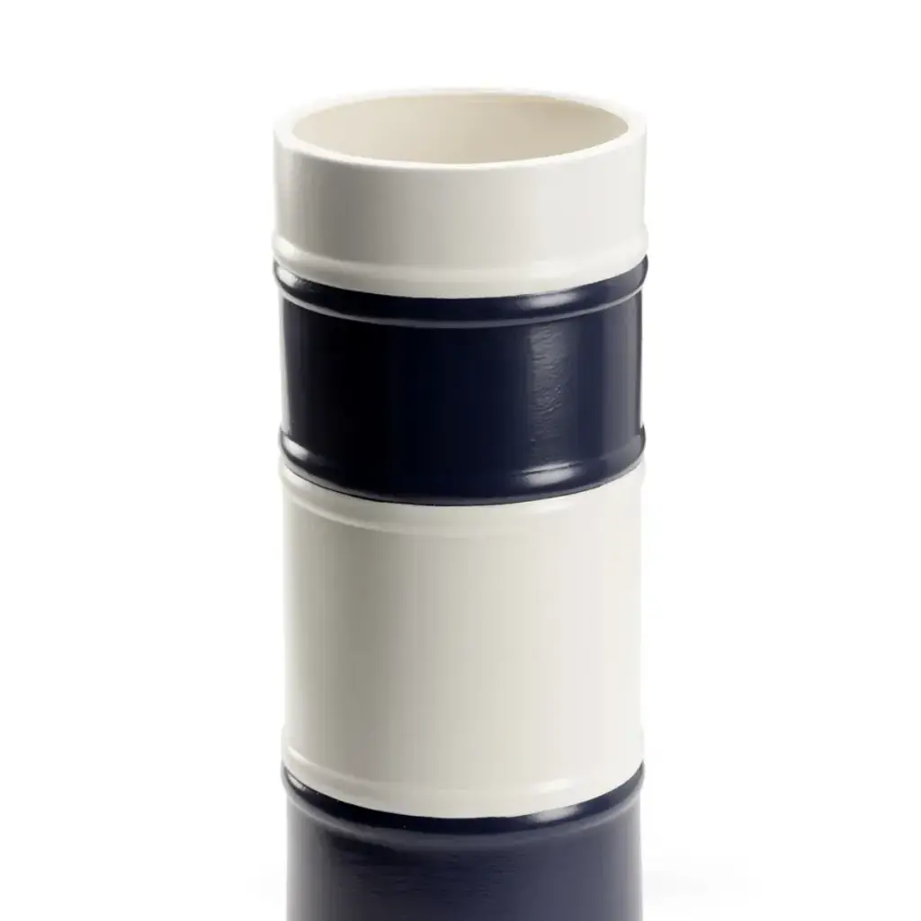 BASED ON NAUTICAL RACING FLAGS, THIS CRISP NAVY AND WHITE VASE WORKS WELL ALONE OR PAIRED WITH ITS COMPANION REGATTA VASES (385040,385042) TO FORM A PERFECT GROUPING IN MODERN OR COASTAL INTERIORS. DESIGNED BY JAMIE MERIDA.