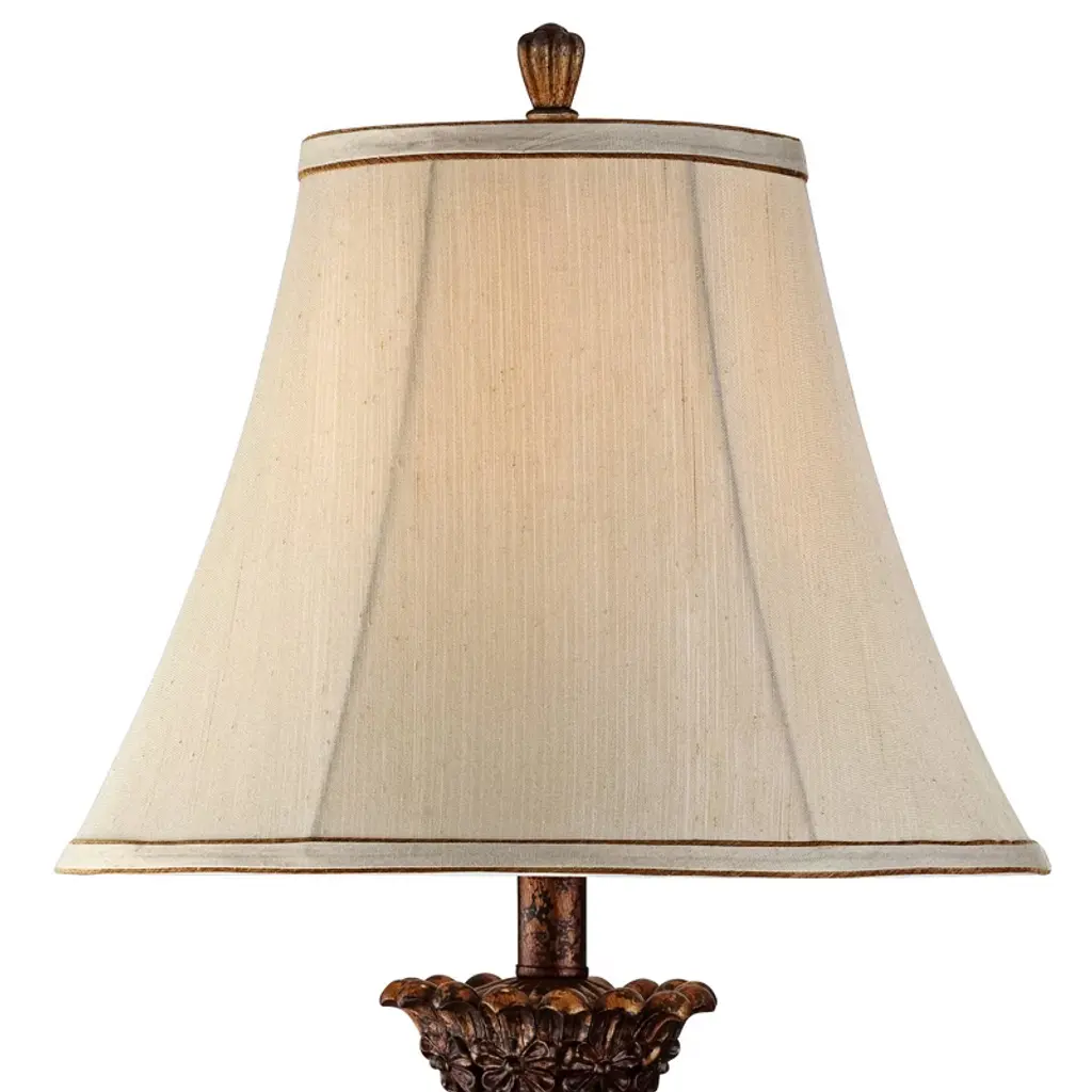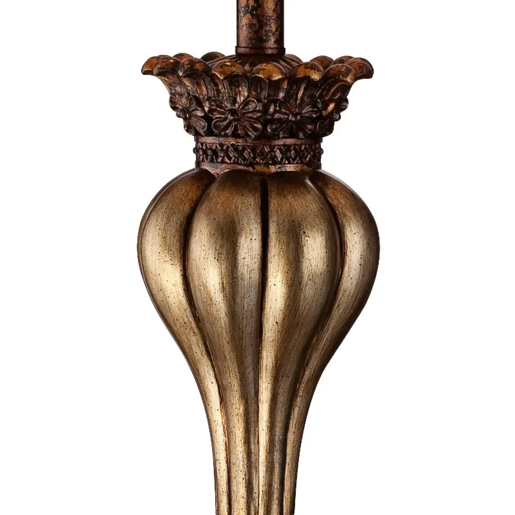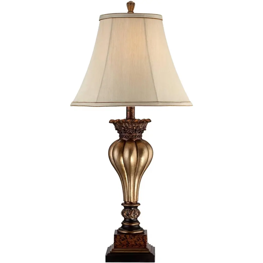 Add some elegance to your decor with this set of two table lamps featuring a fluted bulb silhouette and sparkling gold finish. Floral details at the top and a black of each lamp join a rectangular base offering a classic look. Delicate bell shades and matching finials top off this timeless, artisan piece. This set from the Regency Hill collection of table lamps is a perfect addition to your transitional or classic decor.