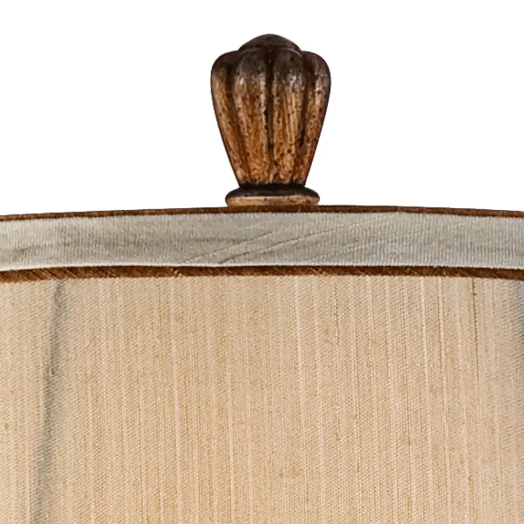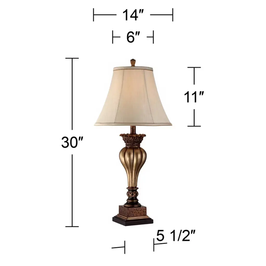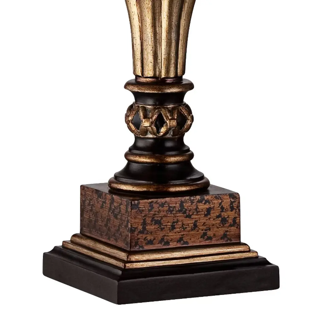 Add some elegance to your decor with this set of two table lamps featuring a fluted bulb silhouette and sparkling gold finish. Floral details at the top and a black of each lamp join a rectangular base offering a classic look. Delicate bell shades and matching finials top off this timeless, artisan piece. This set from the Regency Hill collection of table lamps is a perfect addition to your transitional or classic decor.