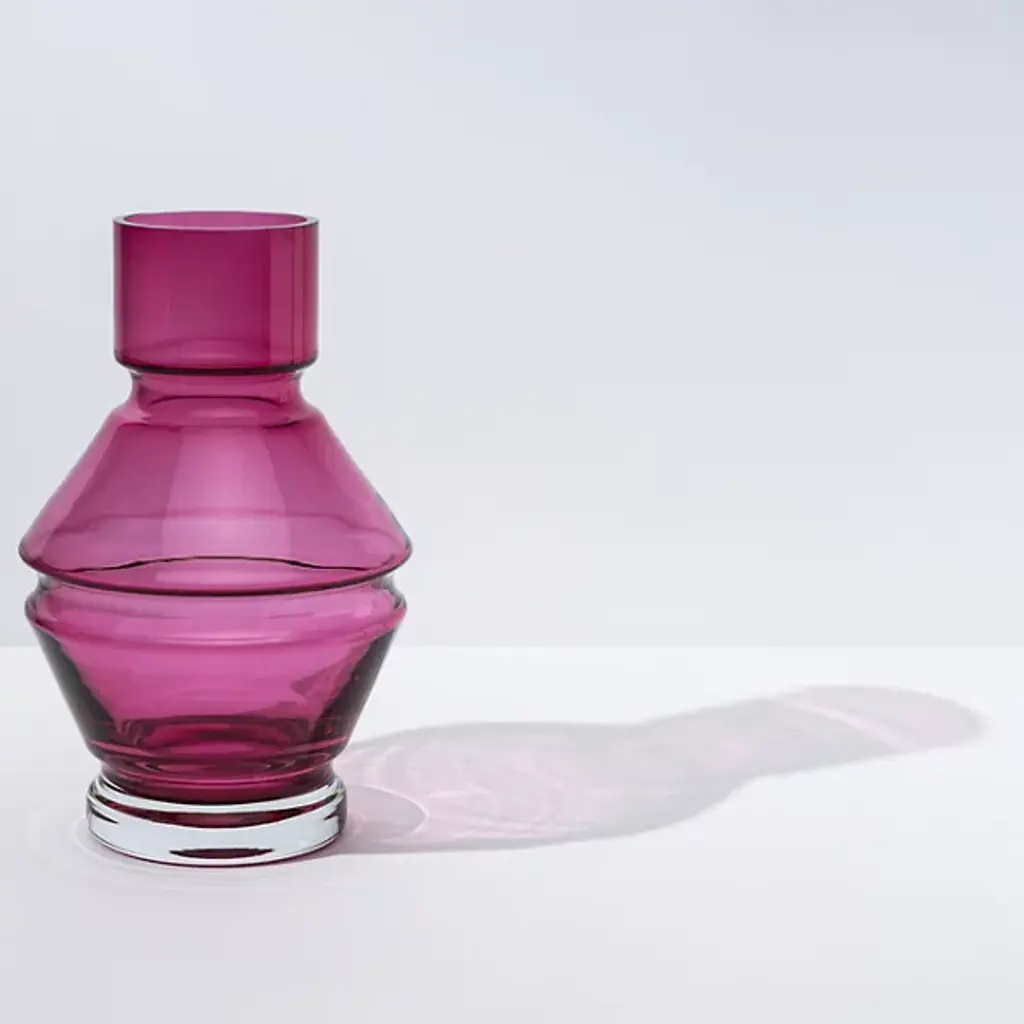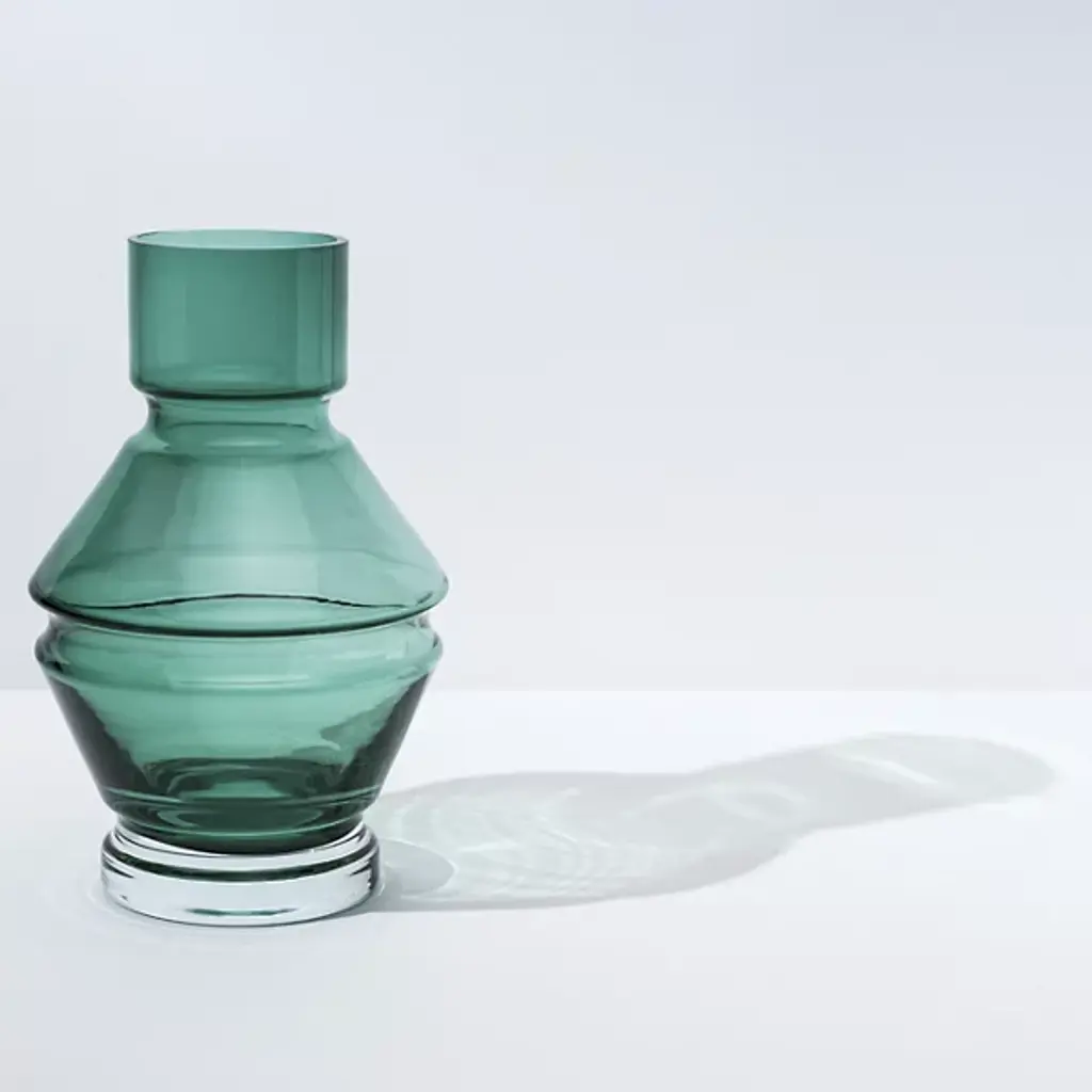 The Relae Vase from Raawii shows off an ephemeral contemporary character enhanced by fine contours. A Nicholai Wiig-Hansen design made in Portugal, it’s fashioned from tinted glass counterpointed by small clear accents. The simple geometric forms contrast cylinder shapes with beveled layers, capturing ambient light and transforming it into a gem-like glow.