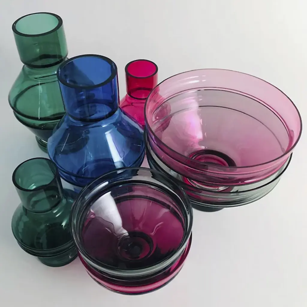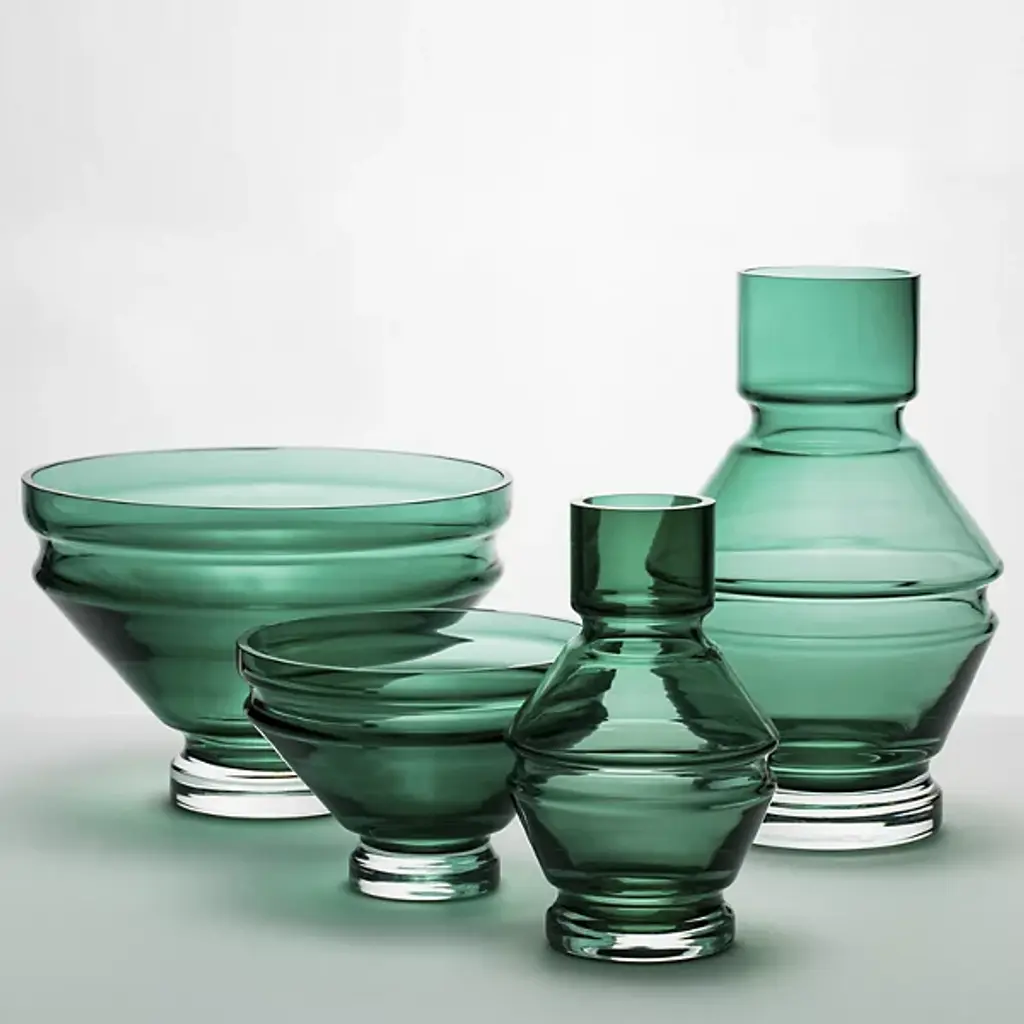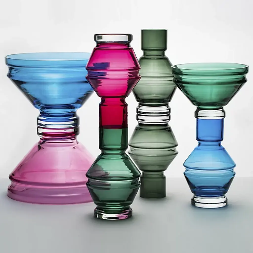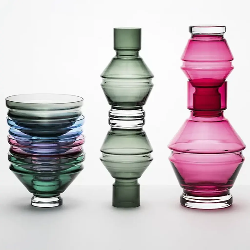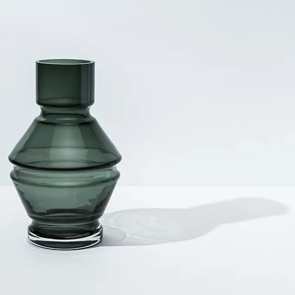 The Relae Vase from Raawii shows off an ephemeral contemporary character enhanced by fine contours. A Nicholai Wiig-Hansen design made in Portugal, it’s fashioned from tinted glass counterpointed by small clear accents. The simple geometric forms contrast cylinder shapes with beveled layers, capturing ambient light and transforming it into a gem-like glow.