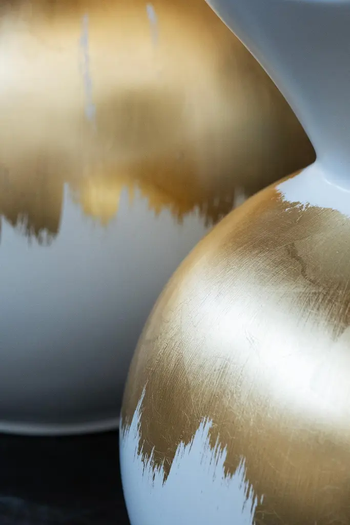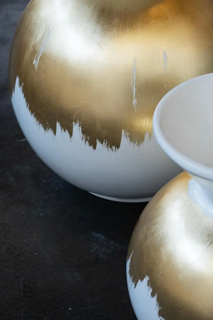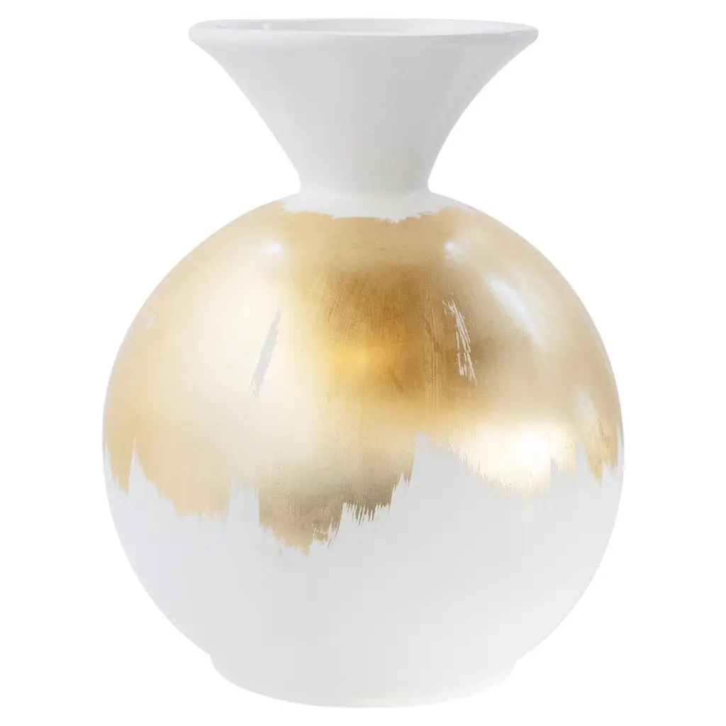 Resin Decorative Vase White Gold Leaf, Lusitanus Home Collection, Handcrafted in Portugal - Europe by Lusitanus Home.This beautiful decorative vase is lacquered in white cotton lacquer and has details in gold leaf applied by hand.Waterproof.Resin Decorative Vase materials codesFI190 White cotton lacquer; satin finishFI094 Gold leaf ; satin finishHandcrafted in Portugal - Europe by GreenappleUnique by design, Crafted by peopleFounded in 2005 by Sérgio Rebola and Rute Martins, Greenapple designs and produces in-house luxury furniture for exclusive customers worldwide.Our own in-house production facility allows us to be obsessed with detail, and gives us the freedom to dedicate ourselves to the most demanding tailor-made and customized work. As Rute designs all the unique pieces, Sérgio assures the high-quality standards through the whole process - from design to production; from production to your home. Fine craftsmanship, whether perfected by experienced hands or state-of-the-art machinery is quintessential in delivering top quality experiences.