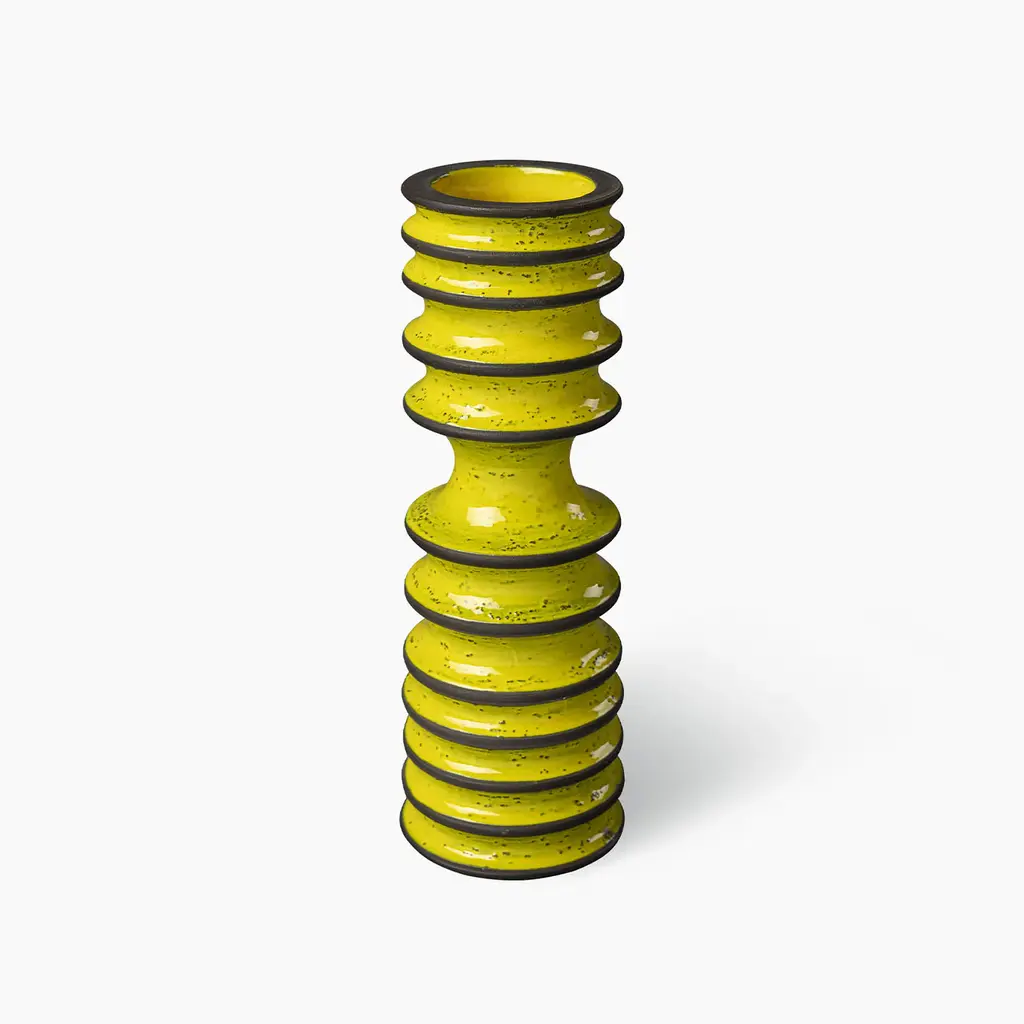This exquisite vase will add an intense dash of color to any interior thanks to the intense hue of yellow it is enameled with. The evident, ribbed texture defining its profile results particularly emphasized at the center with borders accented in brown. Part of the Revolver Collection, the piece was showcased at the prestigious Milan Design Week in 2019.