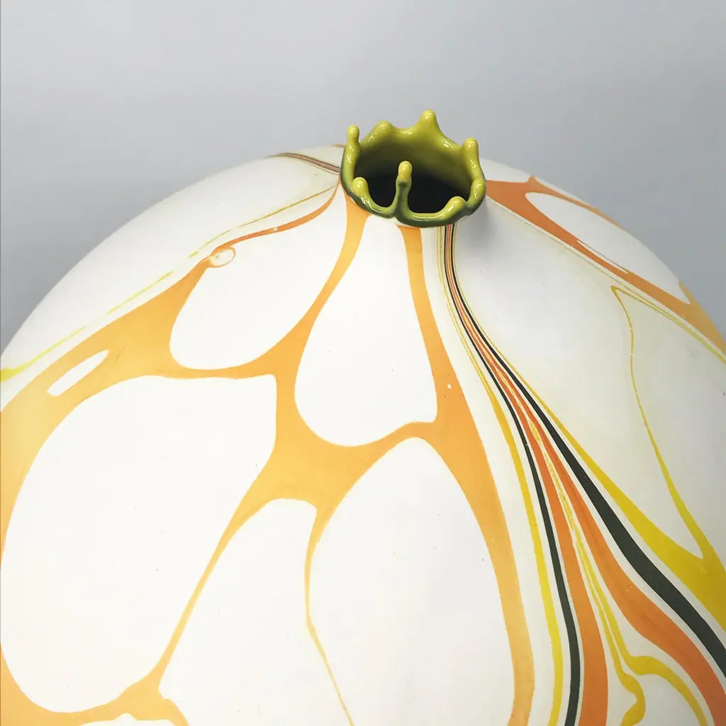 Rhea round hydro vase by Elyse GrahamDimensions: W 20 x D 20 x H 23 cmMaterials: Plaster, ResinMolded, dyed, and finished by hand in LA. CustomizationAvailable.All pieces are made to orderOur new Hydro Vases take on a futuristic appearance as the signature saturated veining runs across a new muted background. With this new palette we began to imagine the possibility of otherworldly landscapes and waterways as seen from above. Inspired by the bold colors of our Hydro Collection and the muted tones of our Landscape Collection we have named all of our new Hydro Vases after the many moons of Saturn. Each vessel is hand-cast with hydrocal plaster inside of a unique balloon shape. The interior of each piece is poured with layers of resin, making it waterproof. We have developed a unique process for pigmenting the exterior of the vases that is based on the technique used for marbling paper. Each vessel is sealed with a UV resistant acrylic coating.Much like the satellites that inspire them, the pattern on each piece is unique.MEET OUR TEAMElyse Graham is the founder and creative director of the studio. Driven by Elyse’s unique vision of building a studio that fosters and emphasizes connection, play, and experimentation (of people, processes, and in turn the objects created and shared) our small team works closely and collaboratively on each project. Elyse received a BA in sculpture and semiotics at Brown University. After years of making sculpture and running a business in jewelry design, Elyse decided to merge her separate practices and redirect her attention toward collectible design in 2013. The creative trajectory of the studio is heavily influenced by Graham’s background in fine art, specifically her interest in process-driven and material-based artwork. The studio’s vocabulary of shapes, patterns, and forms comes from a lineage of unconventional processes Graham has developed and built for working with plaster and resin. Graham shares her studio as well as her home with her husband, Lewis Mauk and their daughter, Eero. Miller Robinson is head of our production department. From pigmenting and casting materials for all of our products in plaster and resin to graphic and production design, they wear many hats in our studio. Miller joined our team in 2014 and has been an integral part of designing many of our experimental processes that have lead to the creation of our unique MetaMATERIAL. Like Elyse, Miller has a background in material and process-oriented making, which led to an instant connection and collaborative understanding between the two. Miller received their BFA from Otis College of Art and Design with a focus on painting, installation, performance, and writing. Their individual art practice focuses on the preservation and potentialities of underrepresented histories and encompasses objects, garments, actions, tattooing, and books. Their personal work has been exhibited in Los Angeles at the Southwest Museum, Los Angeles Municipal Art Gallery, Heritage Square Museum, and with Los Angeles Contemporary Exhibitions (LACE), as well as HORESEANDPONY Fine Arts in Berlin.Lewis Mauk is our studio and operations engineer. Working on facilities and production design as well as engineering and leading all of our large-scale constructions and installations, Lewis’ unique set of technical skills gives form and structure to our studio’s unconventional ideas and processes. Lewis has been working behind-the-scenes since the creation of the studio but joined our team full-time in 2020. Consistent with the rest of our team, Lewis has a background in process-driven fine art and has extensive training in woodworking, printmaking, and photography. He received a MFA from CalArts and has worked across the fields of education and fabrication. Lewis’ combined interest in the creation of personal archives mixed with his commitment to sustainable life practices, has brought a focus and important emphasis on designing studio projects and processes that imagine ways to reduce and reuse studio material fragments.