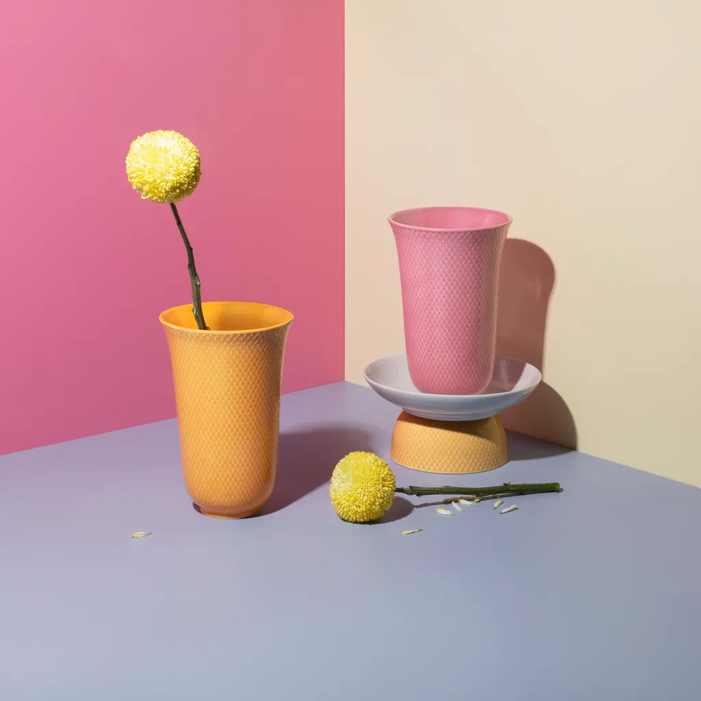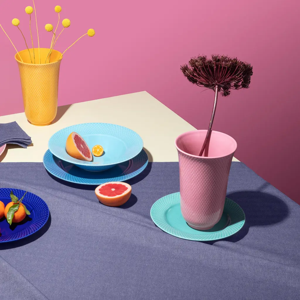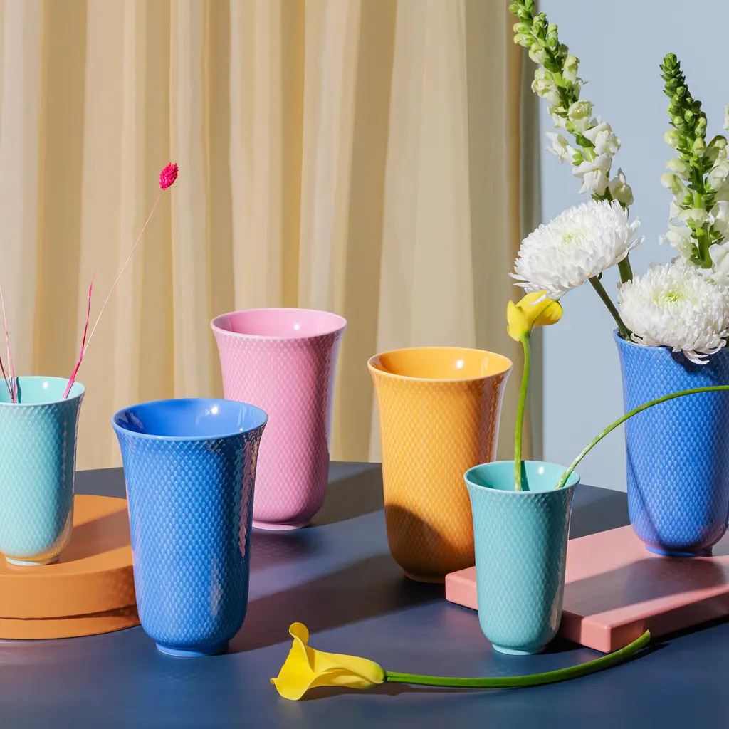 Straight body, slight flare at the rim—more tulip than cylinder. Drop a few stems in and they find their own stance. A transparent glaze lets the Rhombe relief read through the surface; under window light the geometry shows up like a soft grid. Developed with Stilleben, it lands firmly in the Rhombe family without feeling formal. Colors are rose, yellow, blue, and aqua. Rose/yellow/blue stand 7.9″ tall; the aqua is 5.9″—good for shorter stems or a single bloom. These shades are end-of-line, so once they’re gone, they’re gone. Porcelain, dishwasher safe.