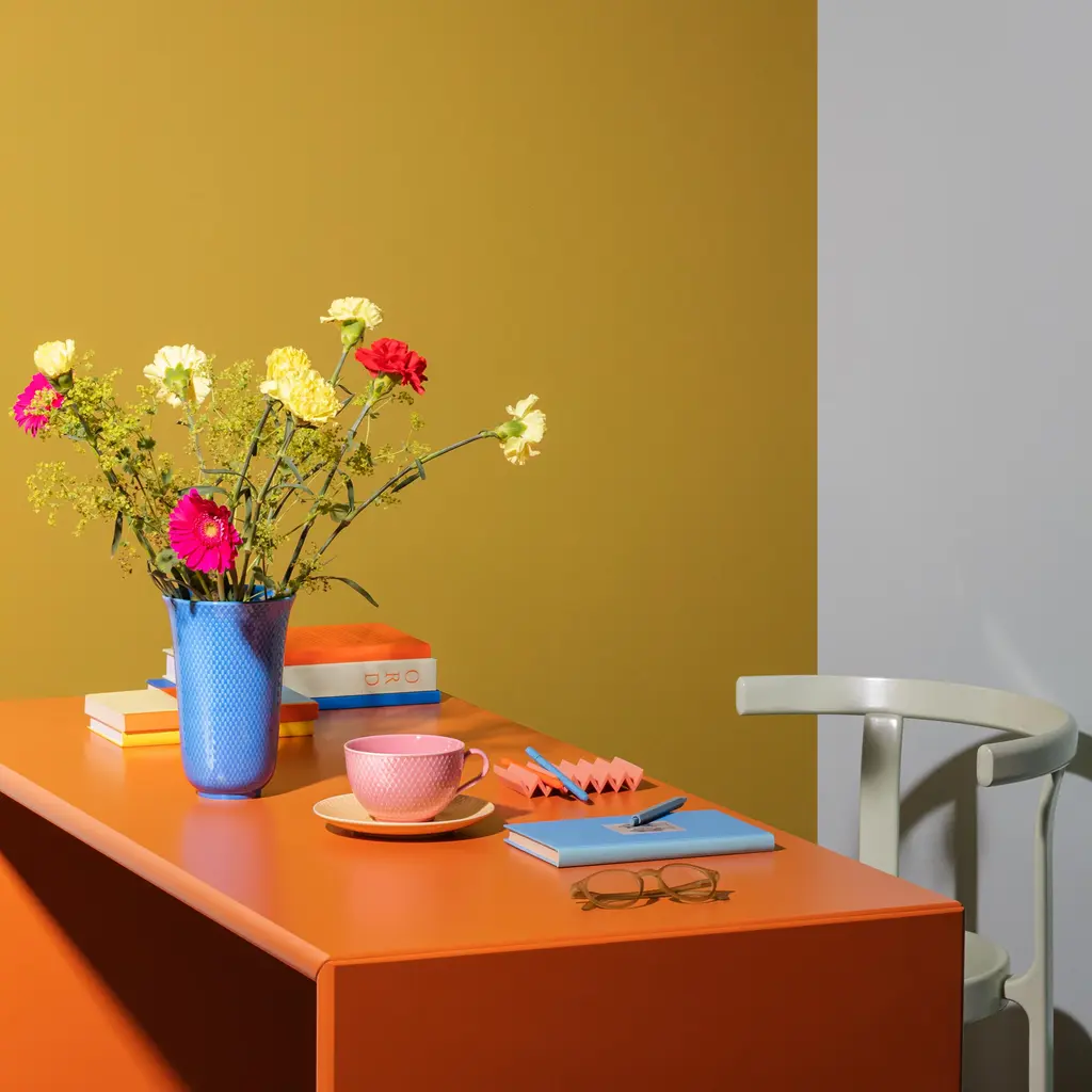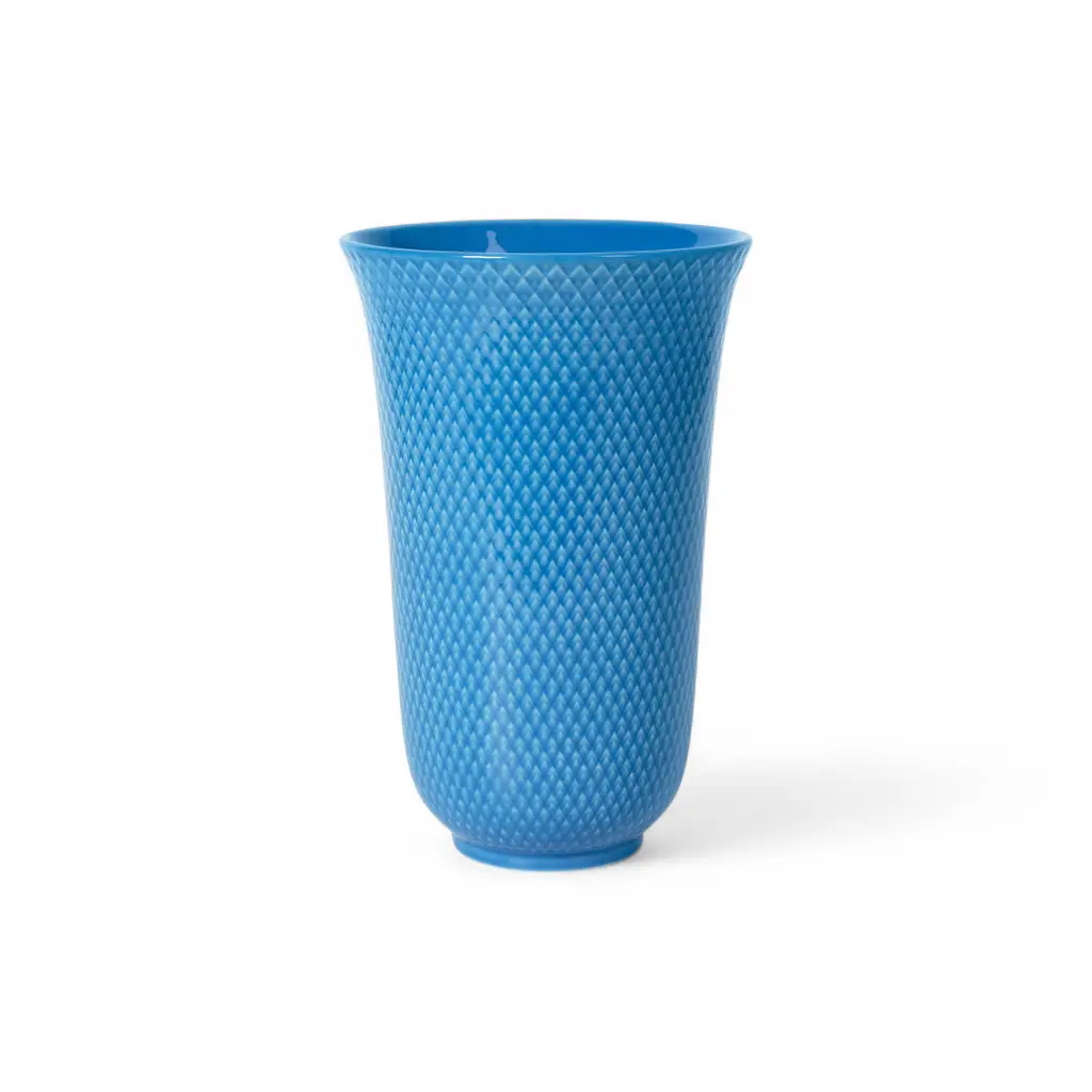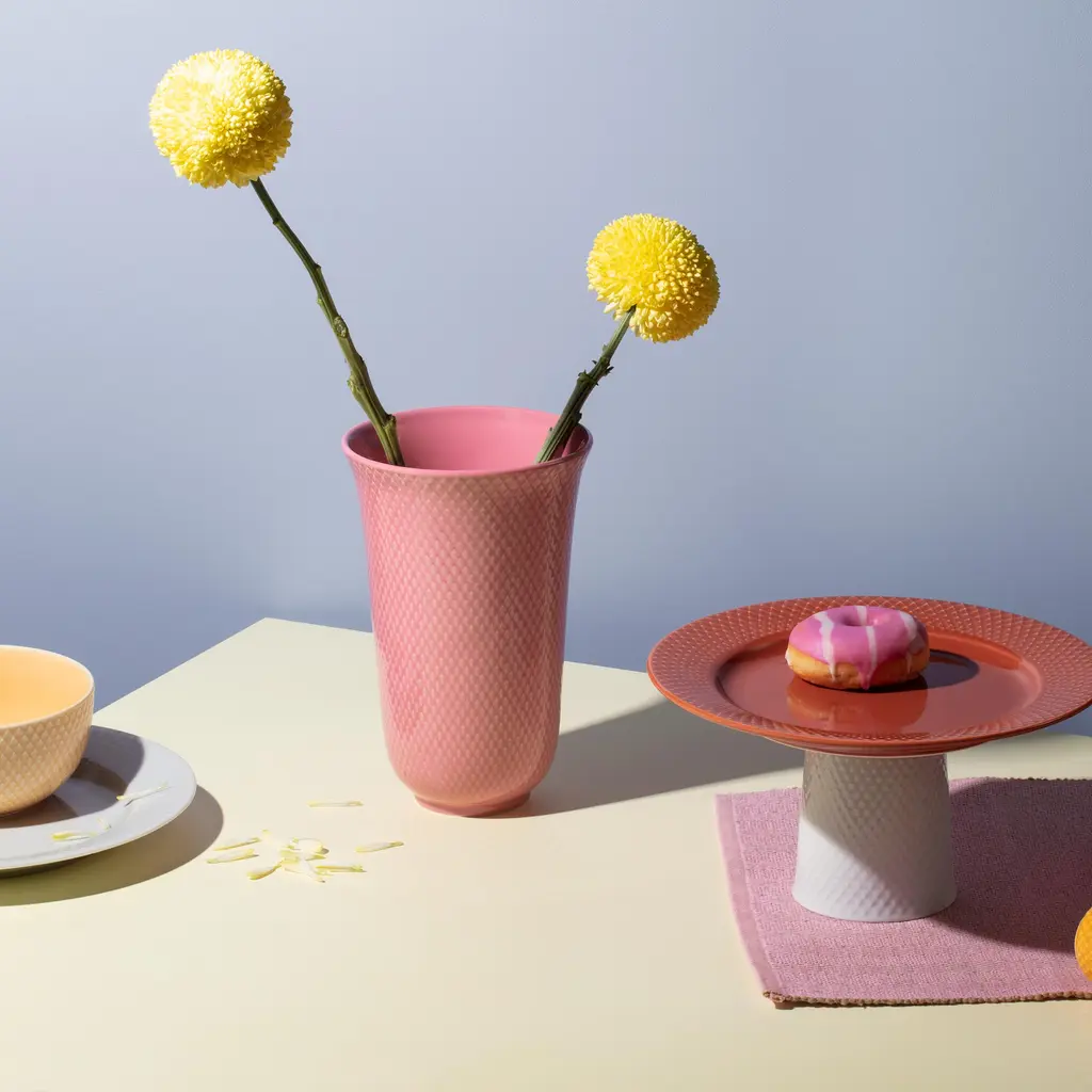 Straight body, slight flare at the rim—more tulip than cylinder. Drop a few stems in and they find their own stance. A transparent glaze lets the Rhombe relief read through the surface; under window light the geometry shows up like a soft grid. Developed with Stilleben, it lands firmly in the Rhombe family without feeling formal. Colors are rose, yellow, blue, and aqua. Rose/yellow/blue stand 7.9″ tall; the aqua is 5.9″—good for shorter stems or a single bloom. These shades are end-of-line, so once they’re gone, they’re gone. Porcelain, dishwasher safe.