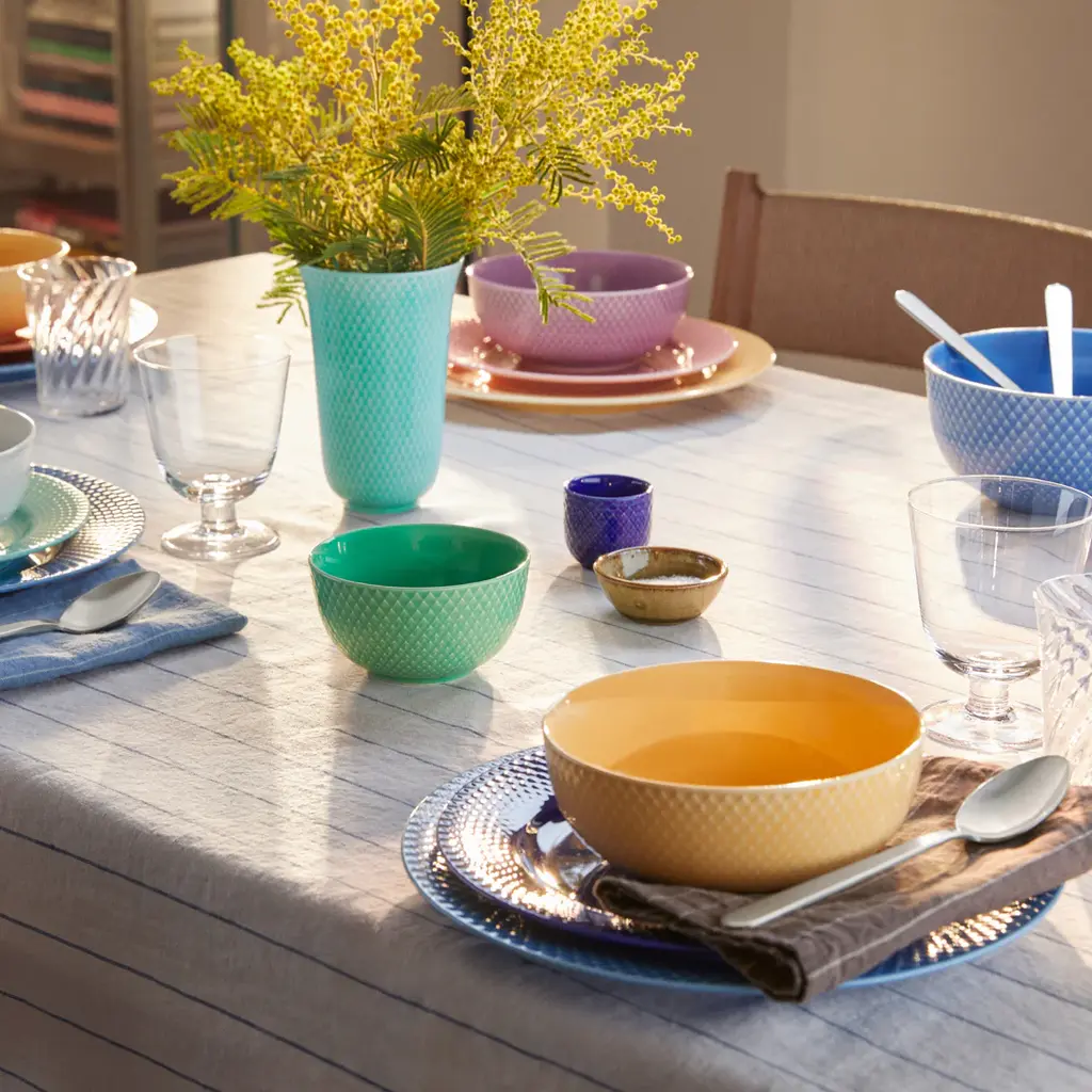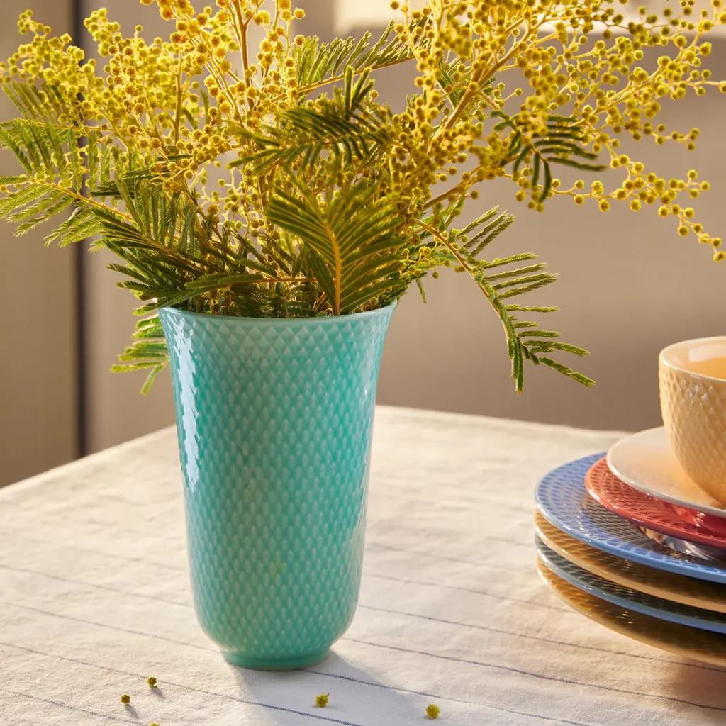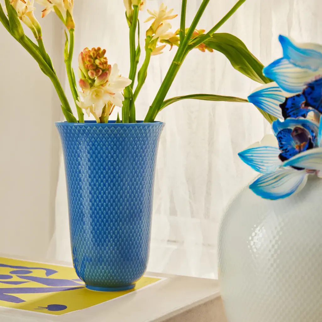 With a graceful form that opens towards the top like a tulip, the Rhombe Vase from Lyngby Porcelaen is a classic and elegant design. This porcelain vase is finished in a transparent colored glaze, allowing the collection's signature Rhombe relief pattern to emerge through the surface. The interplay of the glossy glaze and the subtle, textural pattern creates a stunning effect. Available for a limited time, these archival colors are a must-have for collectors and a beautiful accent for any home. Highlights: