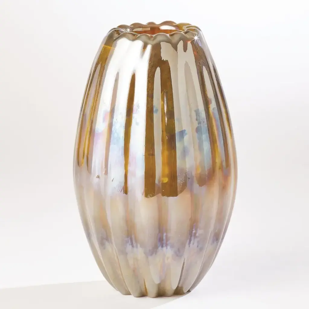 Our Ribbed Vase is water tight, made of Polish art glass, and features a finish with an iridescent appearance. From a fashion forward perspective, Global Views offers accessories, furniture, statement lighting, and an assortment of rugs and mirrors to add beauty and joy to your home.
