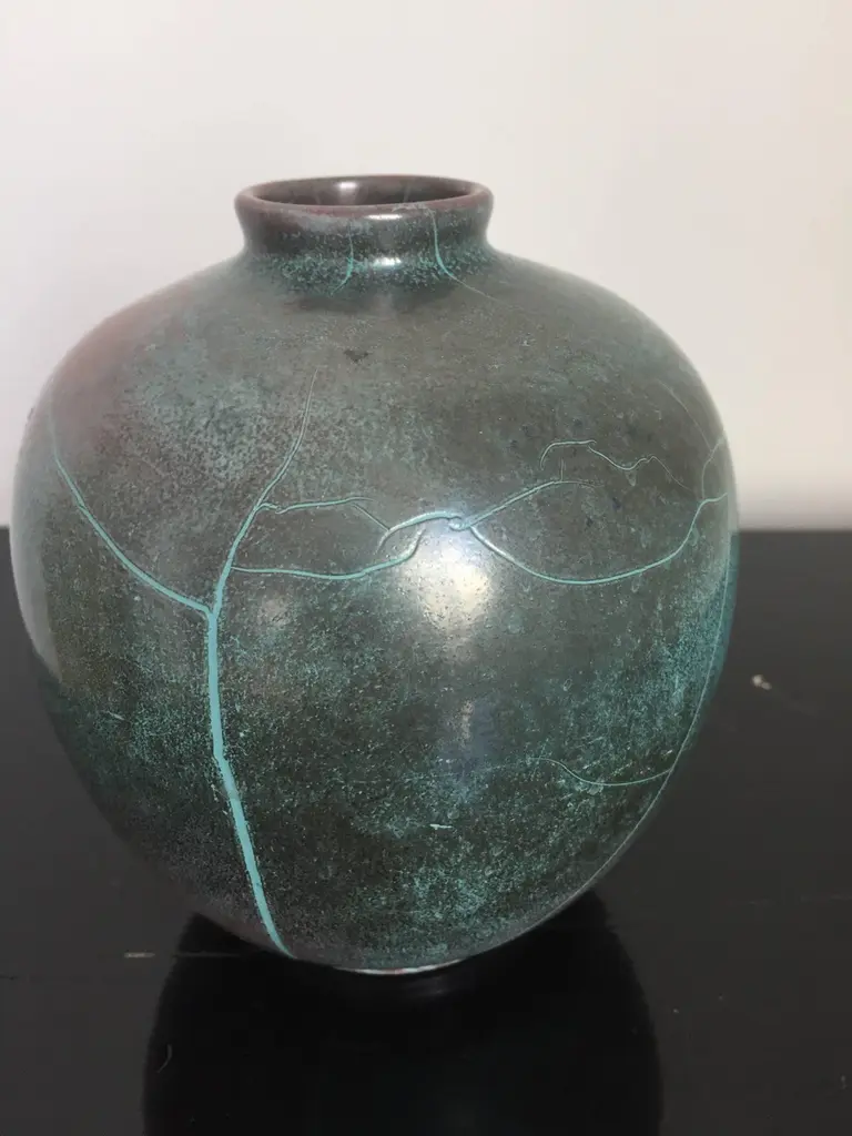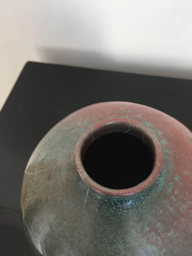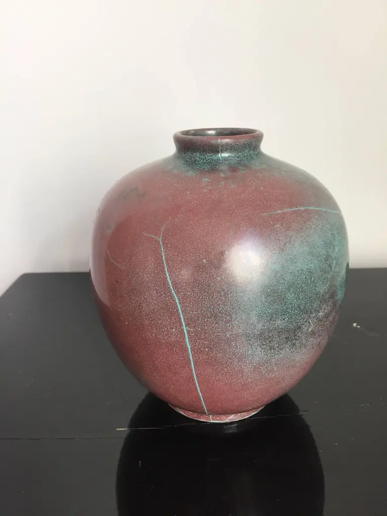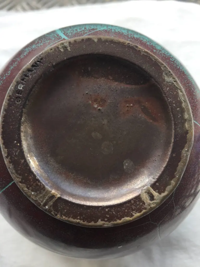 Vase and jar created by Richard Uhlemeyer, German ceramist, beautiful glaze in dark green and terra cotta red shades, Vase size 16cm diameter x 16 cm hightJar size 16cm diameter x 20cm hightGood condition, minor losses.