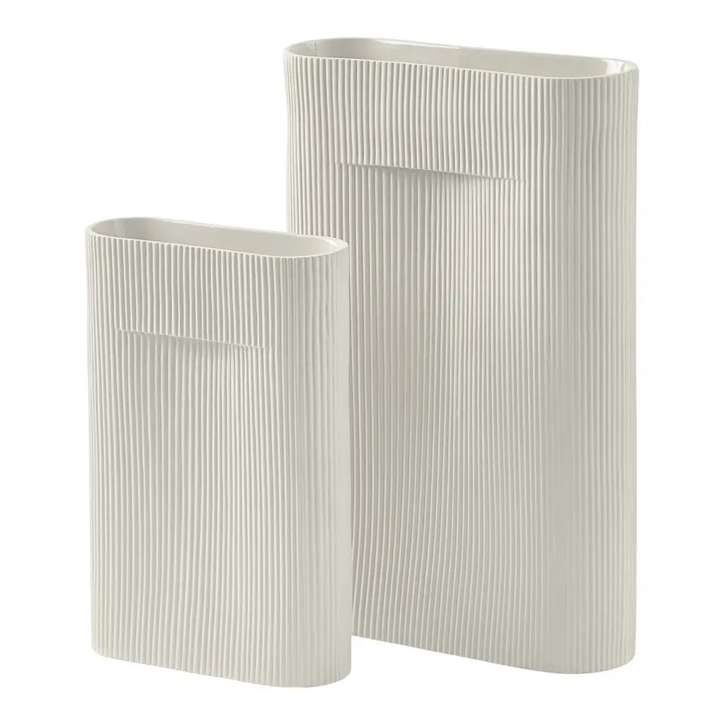 "The idea for the Ridge Vase came while traveling through different cities with a vase in mind, searching for details that had an architectural feel. Upon returning to our studio in Finland, we began sketching by hand and making mock-ups in paper and ceramics. With its vertical lines and unique shape, inspired by a doorway in Paris, the Ridge Vase presents a new way to place flowers through a modern expression along with a sculptural character when not in use. The Ridge Vase manipulates the oval form through its refined dent while adding the function of a small handle to use when moving the vase form one room to another." - Salla Luhtasela & Wesley Walters of Studio Kaksikko With references to its name, the Ridge Vase applies an added functionality through its refined dent, allowing for flowers to stand upright, while also working as a subtle handle when moving the vase from one room to another. The vase comes in two sizes, bring a distinct touch to any room. Place the Ridge Vase in a windowsill, on the floor or side table for a characterful design object that is unique in both its function and expression.