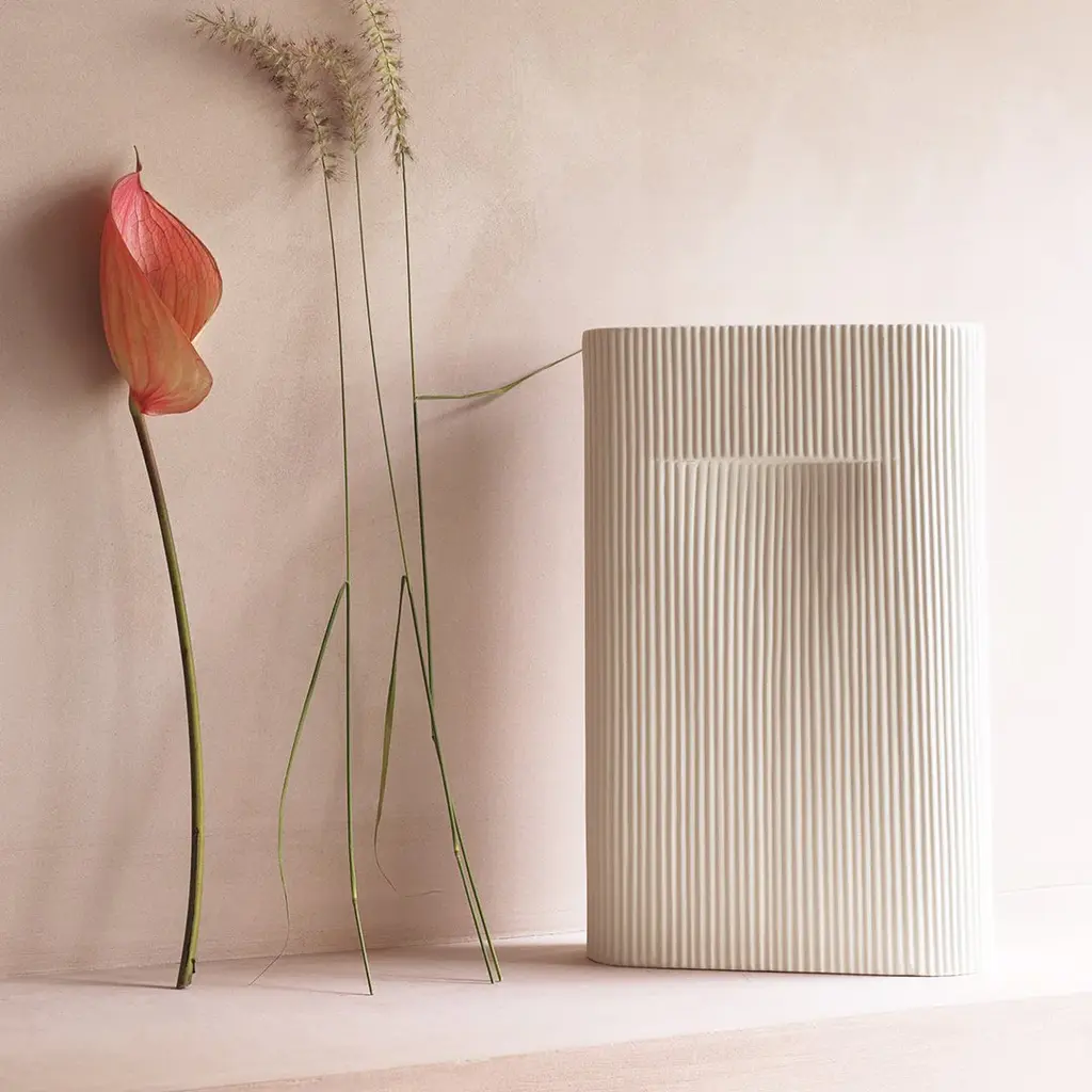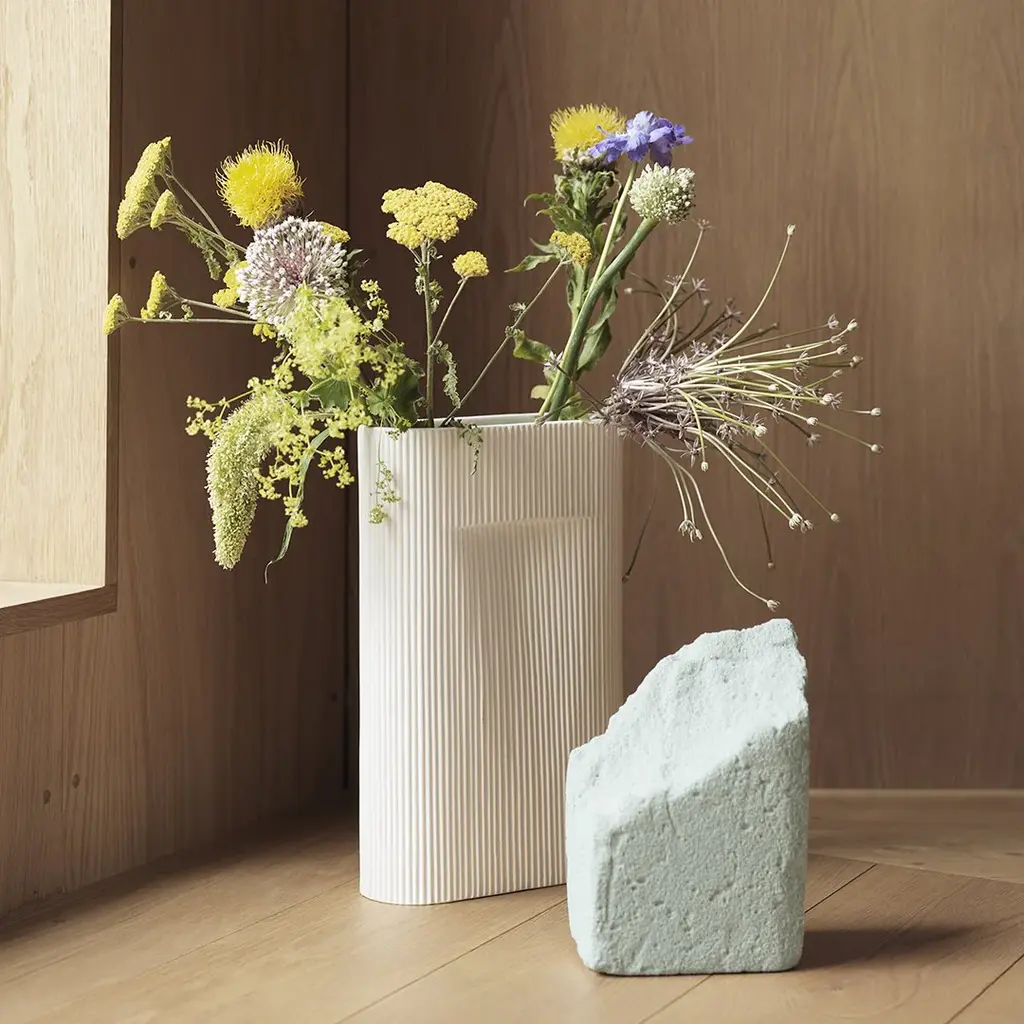"The idea for the Ridge Vase came while traveling through different cities with a vase in mind, searching for details that had an architectural feel. Upon returning to our studio in Finland, we began sketching by hand and making mock-ups in paper and ceramics. With its vertical lines and unique shape, inspired by a doorway in Paris, the Ridge Vase presents a new way to place flowers through a modern expression along with a sculptural character when not in use. The Ridge Vase manipulates the oval form through its refined dent while adding the function of a small handle to use when moving the vase form one room to another." - Salla Luhtasela & Wesley Walters of Studio Kaksikko With references to its name, the Ridge Vase applies an added functionality through its refined dent, allowing for flowers to stand upright, while also working as a subtle handle when moving the vase from one room to another. The vase comes in two sizes, bring a distinct touch to any room. Place the Ridge Vase in a windowsill, on the floor or side table for a characterful design object that is unique in both its function and expression.