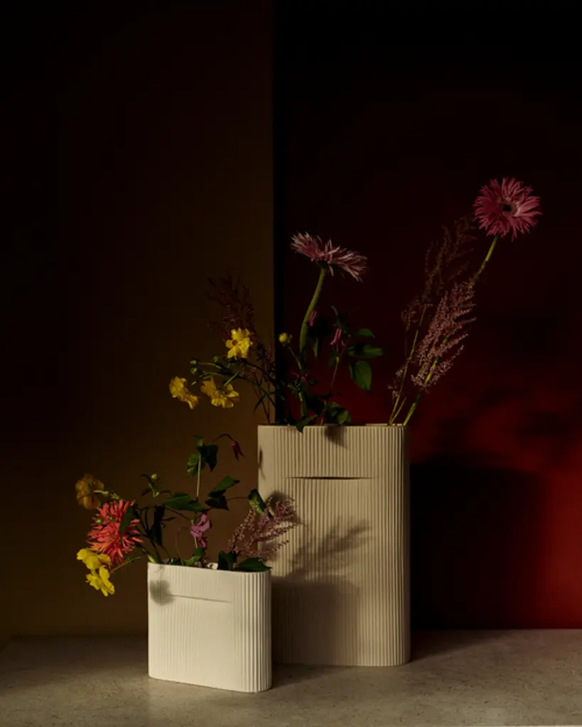 The Ridge Vase offers a fresh approach to flower display with its sculptural expression and artful character, even when not in use. Its refined dent provides added functionality, allowing flowers to stand upright and serving as a subtle handle for easy movement between rooms.