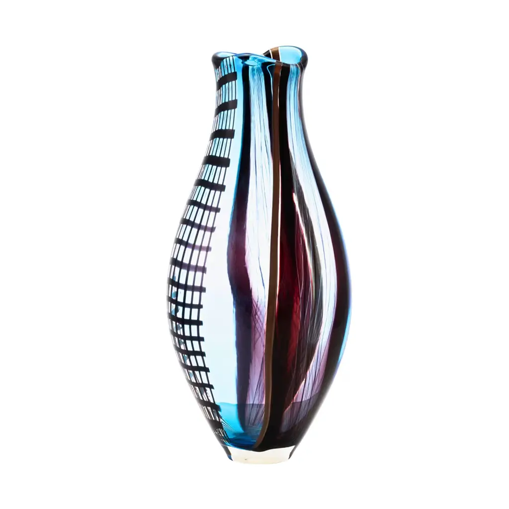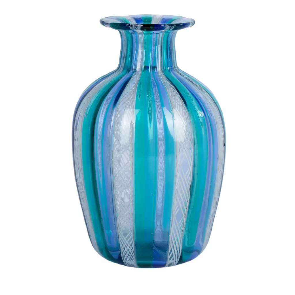 Refined transparencies and contrasting decorations characterize this enthralling mouth-blown glass vase, singular piece reminiscent of a flower bud. The spiral and reticular inserts - obtained by following the traditional "Zanfirico" technique - combine with aventurine and filigree to elevate the vase's visual quality. Each piece is entirely unique and complete by its authenticity and warranty certificates.