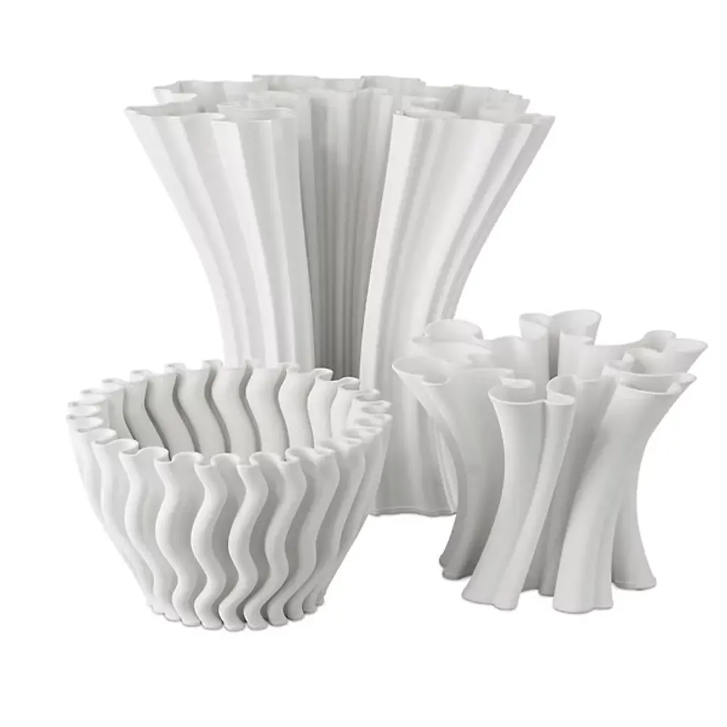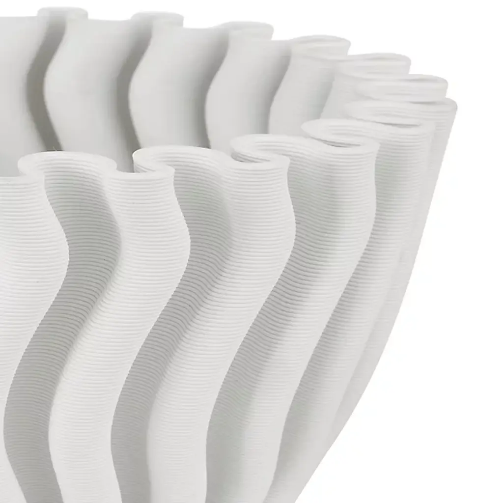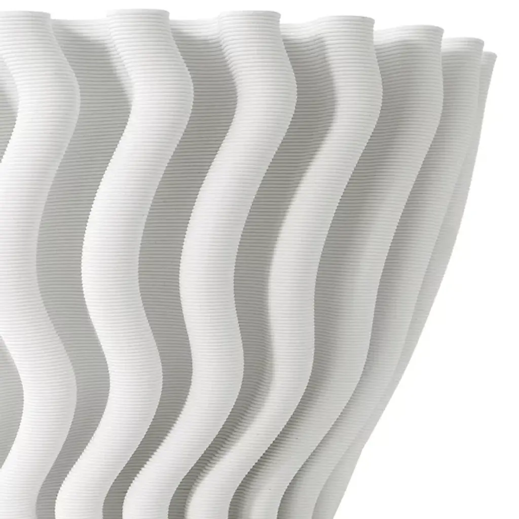 The Ripple White Vase from Currey & Company bridges ancient ceramic tradition with cutting-edge technology. Uniform waves cascade around its surface with mathematical precision, creating an optical effect that seems to shift as you move around it. This extraordinary vessel represents a pioneering approach to porcelain crafting through 3D printing technology, challenging conventional ideas about traditional materials. Light plays dramatically across the ridged exterior, creating shadow patterns that become part of the design experience. The precise undulations provide a satisfying tactile quality that invites touch and inspection.