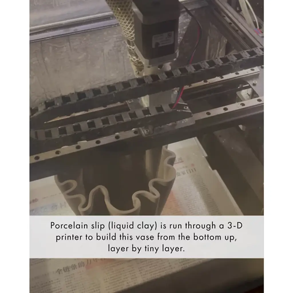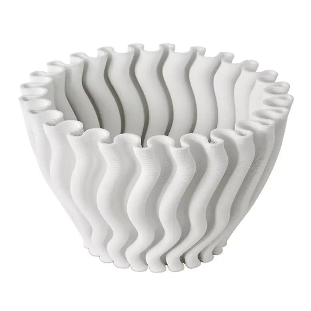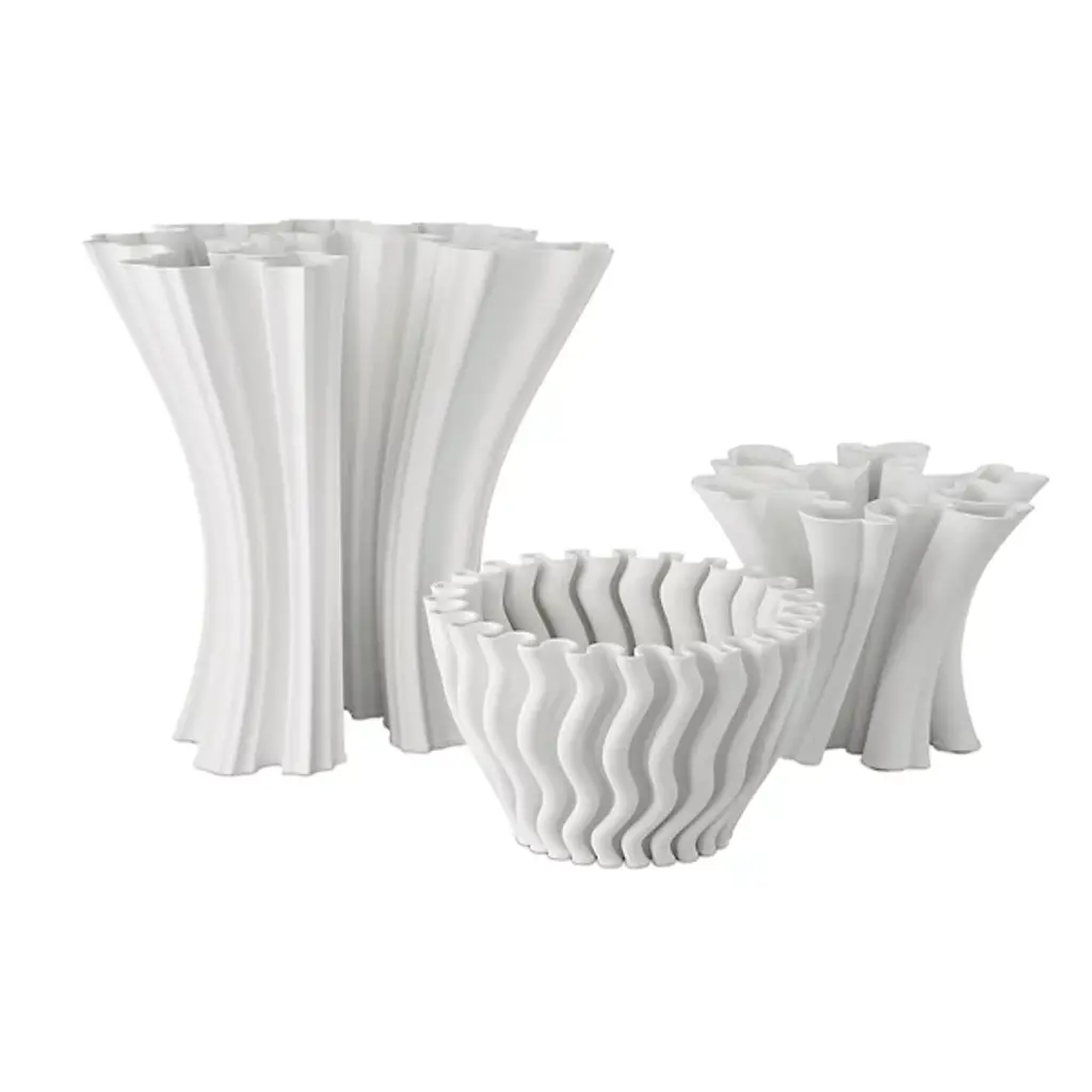 The Ripple White Vase from Currey & Company bridges ancient ceramic tradition with cutting-edge technology. Uniform waves cascade around its surface with mathematical precision, creating an optical effect that seems to shift as you move around it. This extraordinary vessel represents a pioneering approach to porcelain crafting through 3D printing technology, challenging conventional ideas about traditional materials. Light plays dramatically across the ridged exterior, creating shadow patterns that become part of the design experience. The precise undulations provide a satisfying tactile quality that invites touch and inspection.
