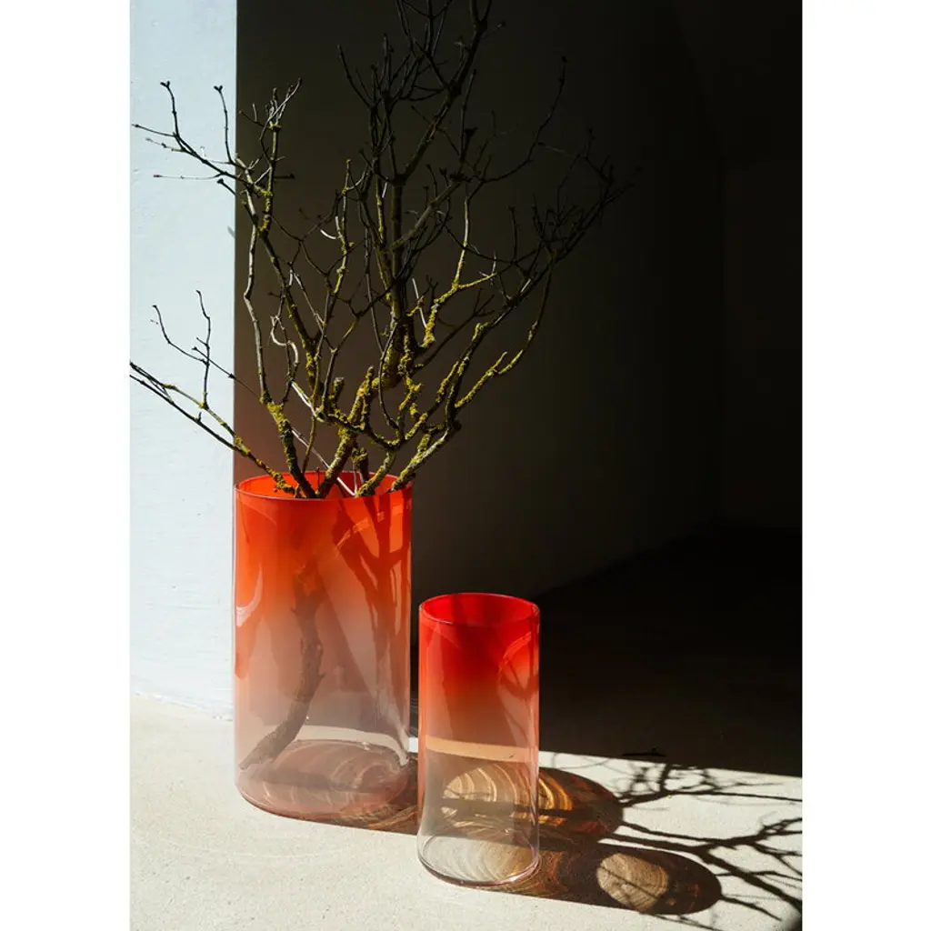Fundamental Berlin's Rise floor vase is a large, mouth-blown glass vase featuring a gradient color effect that transitions from a rich hue at the top to a delicate, transparent base. The Rise vase is crafted from two thick layers of glass: color pigments are used only in the inner layer, allowing the crystal-clear outer surface to reflect surrounding light and give the vase a radiant appearance. This cylindrical vase is particularly well-suited for decorative branches, green foliage and longer flowers such as lilies, chrysanthemums, and amaranths, and it can be used both on the floor and on a table. The Rise vase is handcrafted in the Bohemia region of the Czech Republic, renowned for its crystal glassware.