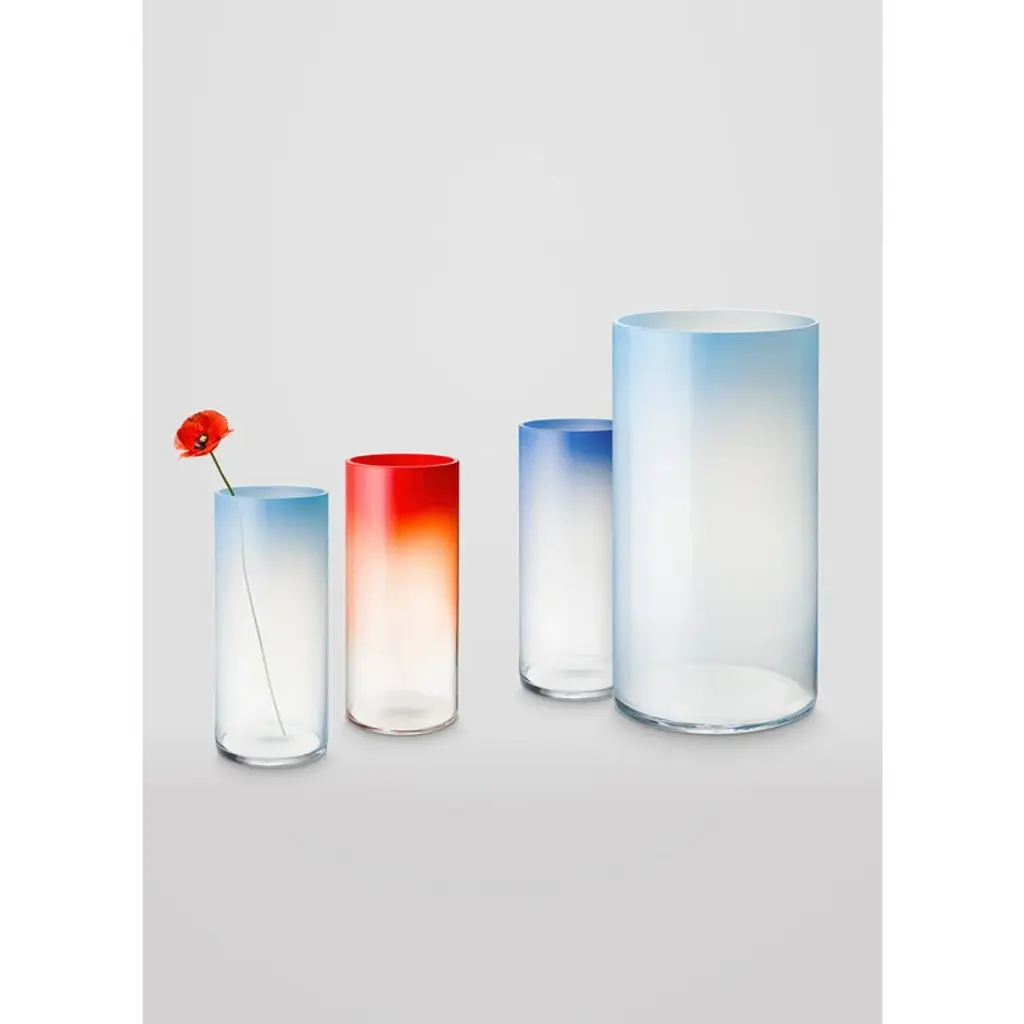 Fundamental Berlin's Rise table vase is a large, mouth-blown glass vase featuring a gradient color effect that transitions from a rich hue at the top to a delicate, transparent base. The Rise vase is crafted from two thick layers of glass: color pigments are used only in the inner layer, allowing the crystal-clear outer surface to reflect surrounding light and give the vase a radiant appearance. This cylindrical vase is particularly well-suited for decorative branches, green foliage and longer flowers such as lilies, chrysanthemums, and amaranths. The Rise vase is handcrafted in the Bohemia region of the Czech Republic, renowned for its crystal glassware.