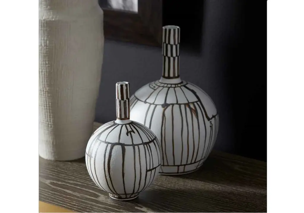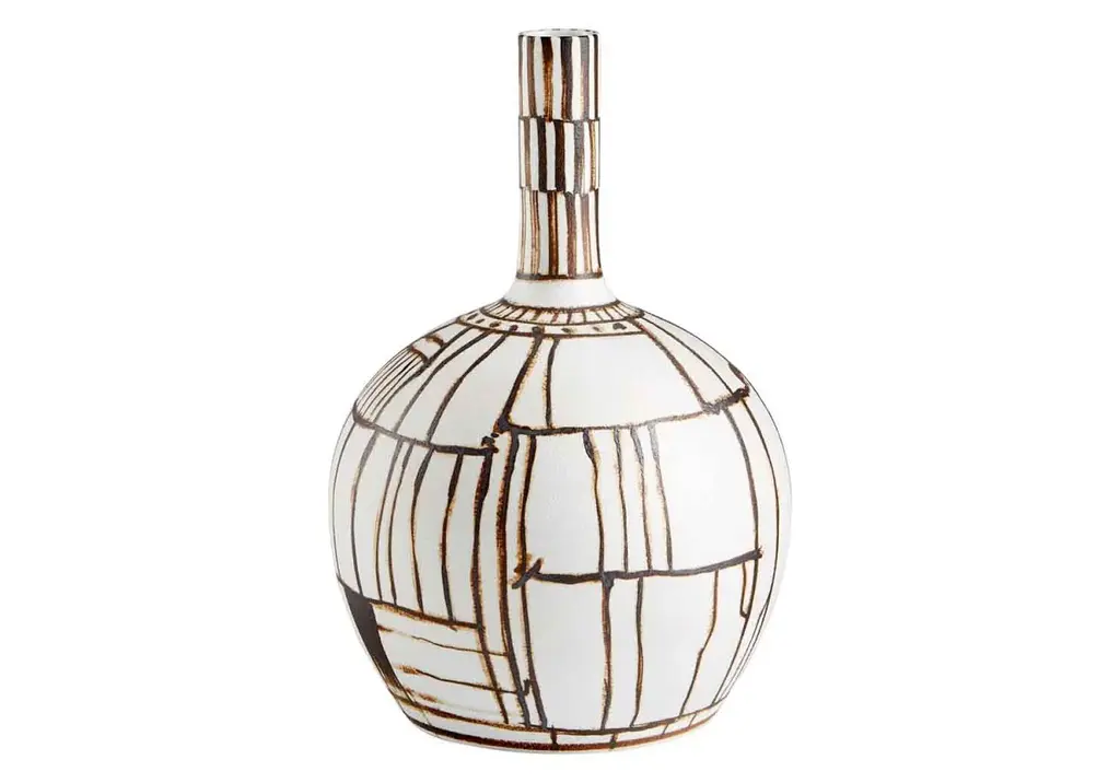 The Risse Vase lends visual texture with its mosaic porcelain design accentuated by rustic ebony. Its rounded base is offset with an elongated neck for an added touch of dimension. Display one alone or pair the two sizes together for a distinguished look.