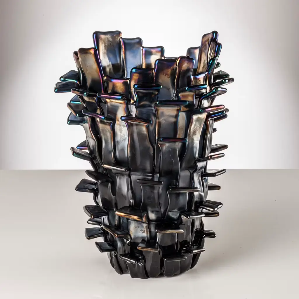 Part of a numbered series designed by Fulvio Bianconi in 1989, this captivating mouth-blown glass vase is handcrafted with an innovative technique whereby the classic conical shape is covered with small rectangular strips of glass meticulously applied in alternating rows to create the illusion of a blossoming flower. The iron-gray color features a pearly, iridescent finish.