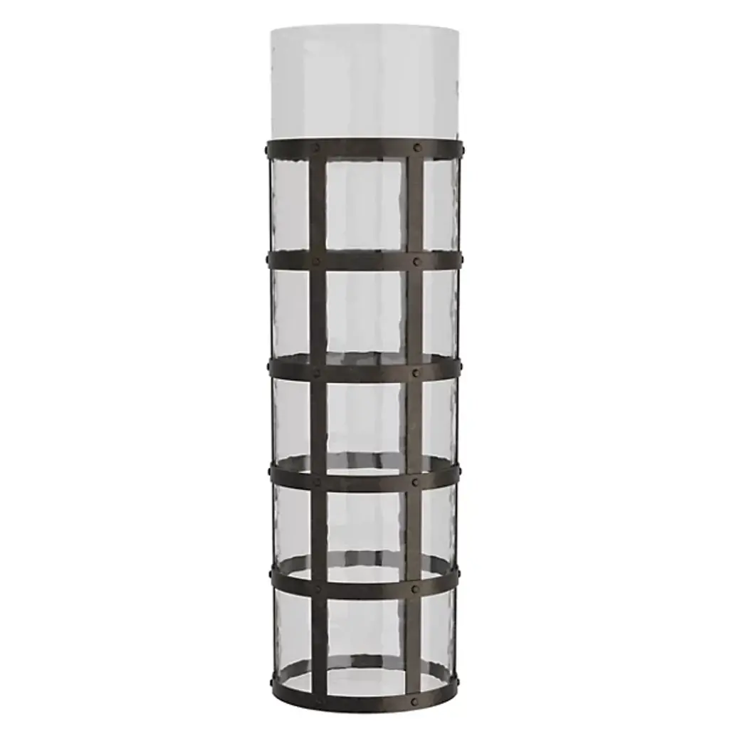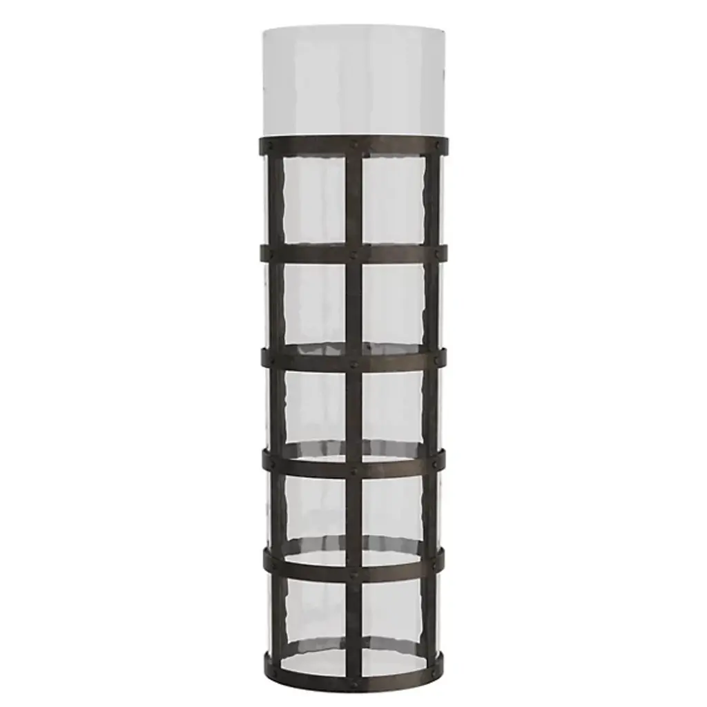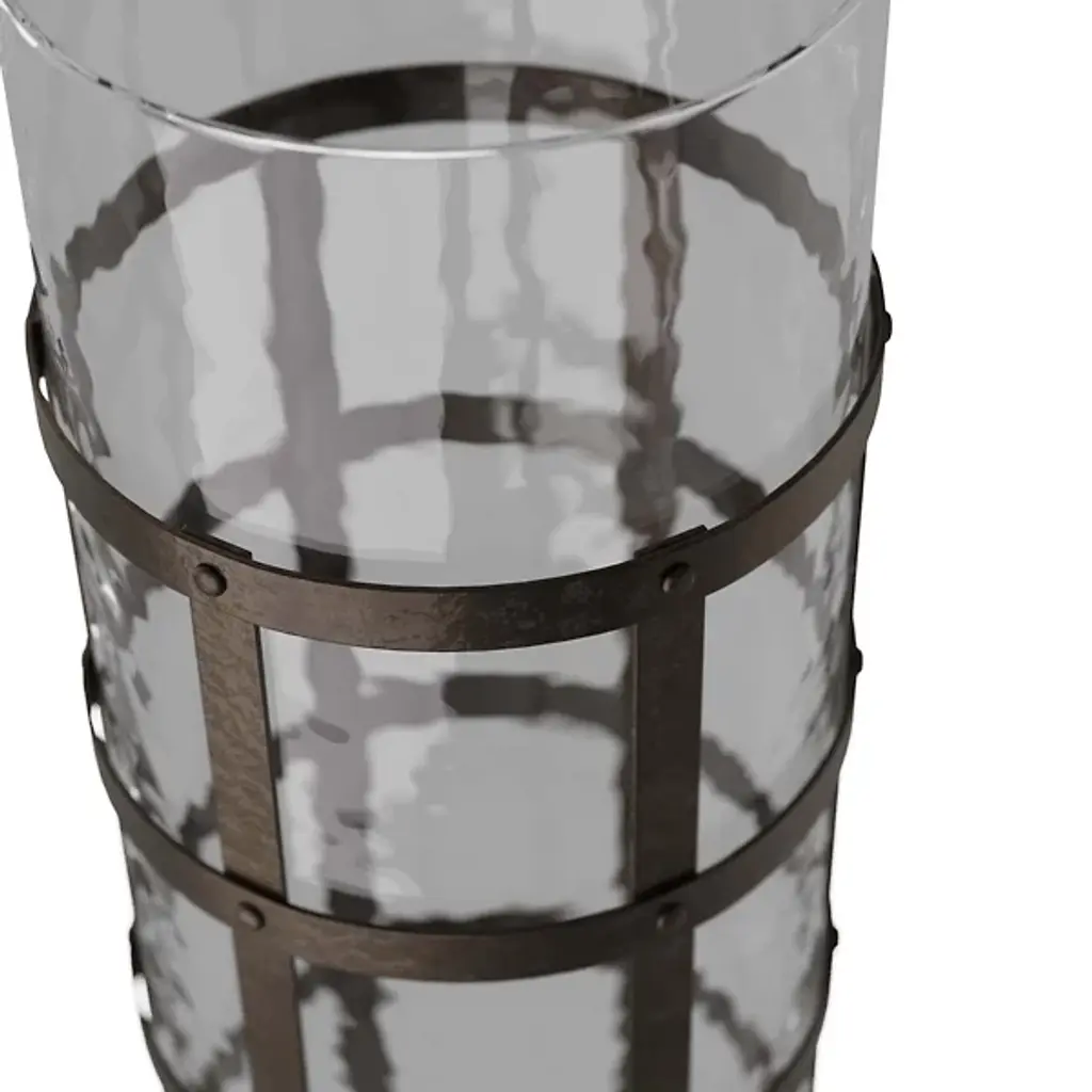 Add an inspired, vintage-styled note to your interior with the Rivet Vase from Arteriors. It’s a daring and artisanal design from the mind of Barry Dixon. The piece starts with a basket-style frame of blackened iron in a grid pattern, surrounding a cylinder of clear hammered glass. The soft contours of the glass contrast with the robust metal that wraps it to create a sculptural standout.
