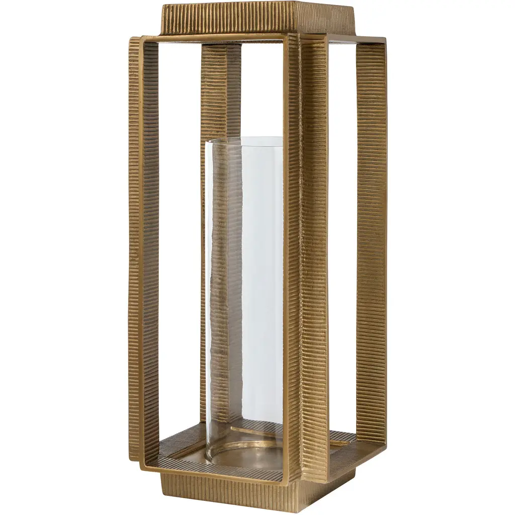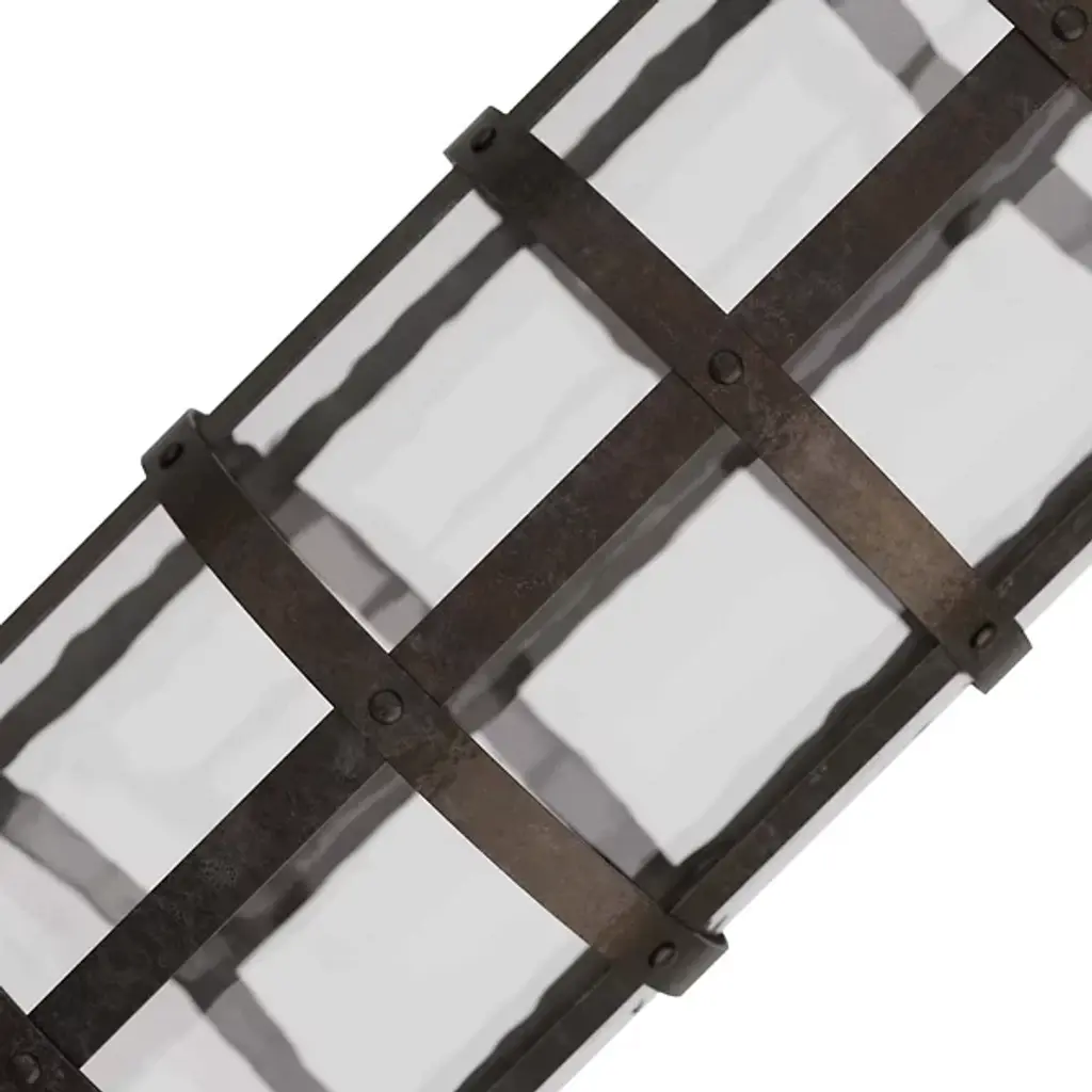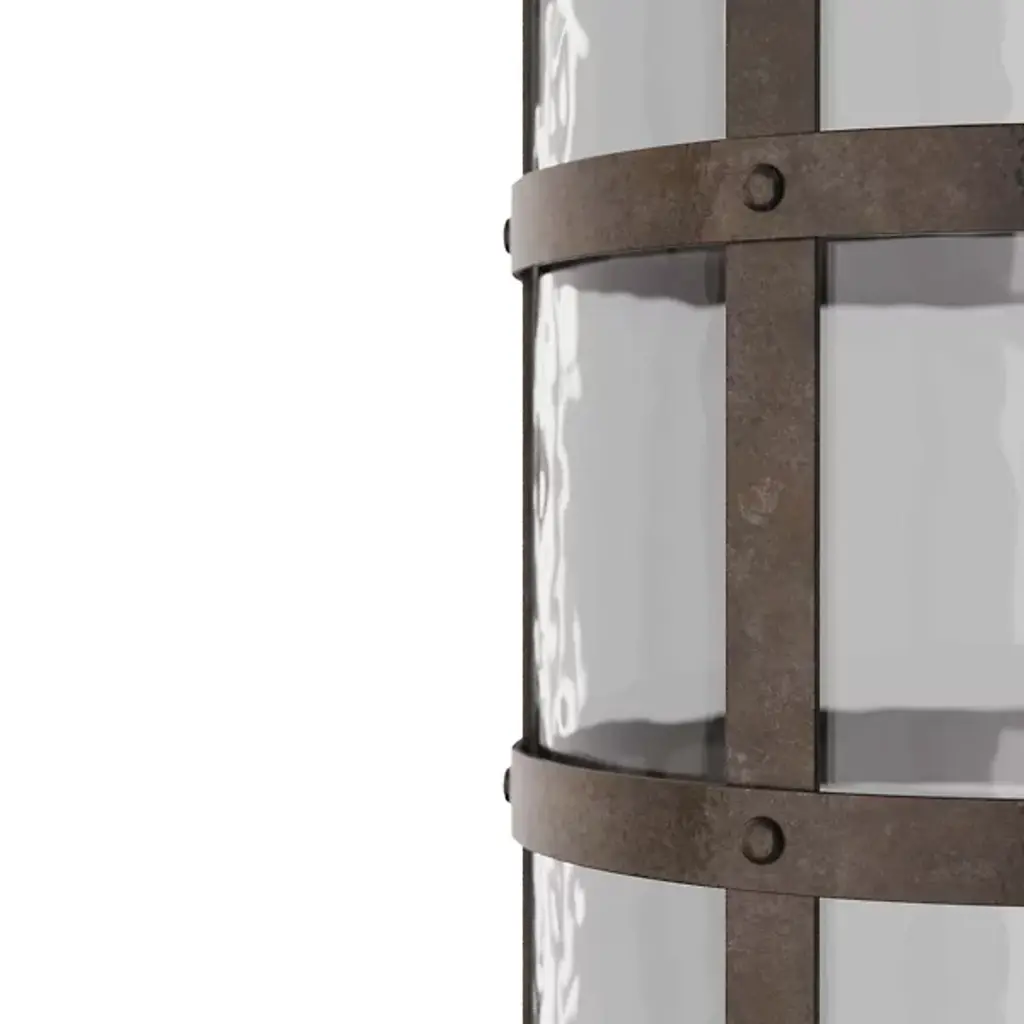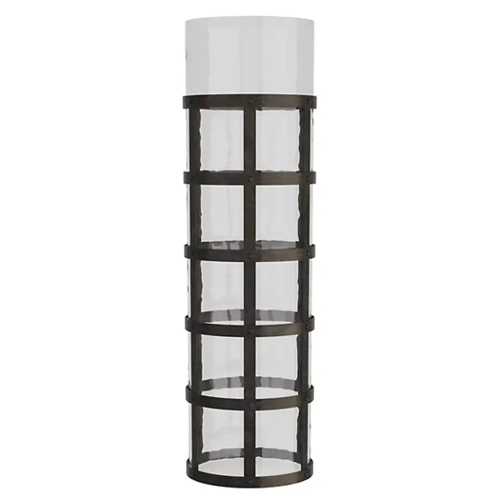 Add an inspired, vintage-styled note to your interior with the Rivet Vase from Arteriors. It’s a daring and artisanal design from the mind of Barry Dixon. The piece starts with a basket-style frame of blackened iron in a grid pattern, surrounding a cylinder of clear hammered glass. The soft contours of the glass contrast with the robust metal that wraps it to create a sculptural standout.
