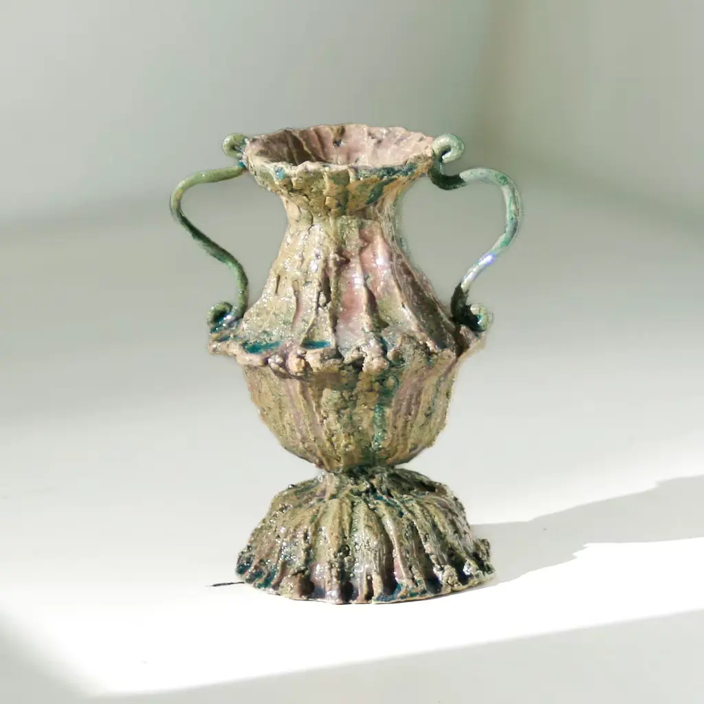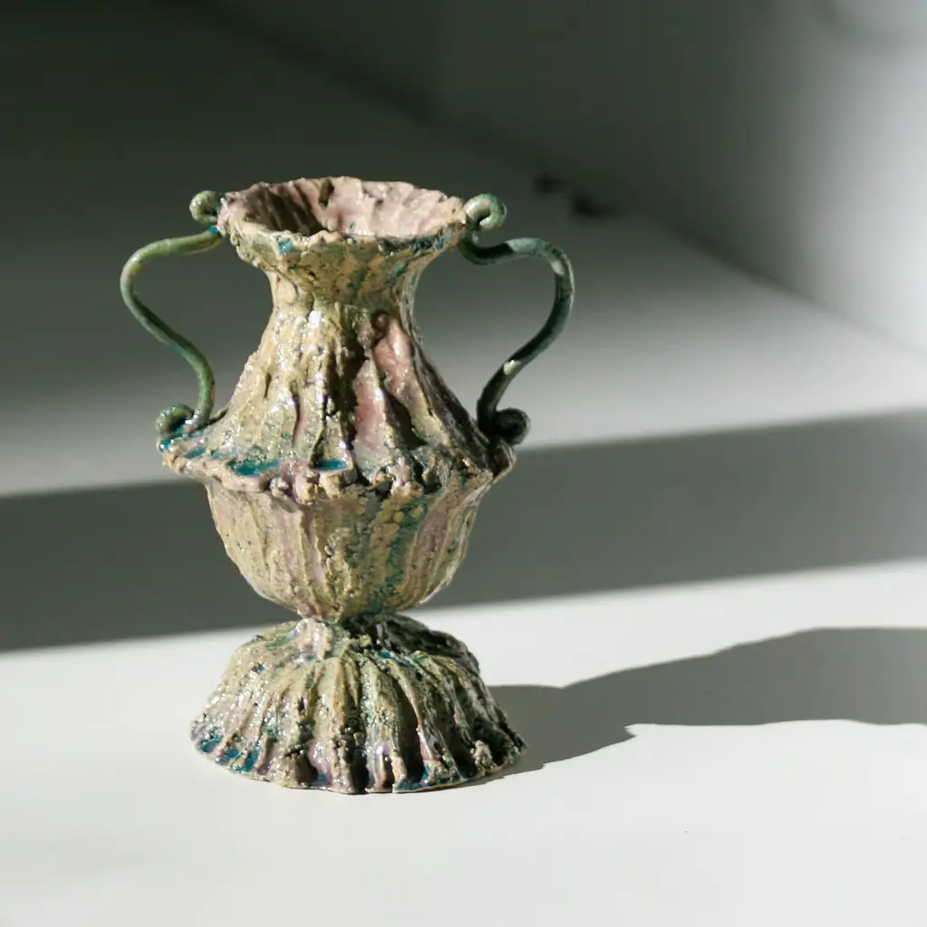 The Rocco Anse vase draws inspiration from baroque forms with a modern interpretation, featuring a sculptural silhouette with textured detailing. Its small size and beige-green finish make it a subtle yet elegant addition to minimalist interiors, ideal for displaying cut flowers or serving as a decorative statement piece. Each vase is crafted individually, with slight variations that enhance its unique artisanal character. Custom dimensions and colors are available upon request to complement any setting. Contact the Concierge for more details.