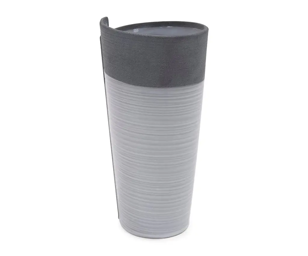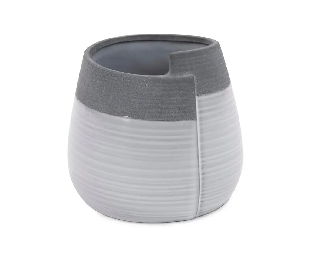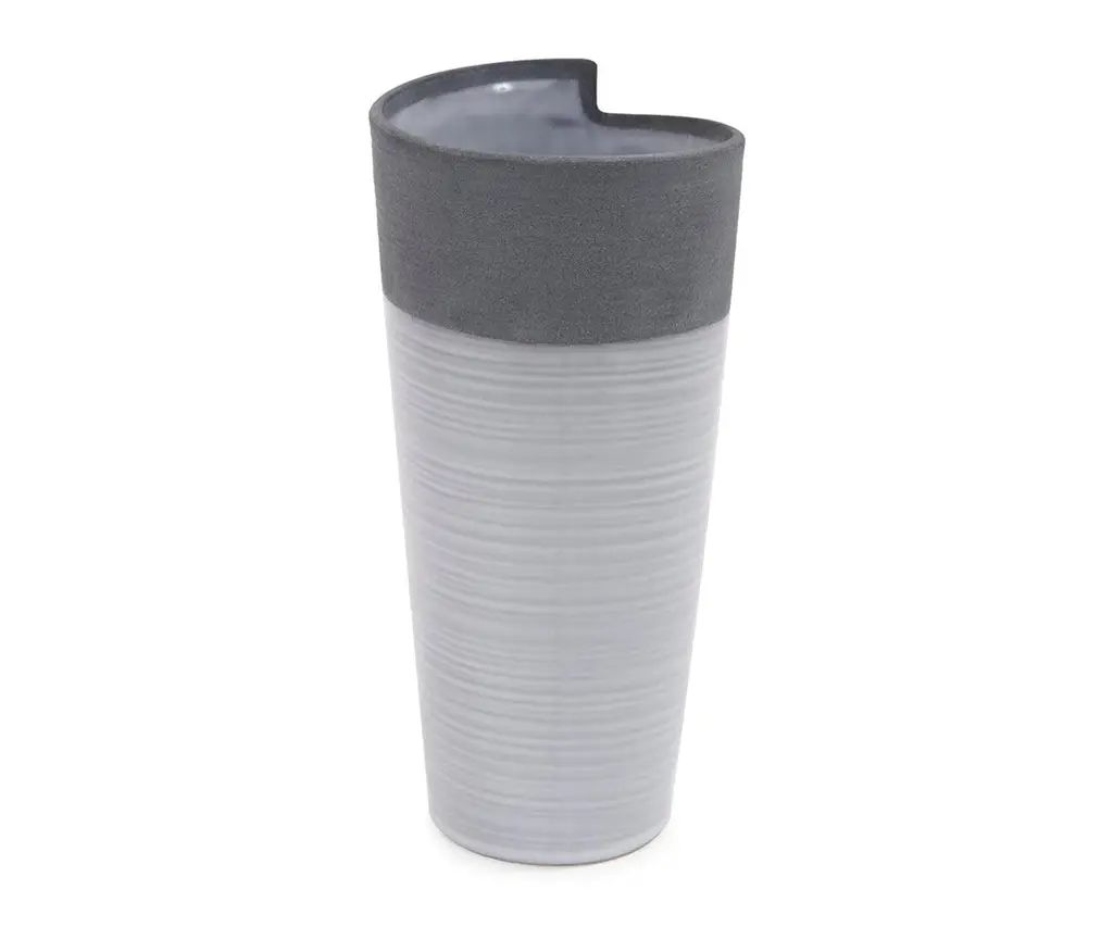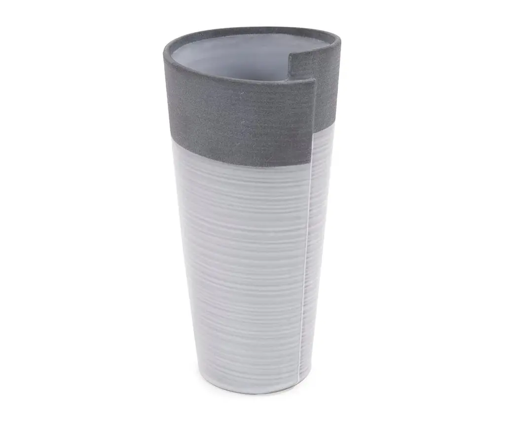 A unique asymmetrical shape and contrasting palette give the ceramic Rolled Two Tone Medium Vase a modern, unexpected aesthetic that complements any decor style.