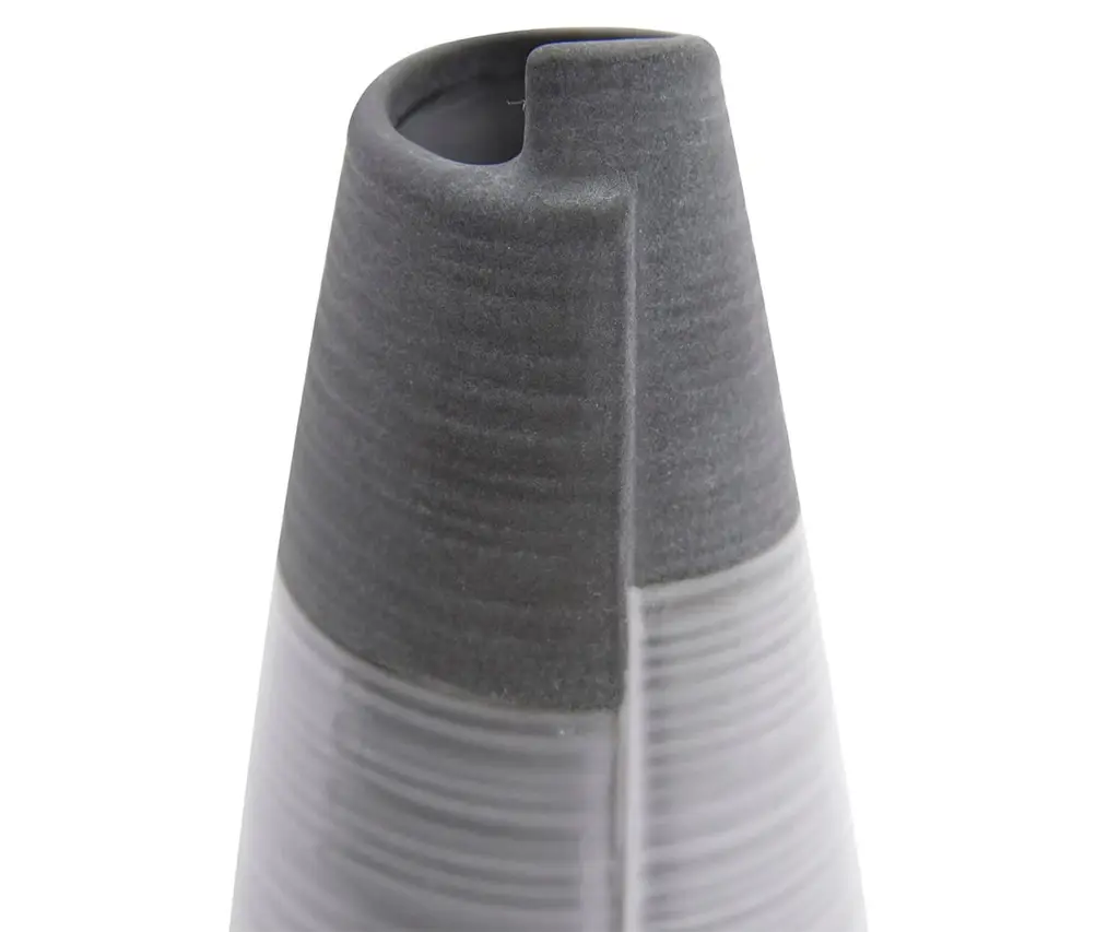 A unique asymmetrical shape and contrasting palette give the ceramic Rolled Two Tone Medium Vase a modern, unexpected aesthetic that complements any decor style.