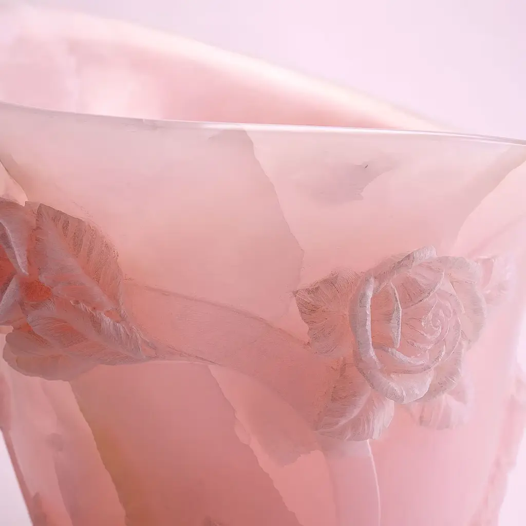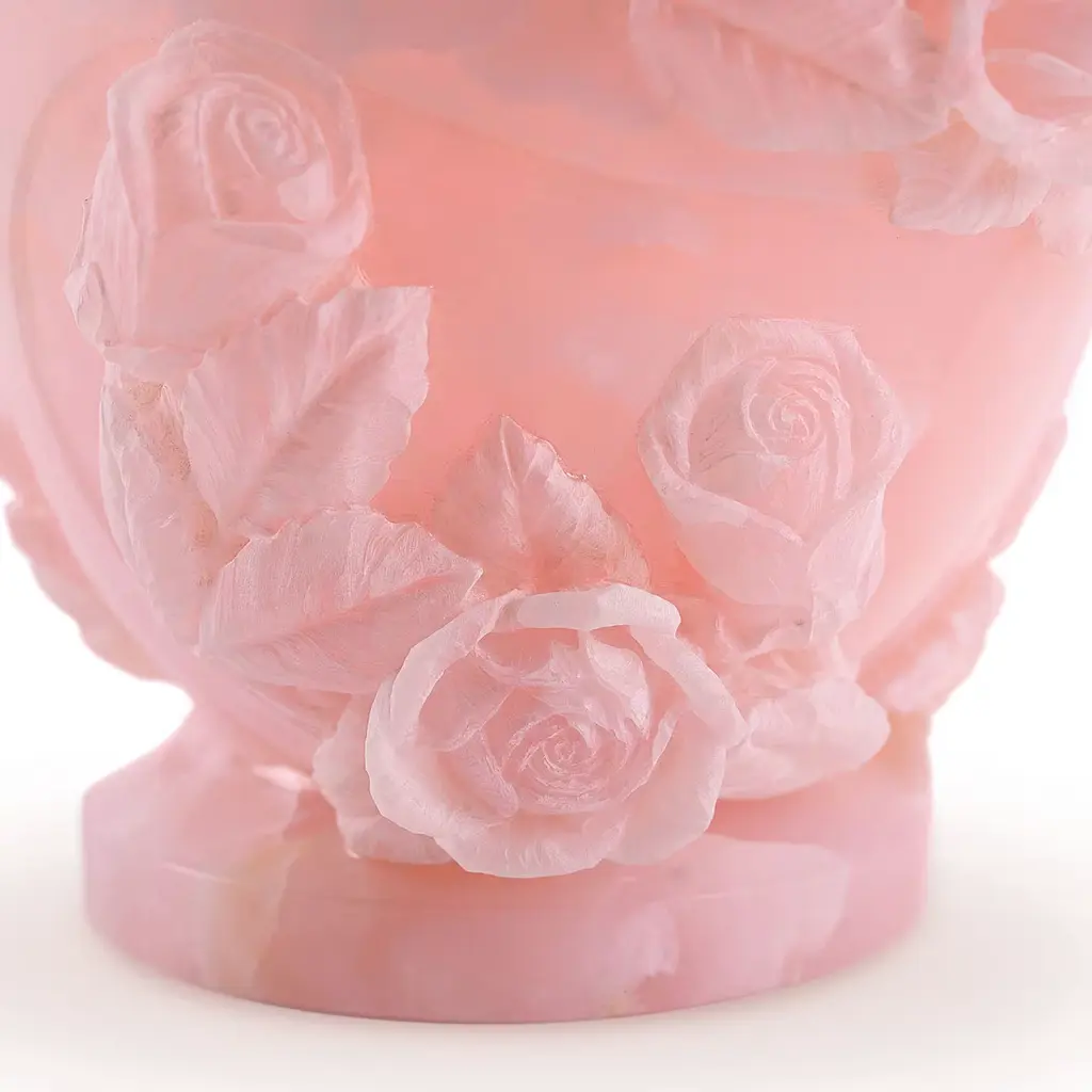 Roma Imperiale represents a memory of a nobility now dissolved, a suspended memory, forgotten in a secret garden, immersed in a blaze of roses, the same that surround it and become part of it. Pink onyx finds its maximum expression in emulating the delicate petals, handsculped from a solid block of rare pure pink onyx with such care. Limited edition of 6 vases, each handsigned, numbered by the artists and available in different marbles or onyx. Unique piece 100% handmade in Italy.