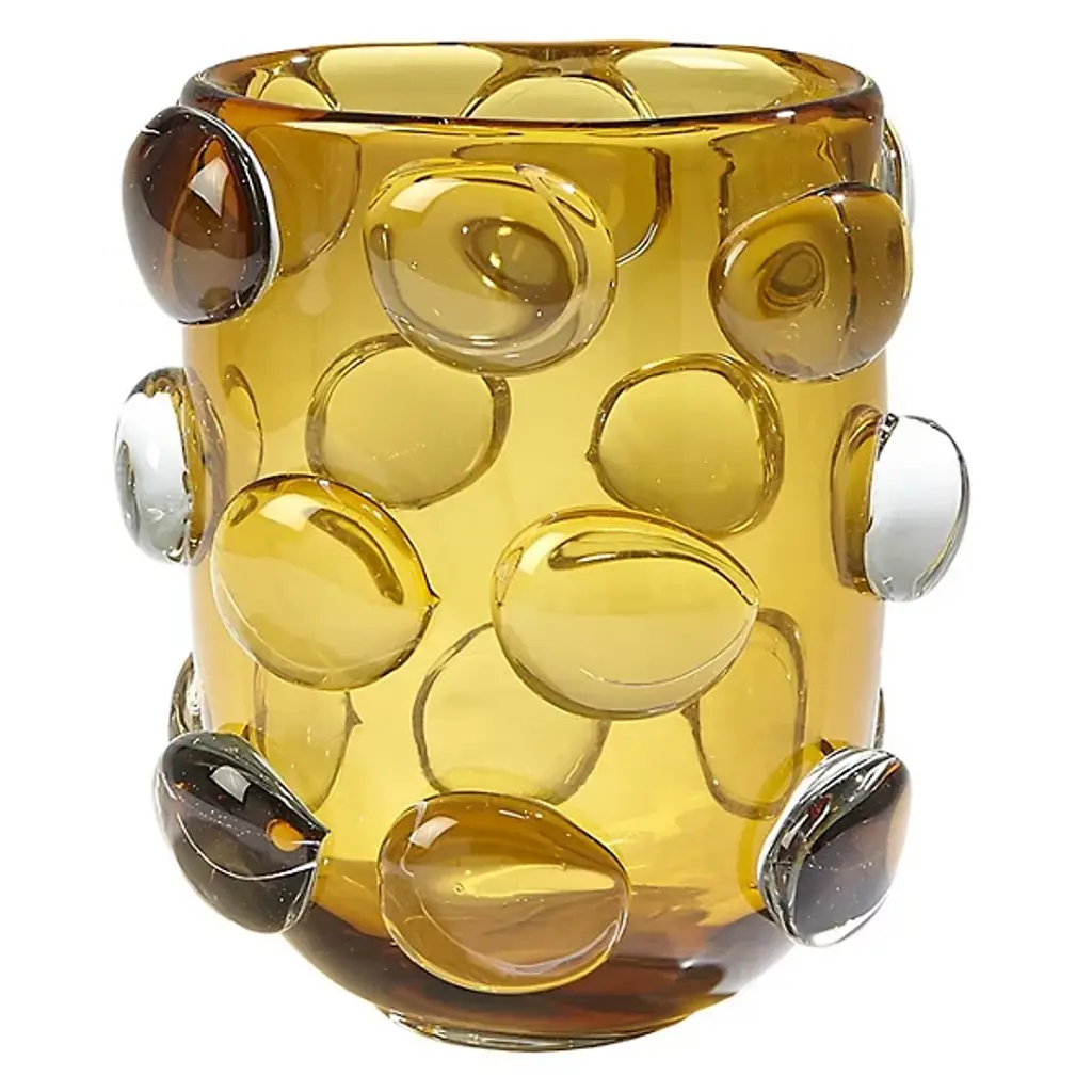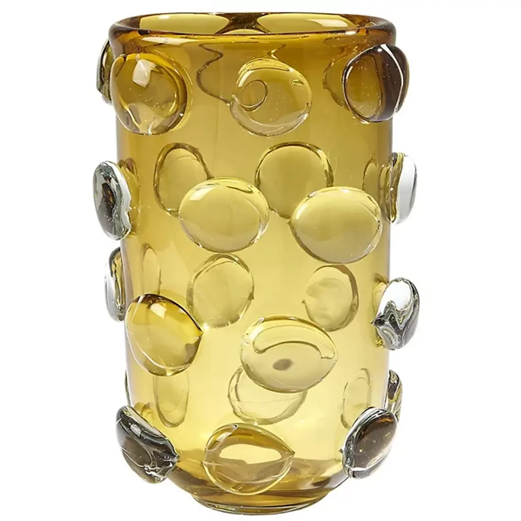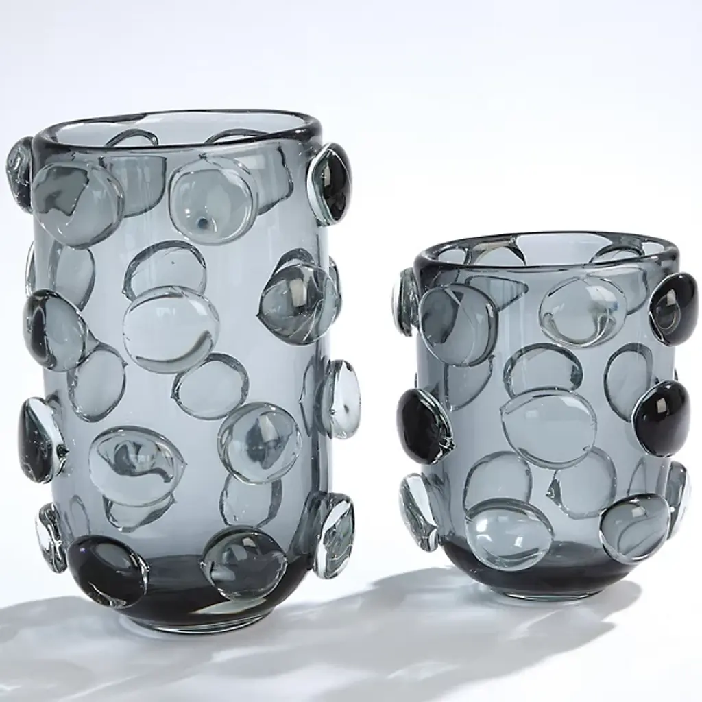Present enduring appeal to interiors with the enchanting design and sculptural lines of the Rondelle Vase from Global Views. A cylindrical shape crafted from art glass, its translucent surface playfully shows off its contents, slightly distorted by rounded nodules spaced around its exterior surface, creating a welcome, artistic expressiveness.