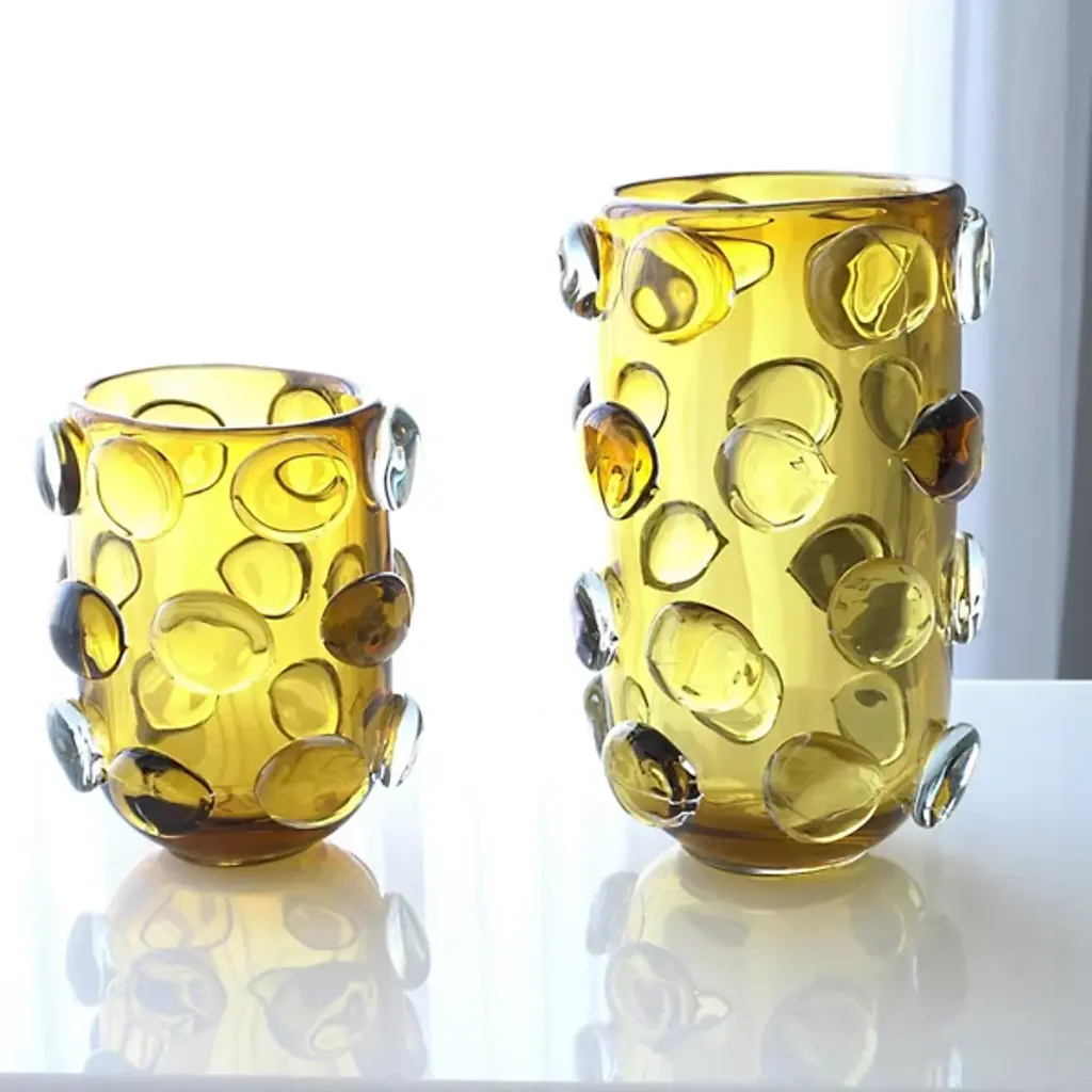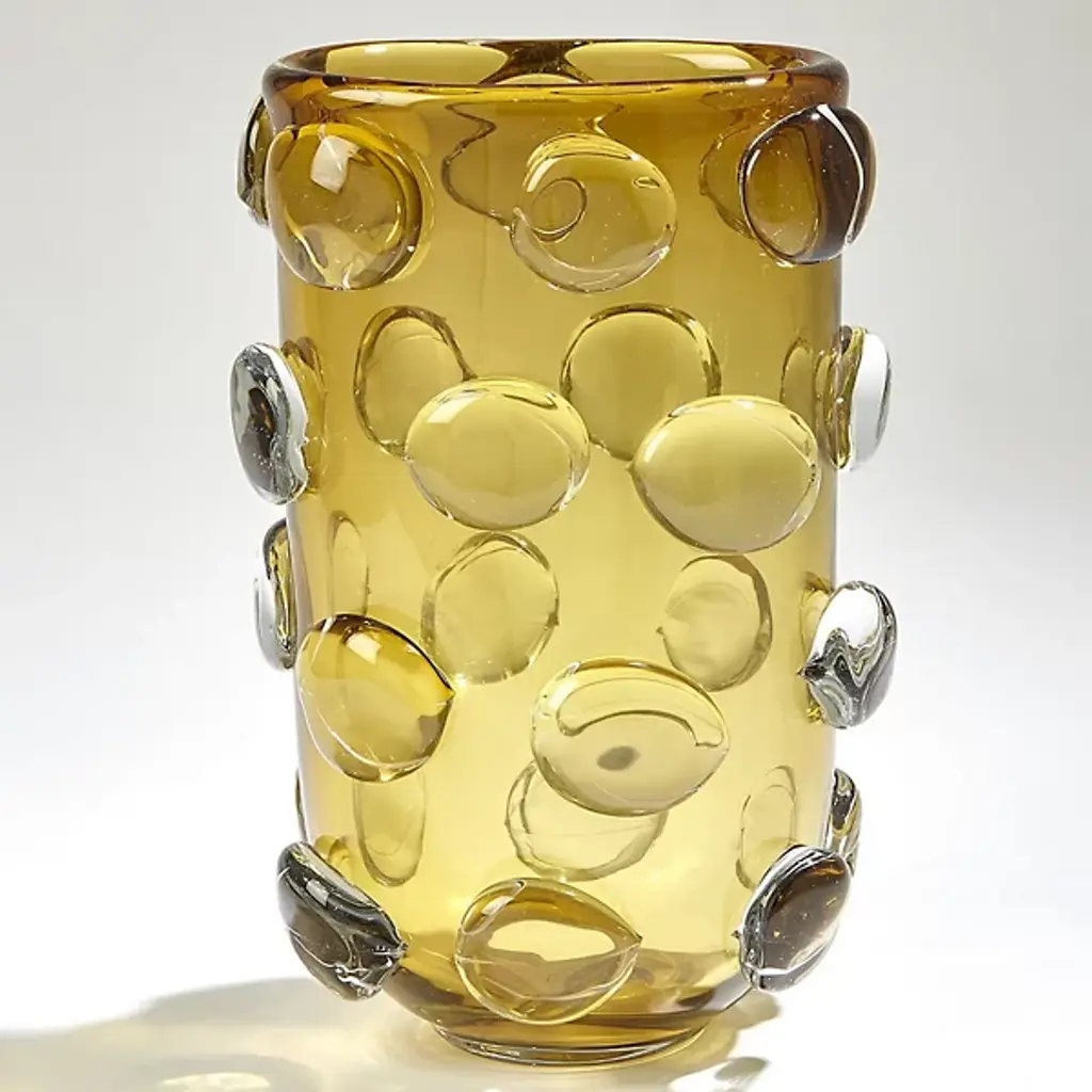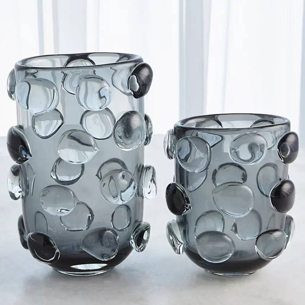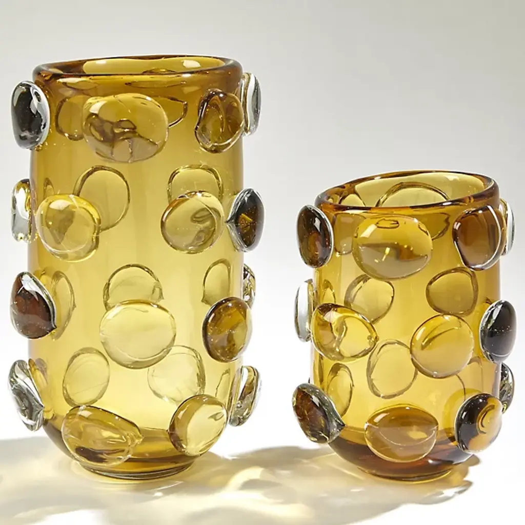 Present enduring appeal to interiors with the enchanting design and sculptural lines of the Rondelle Vase from Global Views. A cylindrical shape crafted from art glass, its translucent surface playfully shows off its contents, slightly distorted by rounded nodules spaced around its exterior surface, creating a welcome, artistic expressiveness.