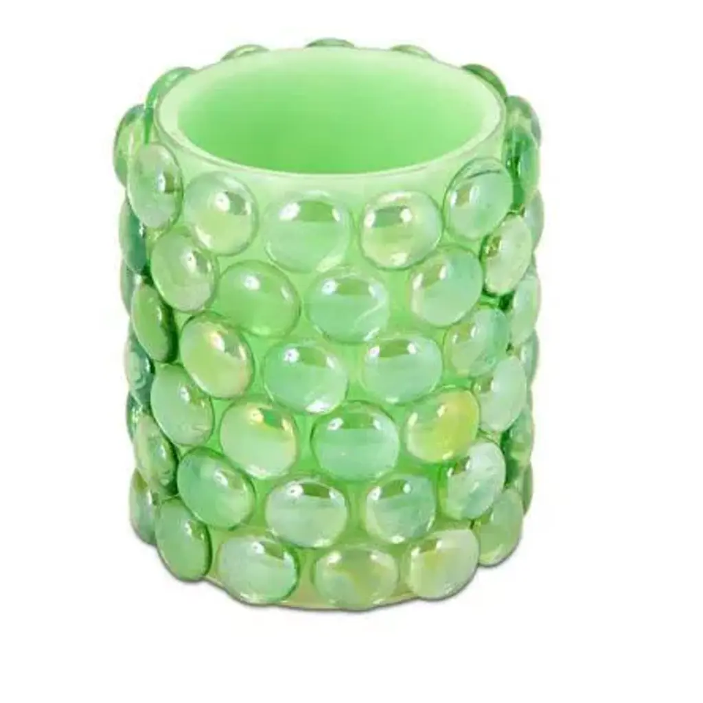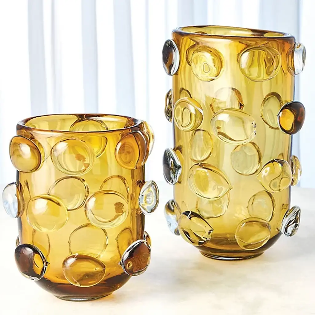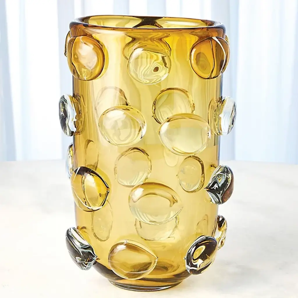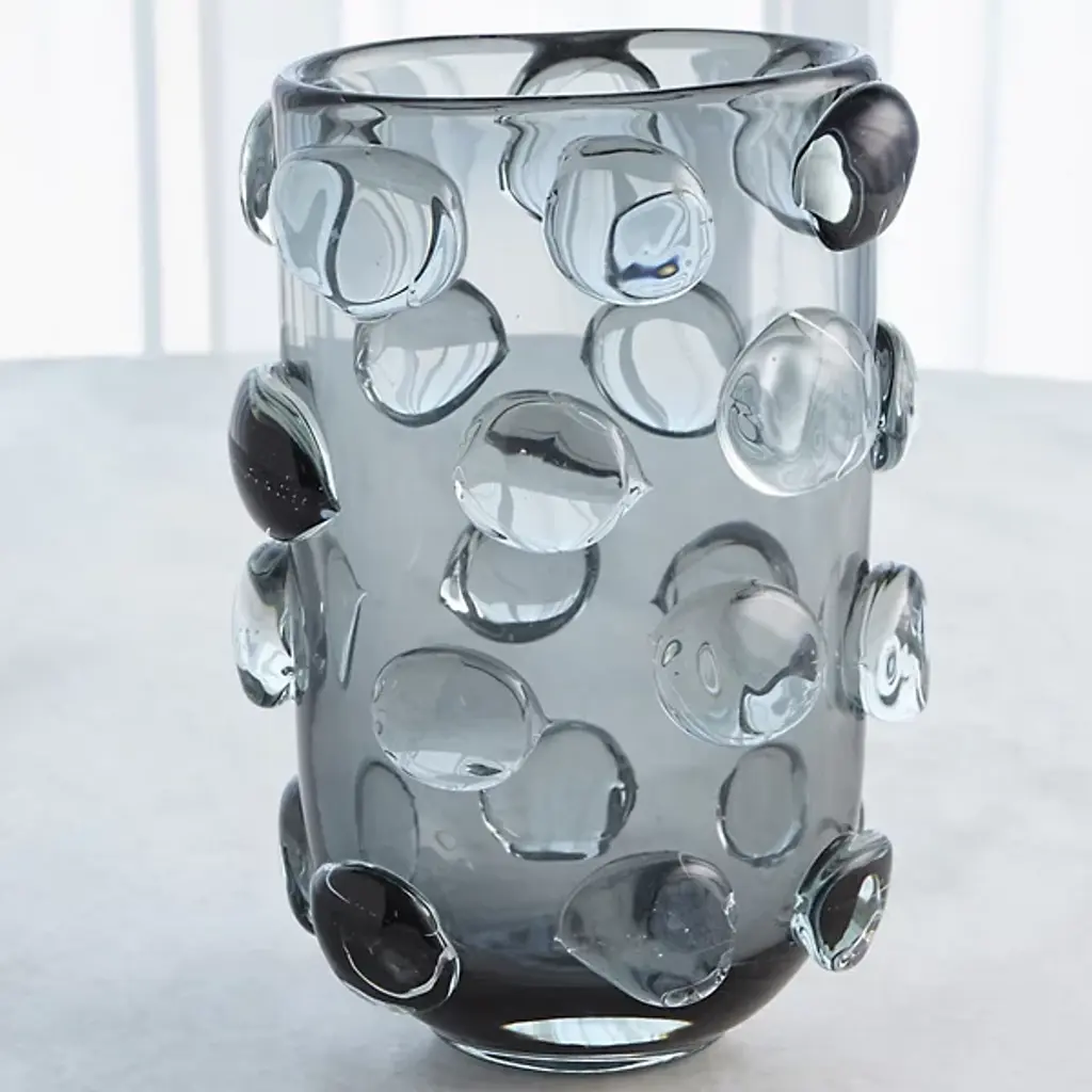 Present enduring appeal to interiors with the enchanting design and sculptural lines of the Rondelle Vase from Global Views. A cylindrical shape crafted from art glass, its translucent surface playfully shows off its contents, slightly distorted by rounded nodules spaced around its exterior surface, creating a welcome, artistic expressiveness.