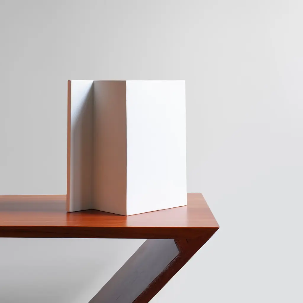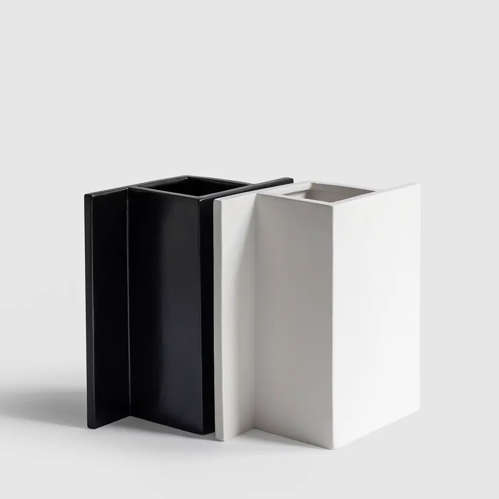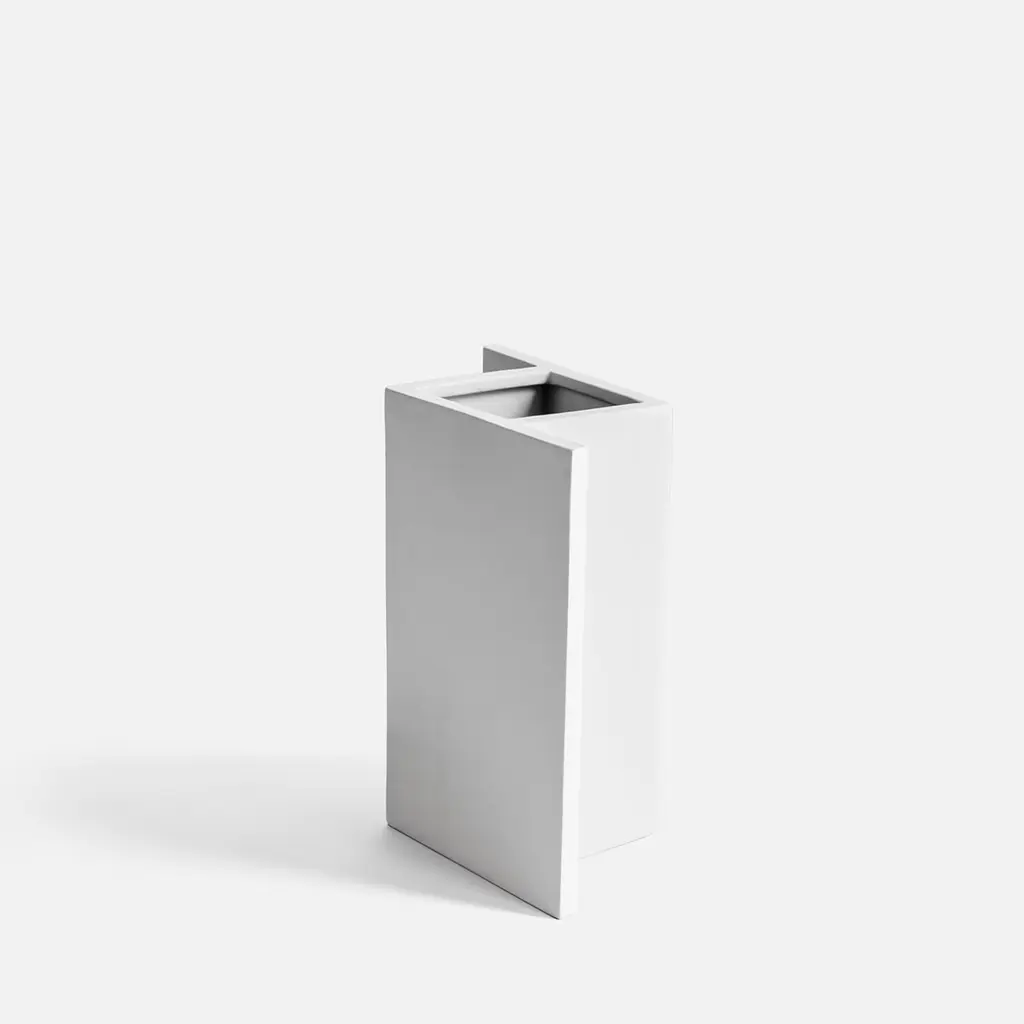 The Rook Vase from Sara Khamisi's Kish o Mat collection features a bold geometric form with a square base and intersecting planes, reflecting the strength of the rook chess piece. Handcrafted in Milan from slipcast ceramic, it has a smooth, matte white finish with unique imperfections. Its clean, modern design suits various interiors, adding sophistication and artistic flair. Inspired by Persian heritage, this piece blends cultural and contemporary aesthetics.