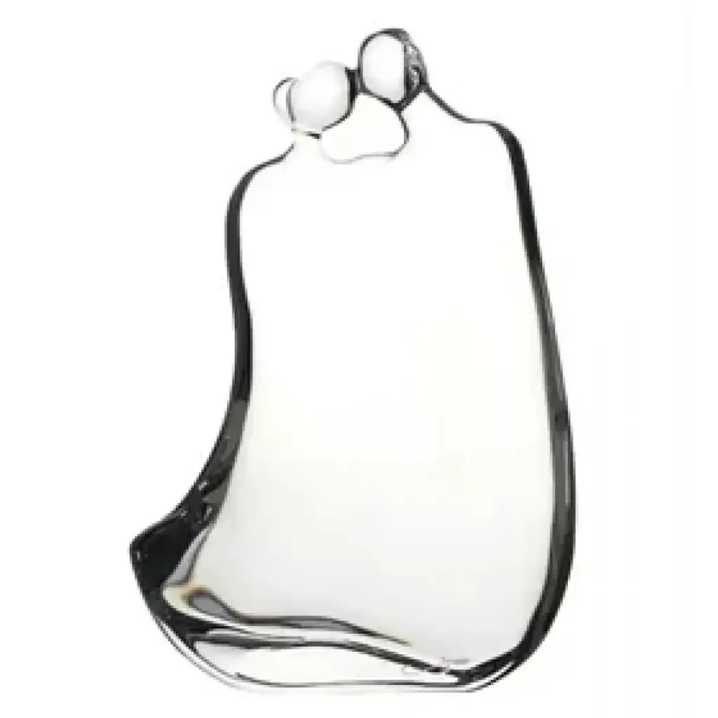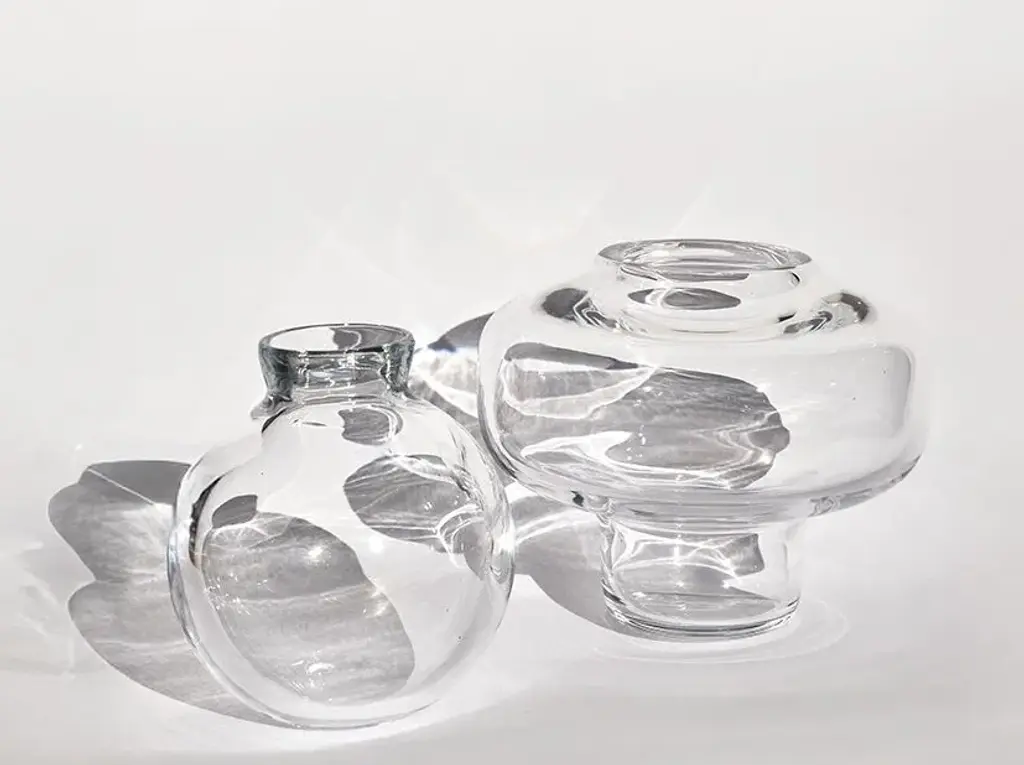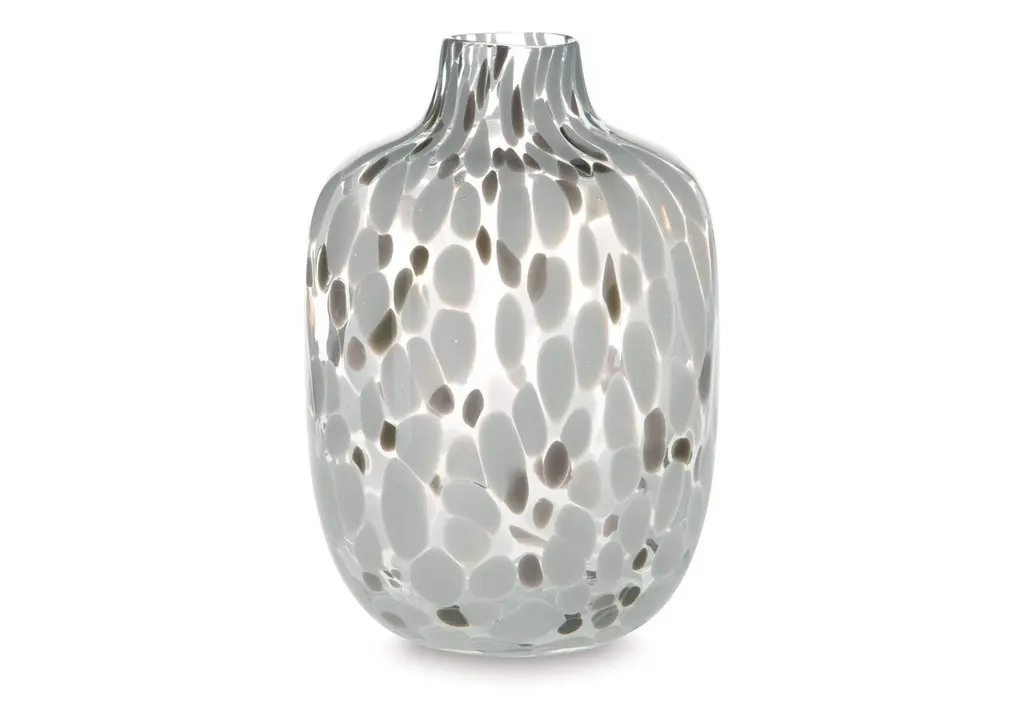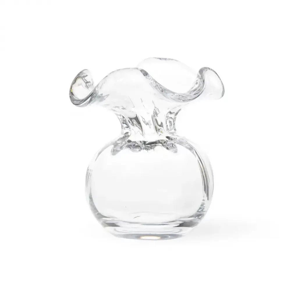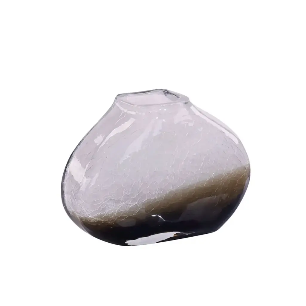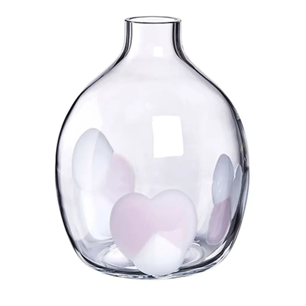 The Rose Bubble Vase is an elegant decorative accent that elevates a space through ethereal motifs and seductive curvature. Crafted from clear mouth-blown glass, the piece takes on a rounded shape with a slender profile. The center of the piece showcases a collection of overlapping bubbles with a subtle pink hue, complemented by the surrounding clear tones.