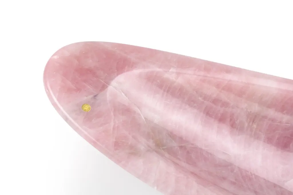 "Elegant and light, it seems to drift through the placid waters of the lagoon".Gondola, big elegant bowl, hand-sculpted from a solid block of Rose Quartz.Bowl dimensions: Extra Large L 65 x W 19 x H 11 cm. Also available: Small L 55 x W 12 x H 9.5 cm and Big L 65 x W 13 x H 11 cm.Available in different marbles, onyx and quartzite.100% handmade in Italy.Quartz is a natural material, every piece is unique as each quartz block is different in veins and color shades. All of our creations are handmade by Italian artisans and can slightly vary in shape and size. This is to be considered as a guarantee of a handmade object. All Pieruga objects are made of precious and natural marbles and onyx. Marble is sensitive to acid-based liquids, especially a prolonged contact with substances such as wine, lemon, vinegar, fruit juices, cola and alcohol can stain the surface.Cleaning should be carried out with a soft sponge, water and neutral detergent. Do not use metallic or abrasive sponges, do not wash in the dishwasher, do not use in the microwave. The color of the marble after washing can undergo variations due to the humidity trapped in the surface’s micro-pores. Once fully dried it will regain its original color. The brass inlays tend to oxidize over time, to make them return to shine again use a soft cotton pad soaked in a solution of water and traditional Marseille soap, gently rub over the brass inserts and rinse the surface thoroughly. We are against the use of chemical products, all Pieruga objects are processed and polished through long manual processes without the use of polishing liquids.Pieruga proudly creates elegant accessories and complements in marble through artisanal processes, bringing into dialogue ancient techniques of sculpture with advanced technologies. 100% handmade in Italy.Our Mission is a clear Signal of opposition to the enormous waste that occurs in the extraction and processing of large blocks of marble, tons of material are discarded and thrown, in disfigurement to the generosity of our mountains.Rediscovering the ancient art of manual sculpture we give new life to even the smallest fragment of marble, bringing to light its millenary beauty that is lost in more than 2000 years of architecture and sculpture.Pieruga marble is a new brand by Barberini & Gunnell.The Atelier Barberini & Gunnell was founded by the architects and designers Francesco Barberini and Nina A. Gunnell The artworks by Barberini & Gunnell are regularly shown at international art fairs, such as PAD London, PAD Genève, PAD Monaco, Salon Art and Design New York, Art Miami.IMPORTANT INFORMATION REGARDING SHIPPING:We carefully pack all artworks in strong wooden crates to ensure safe transport. This service is done directly in our atelier and is complimentary. All of our artworks travel with a shock watch system in order to monitorate rough handling by shippers and movers.