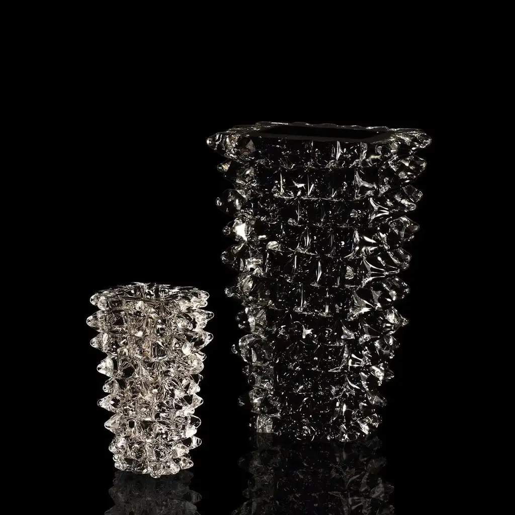 Showcasing one of the most recognizable style of Murano glasswork, the rostrato, this exquisite vase features a squared, inverted cone shape accented with an allover pattern of raised pyramid-shaped elements that was done entirely by hand, hot shaping every detail to infuse a unique and inimitable character to the piece. The relief decorations in crystal glass on the tall silhouette of the vase allow for the light to create dramatic reflections in the natural and artificial lights. Elegant and exclusive, this is the perfect gift for momentous occasions.