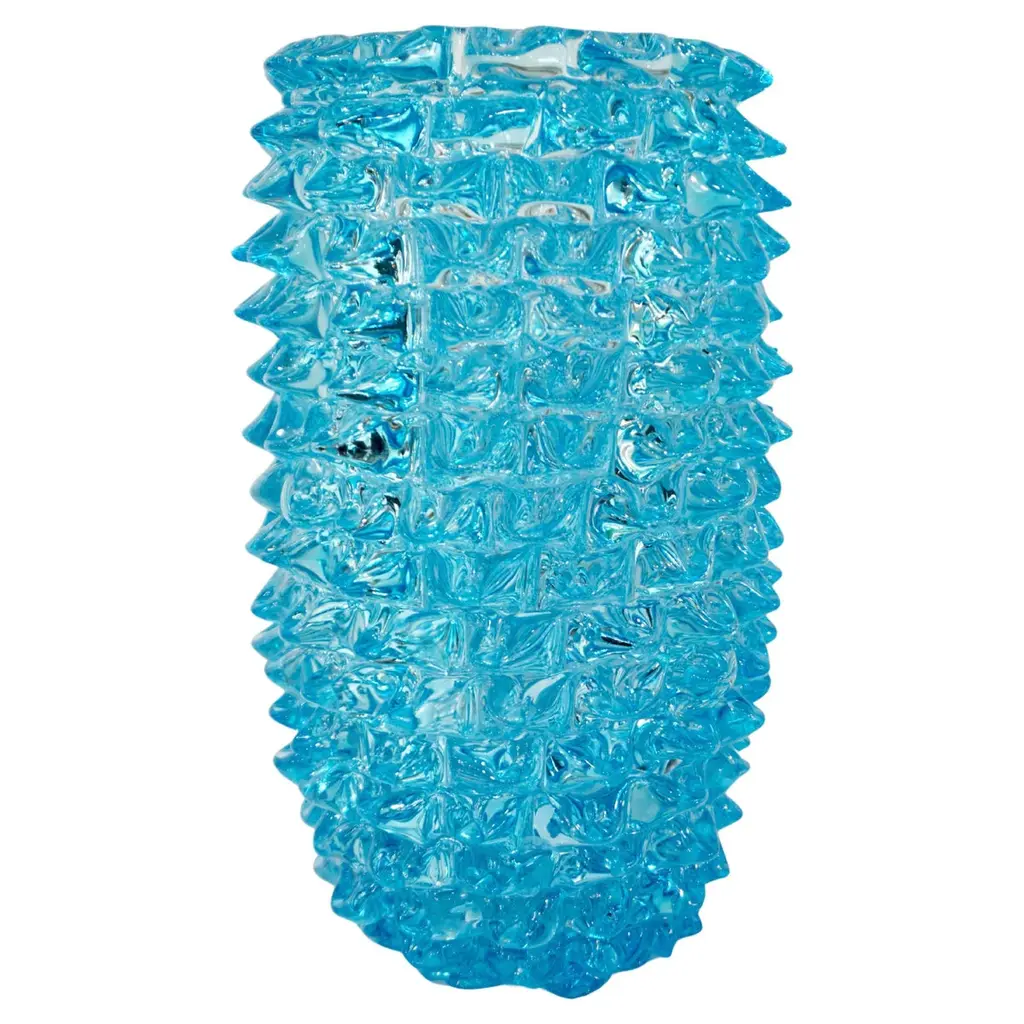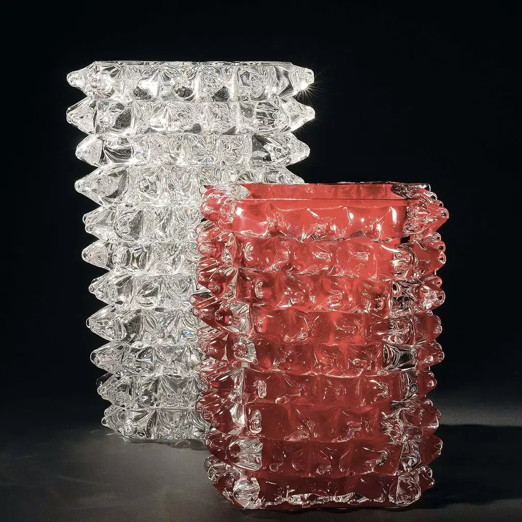 Superbly crafted by master glassmakers, this Murano glass vase features a relief pattern of hand-pulled, raised diamond-shaped points. Made using the ancient "rostrato" technique, the captivating reflections created by the red glass of the rectangular body and the crystal points reveal the timeless quality of this piece. Timeless and elegant, this vase can be given as a gift or included in a personal collection. Available also in black, tobacco brown and crystal.
