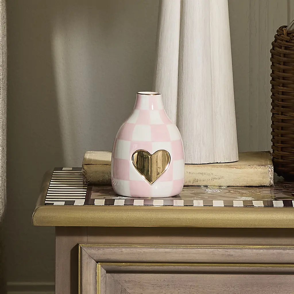 Give a sweet touch to your favorite florals with this Rosy Check Short Heart Vase. Crafted from ceramic and decorated with our blush-hued Rosy Check pattern and gold lustre, it makes a perfectly stylish gift or unique addition to your MacKenzie-Childs collection.