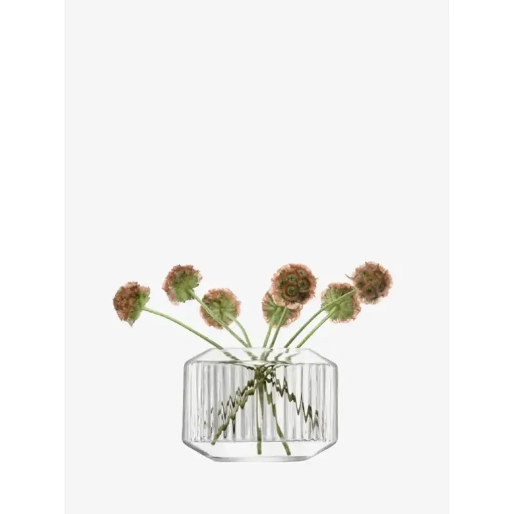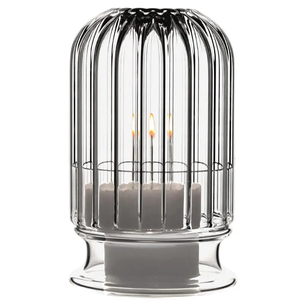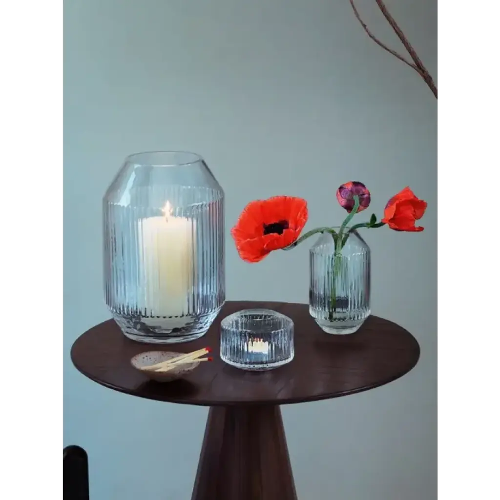 A mouth-blown glass tealight holder with angled walls and a band of corrugated texture. Inspired by architectural detail. Supplied with tealight candle.