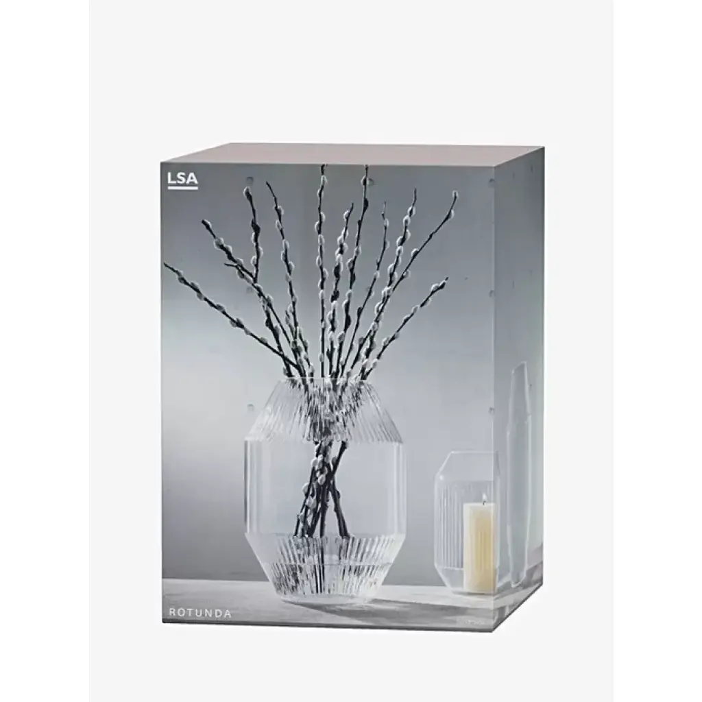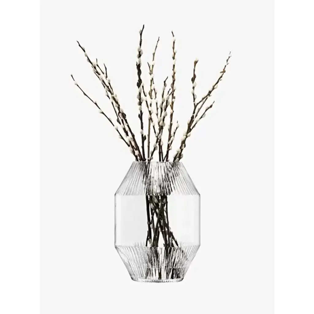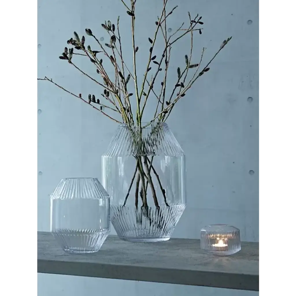 A large mouth-blown glass vase with bands of corrugated texture on the angled rim and base. Inspired by architectural detail. For branches or tall stems of flowers and foliage. Mouth-blown glass Low, angular shape with slanting rim and base Band of corrugated texture Inspired by architectural details