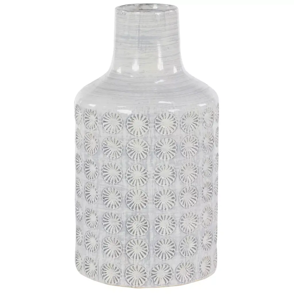 This white porcelain cylinder vase is ideal for country cottage, shabby chic, and coastal-themed living spaces. Designed with felt or rubber stoppers at the base that prevent scratching furniture and table tops, as well as sliding around. This item ships in 1 carton. This vase will be ideal with a neutral colorway display set. Suitable for indoor use only. This item ships fully assembled in one piece. This is a single gray colored vase. Coastal style. Vase has a 2.70 in mouth opening.