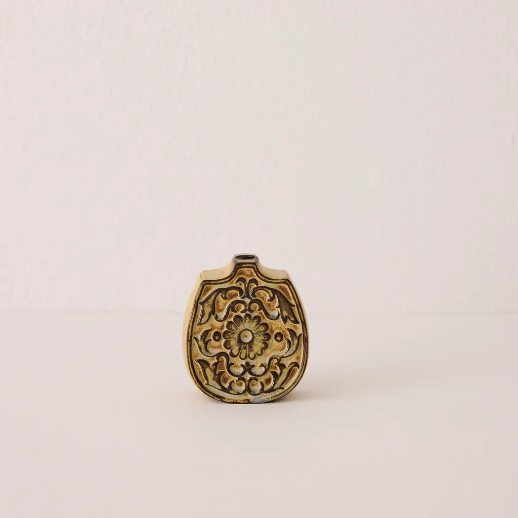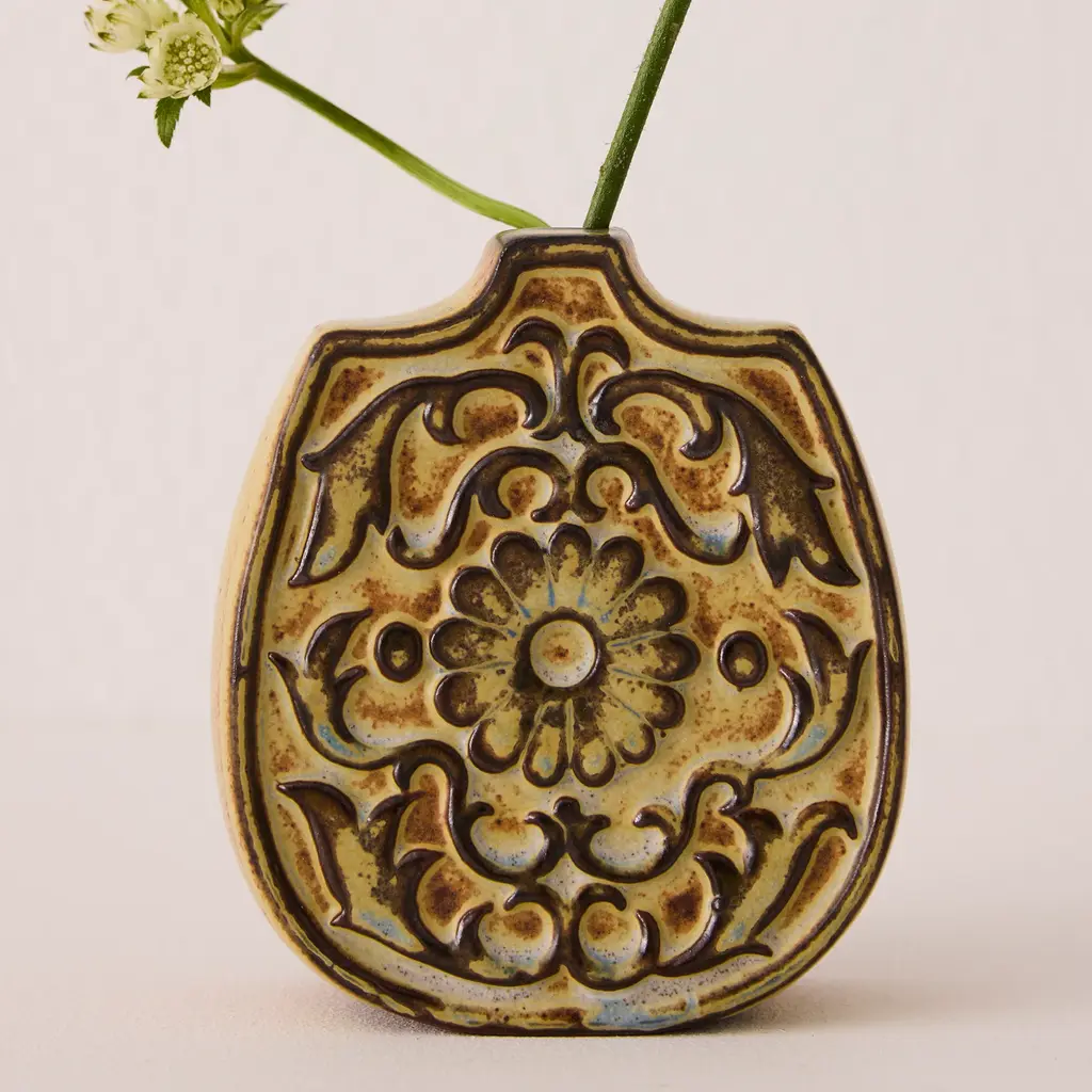 A small vase that feels like a treasure from another time — the Round Flower Vase by Kashiwa Craft carries the soul of traditional Japanese pottery, hand-formed from Seto’s signature red clay and adorned with intricate floral reliefs. The warm, earthy glaze connects you to the natural world and will develop even more character over time, making it a captivating piece, whether holding a single bloom or standing alone on a mantelpiece. A quiet nod to craftsmanship and heritage, it’s a timeless addition to any thoughtful space. * Due to the handmade nature of the product, variations in color, shape, size, thickness, weight, pattern, small black spots, paint skips, and unpainted pinholes may be observed. However, these differences do not affect the functionality of the product.