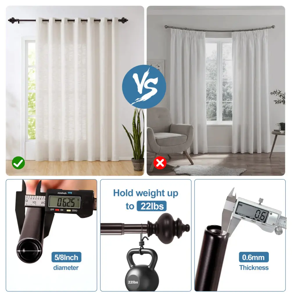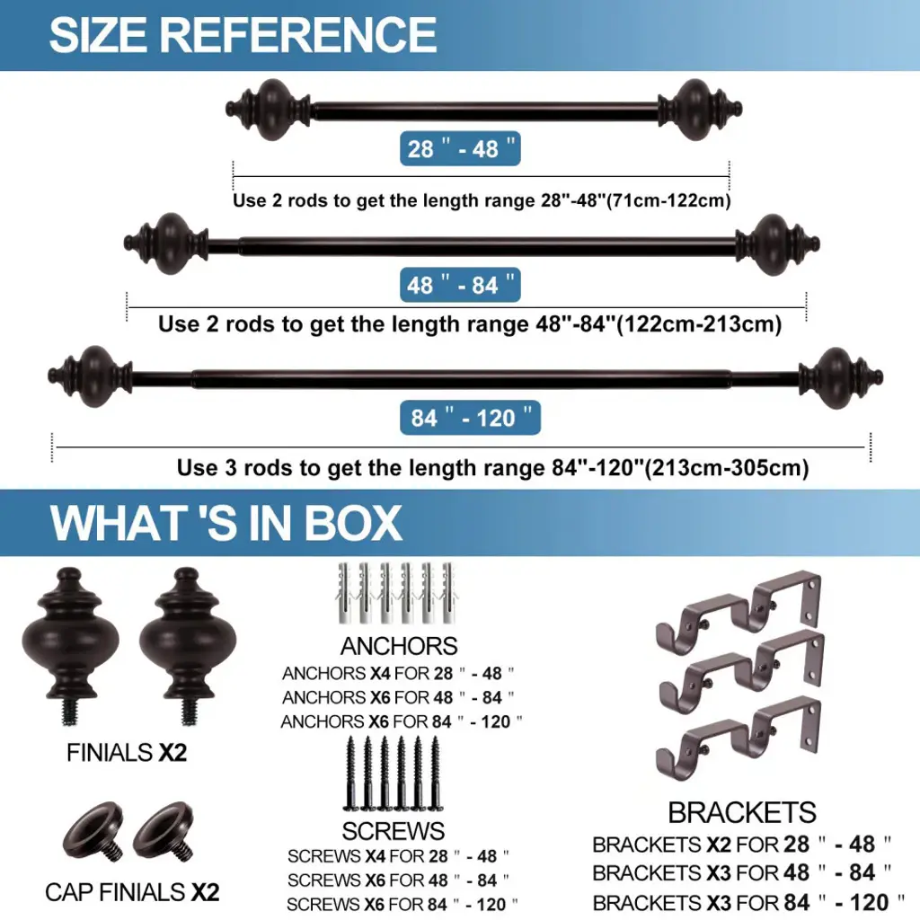 The rod set includes 2 rods, 2 sets of two finials, and double brackets in a bronze finishThe front adjustable curtain rod measures 5/8" diameter and comes with round urn shaped finials; the back adjustable curtain rod measures 1/2" diameter and comes with flat button shaped finials. Both rods extend from 84" to 120".Three matching double brackets included. All brackets measure 5" long, 2 1/2" to center of first bracket cup, and 5" to center of second bracket cup. 1 1/2" wall mount span.Available in 5 finishes: Black, Glossy White, Bronze, Pewter, and Antique GoldMounting hardware included for easy installation.