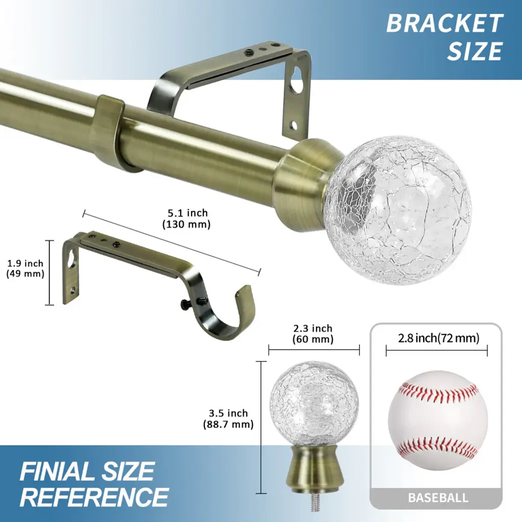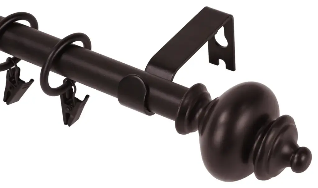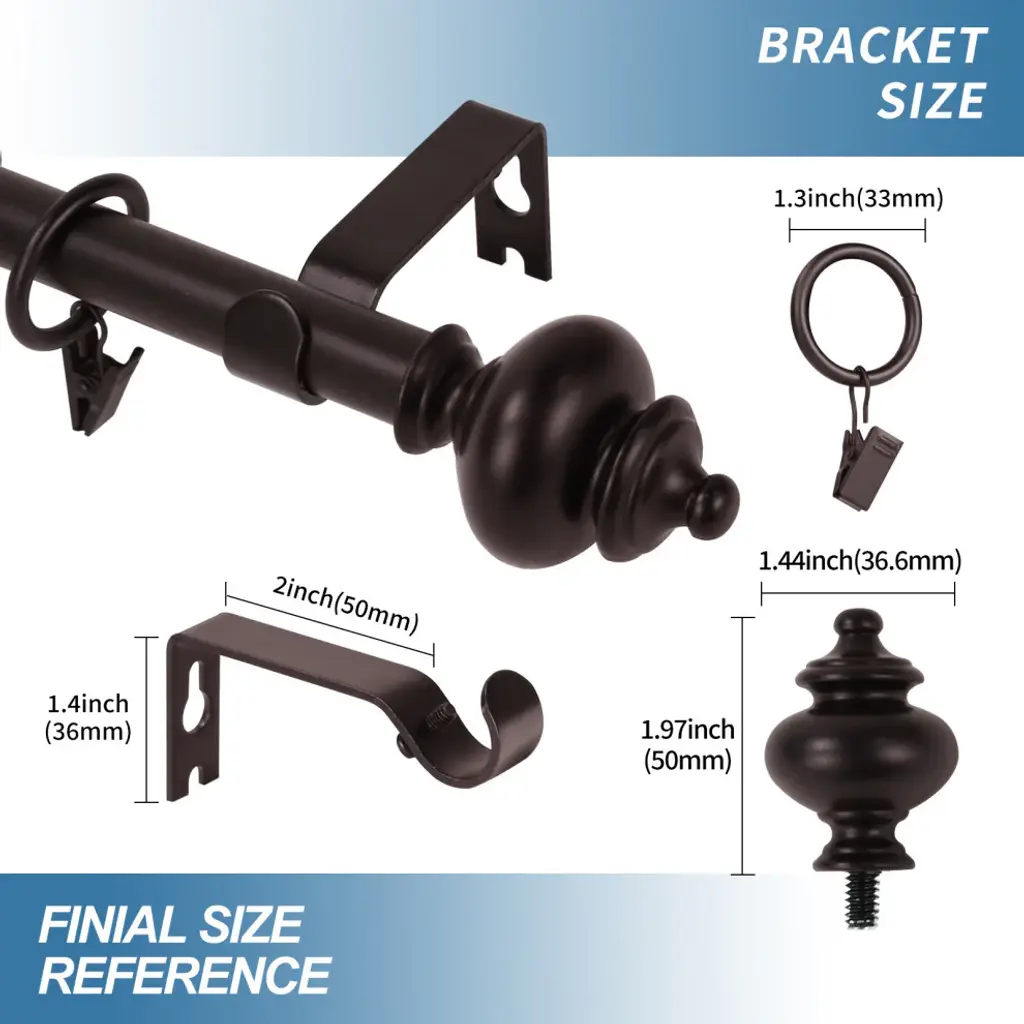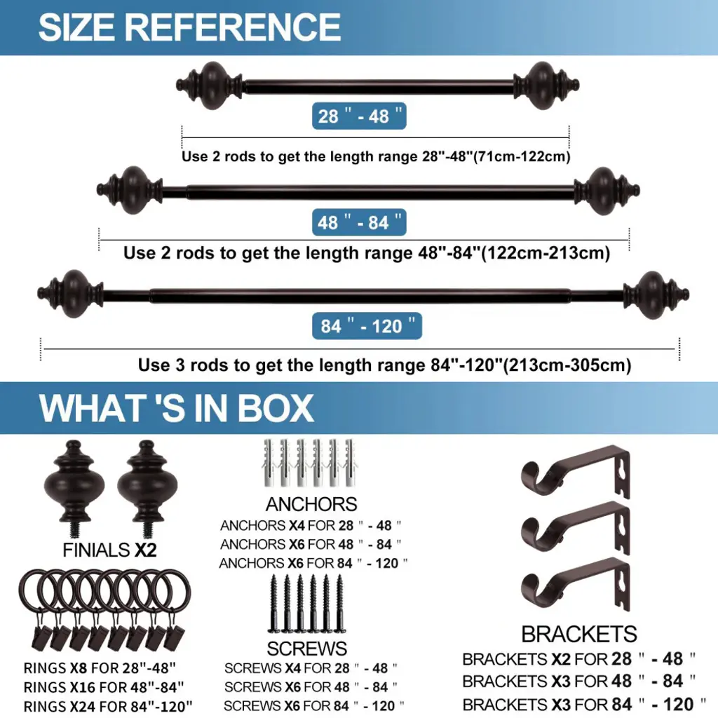 The rod set includes 1 rod, 1 set of two finials, matching curtain rings, and brackets in a bronze finish.The adjustable curtain rod measures 5/8" diameter and comes with round urn finials. The rod extends from 84" to 120".Three matching brackets included. All brackets measures 3" long, 2 1/2" to center bracket cup; 1 1/2" wall mount span. Includes 24 rings with clips and eyelets.Available in 5 finishes: Black, Glossy White, Bronze, Pewter, and Antique GoldMounting hardware included for easy installation.