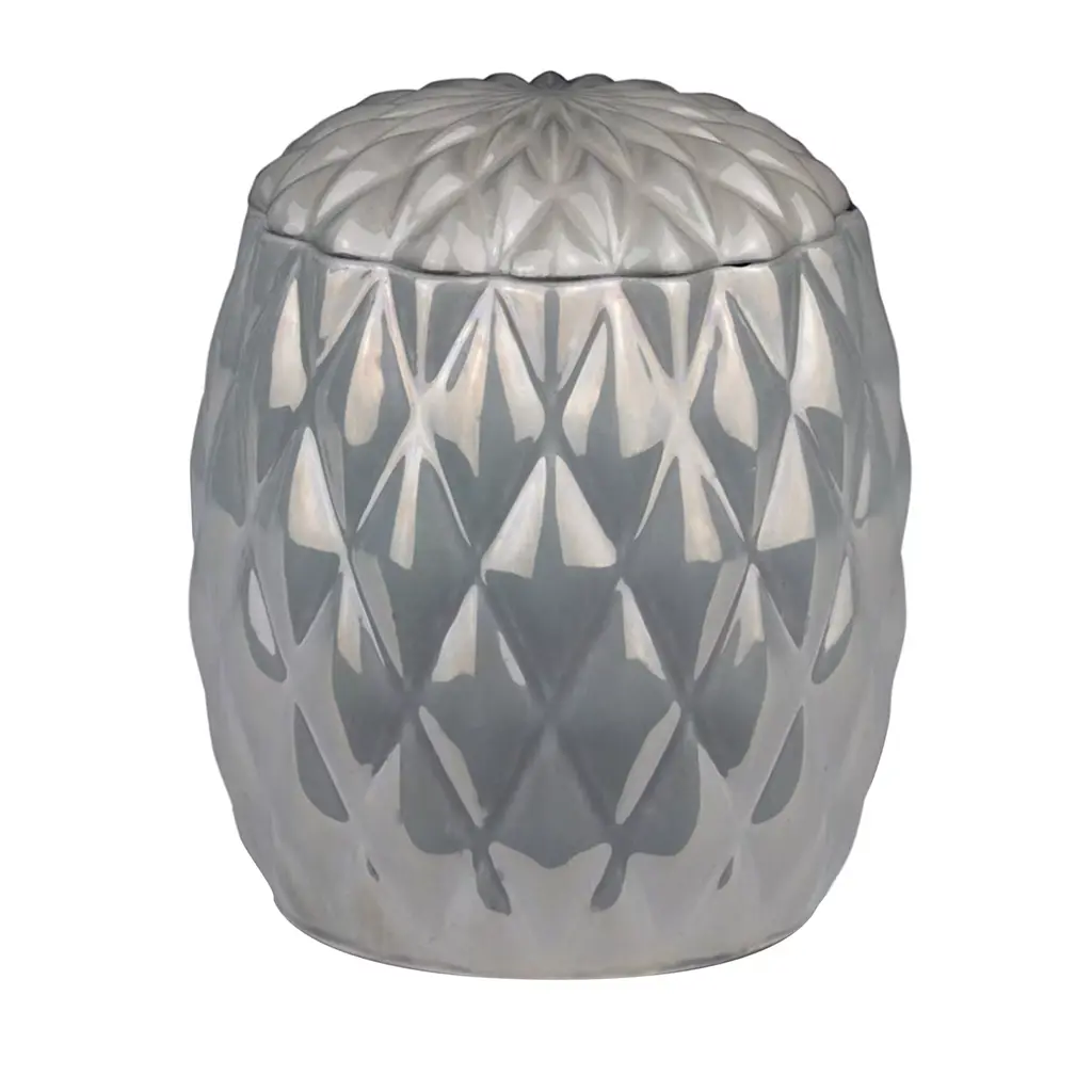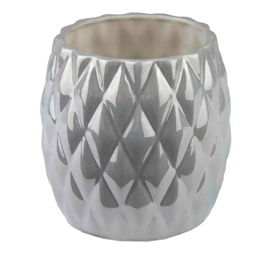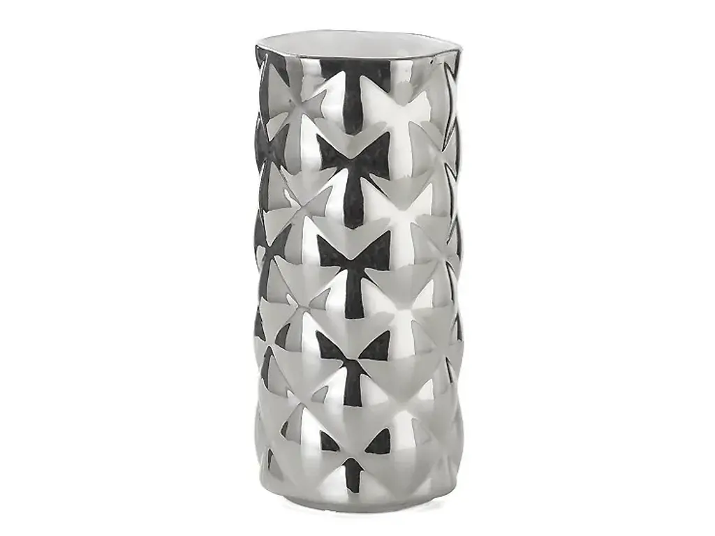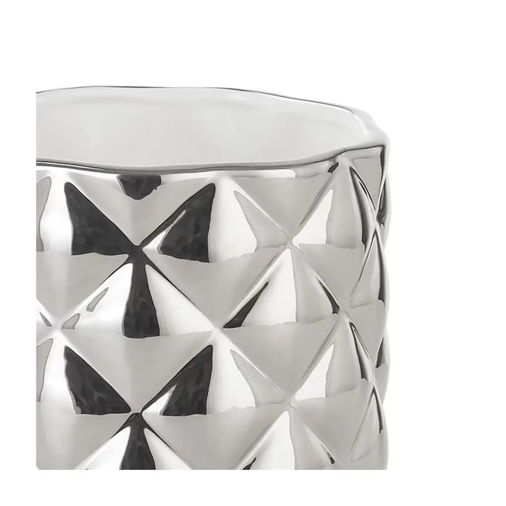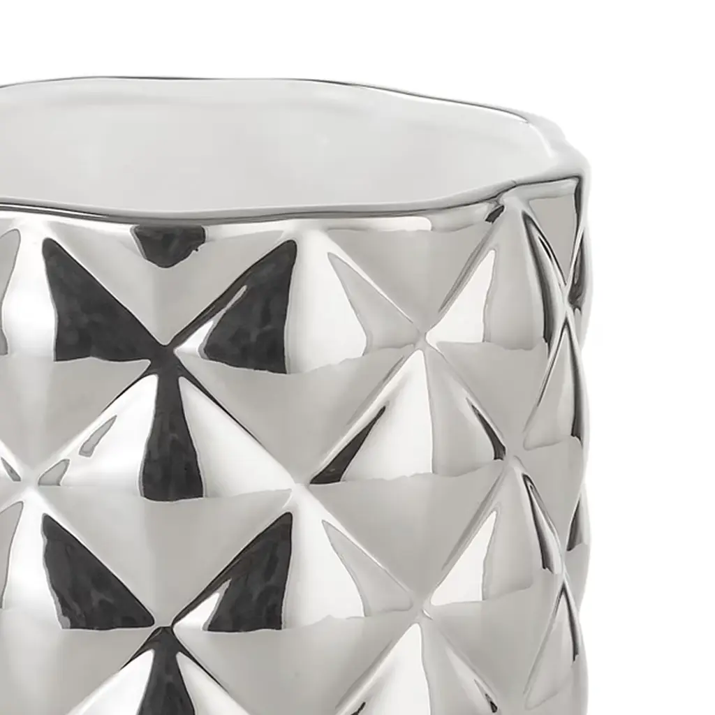 This exquisite vase is part of the Roxy collection and features a cylindrical shape perfect for displaying large floral arrangements. Entirely made of ceramics, the internal surface has a white varnish, while the glossy silver finish of the exterior complements the unique texture of the surface, featuring bulging diamond-shaped elements that create a dynamic effect. Either alone or paired with the Roxy Bowl, this piece will enliven any room in the house. Texture decorations and colors can be changed. Please ask the concierge.