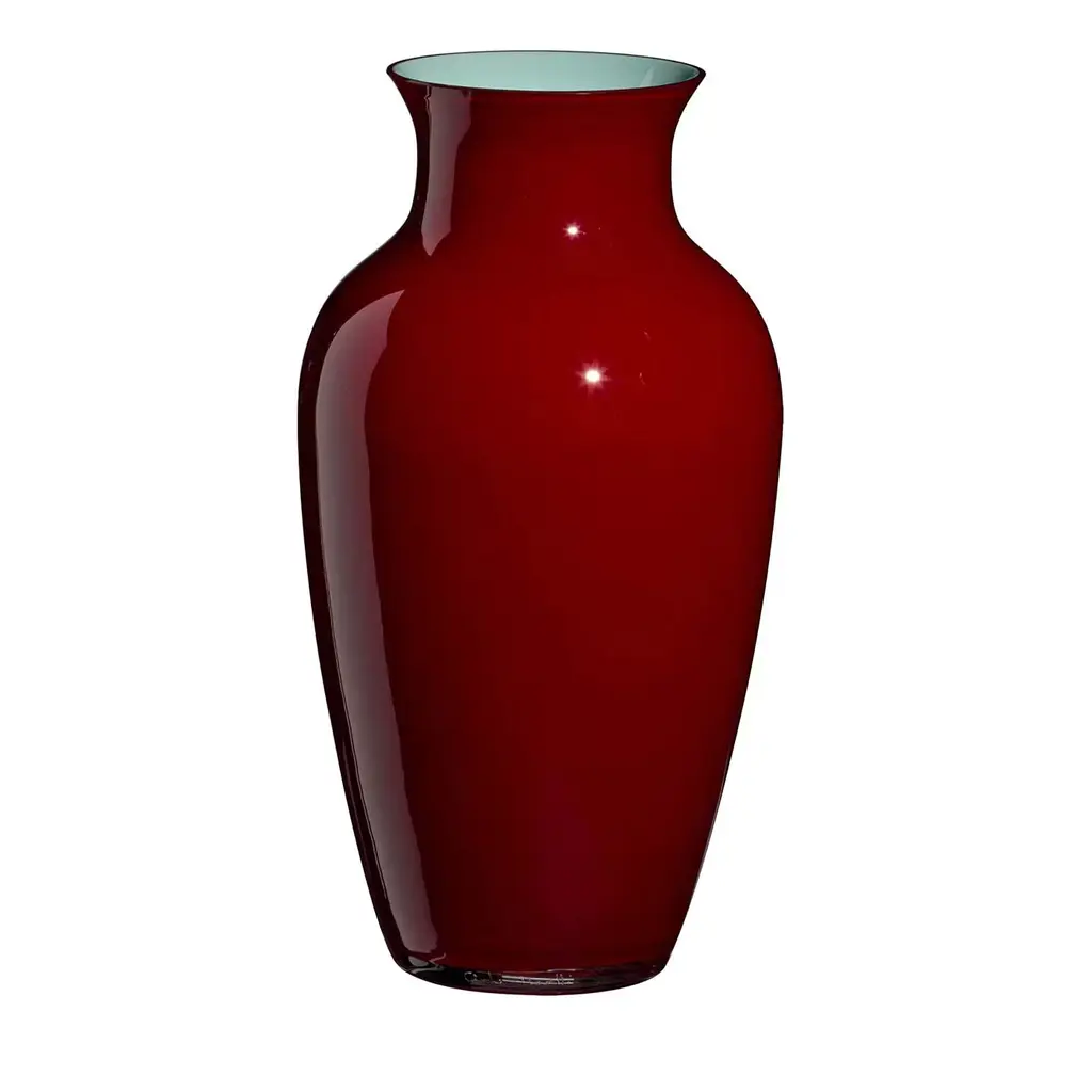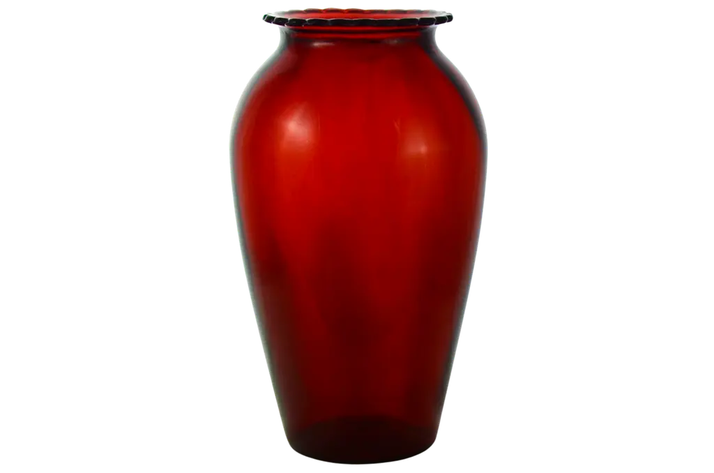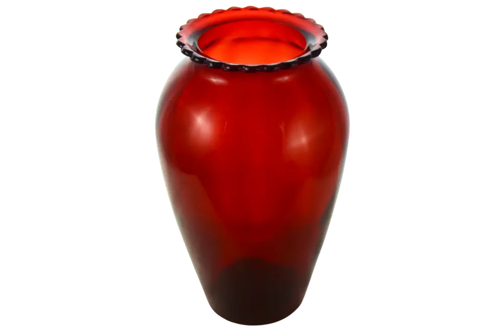 Tall nine inch vintage deep ruby red glass vase with a scallop rim. A lovely Valentine's Day bowl and a beautiful pop of red to your decor throughout the year! No maker's mark. Light wear.