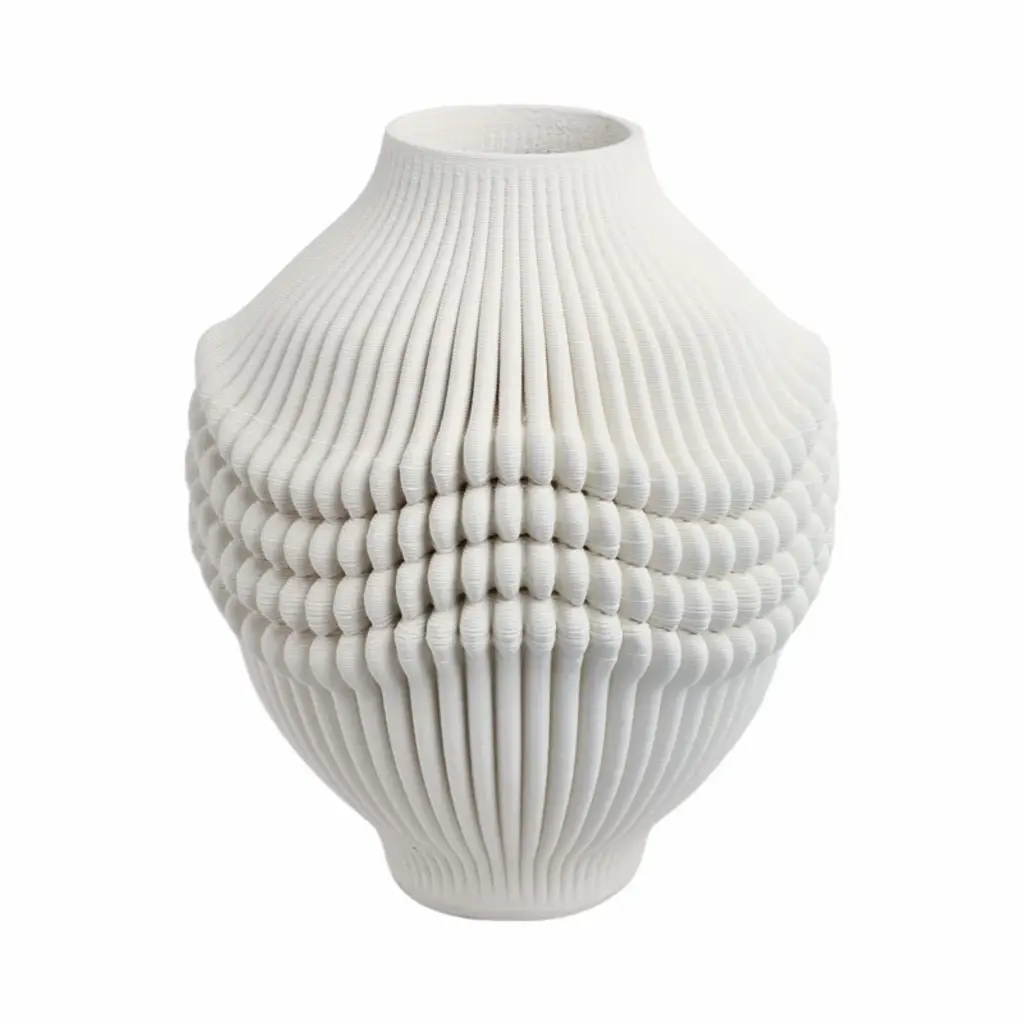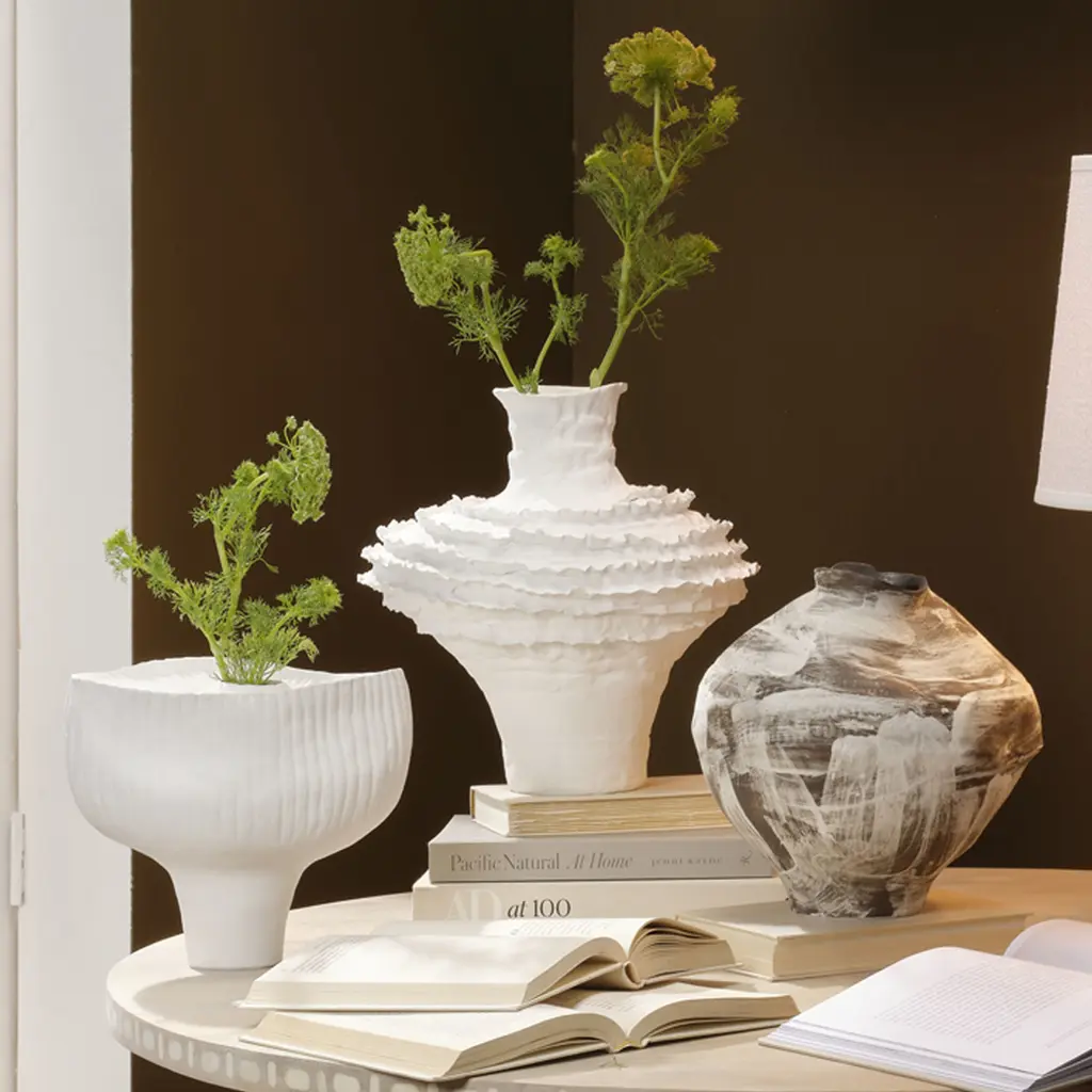 The lines of this evocative vase are open to interpretation. Do you see mounds of freshly whipped cream, a ruffly lace petticoat, or dramatic layers of clouds in an otherwise blue sky No matter how it speaks to you, each of these watertight vessels is expertly artisan crafted of matte white ceramic. Whether you choose to customize it with your favorite filler or simply display it, it is certain to delight your family and friends.
