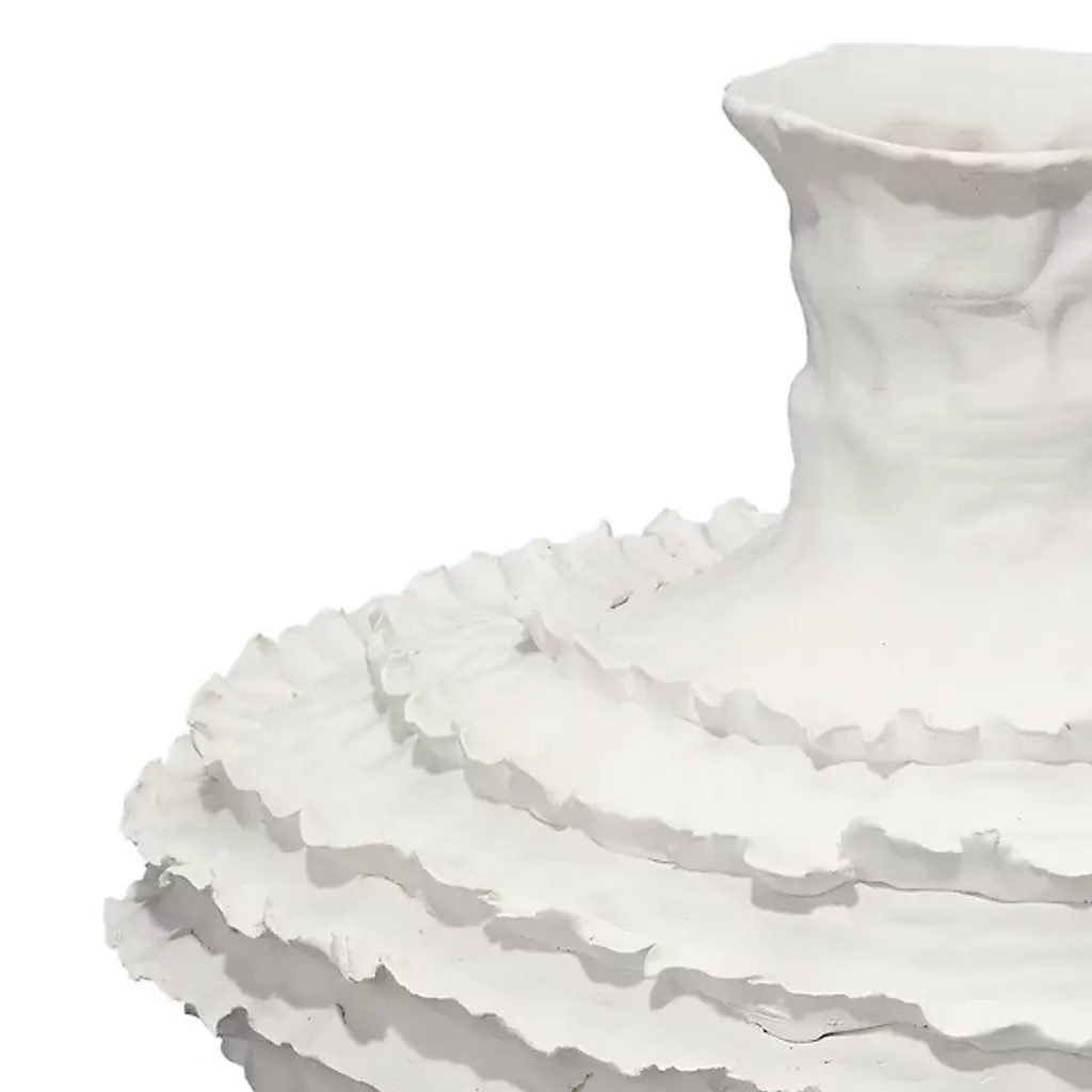 The Ruffle Vase from Jamie Young Co. demonstrates how ceramic can capture movement in solid form. Each tier of ruffles is individually crafted to create natural-looking layers that spiral around the vessel. As a water-tight container, it handles fresh flower arrangements effectively, with its distinctive shape providing good support for both traditional and modern floral designs. The vase’s proportions work well on various surfaces, from side tables to mantels, where its sculptural qualities can be fully appreciated. The handcrafted nature of each piece ensures subtle variations in the ruffle placement and overall form.